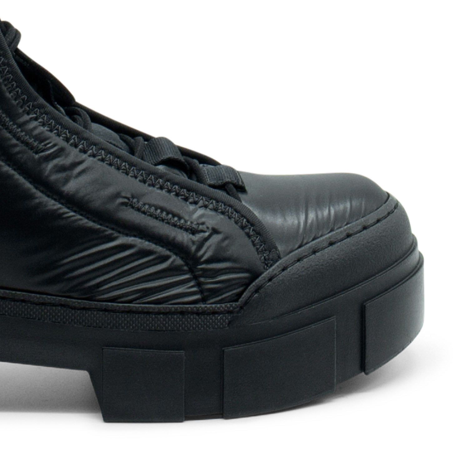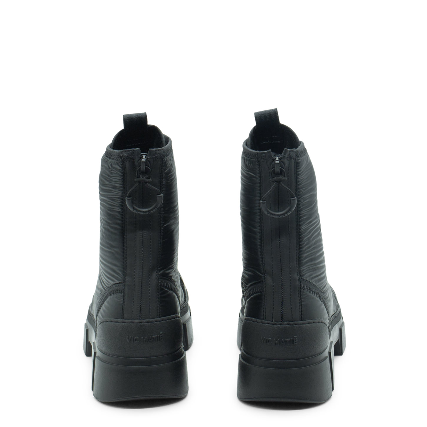 Vic Matié Roccia black combat boots, crafted from shiny padded nylon, with black binding and zigzag details. They feature adjustable elastic shoe laces with drawstring puller, same-colour grosgrain on the tongue and back zip for easier fit with branded rubber puller. This model is fitted with TPU shell sole with raised details and soft TAG footbed covered in calfskin. Made in Italy.