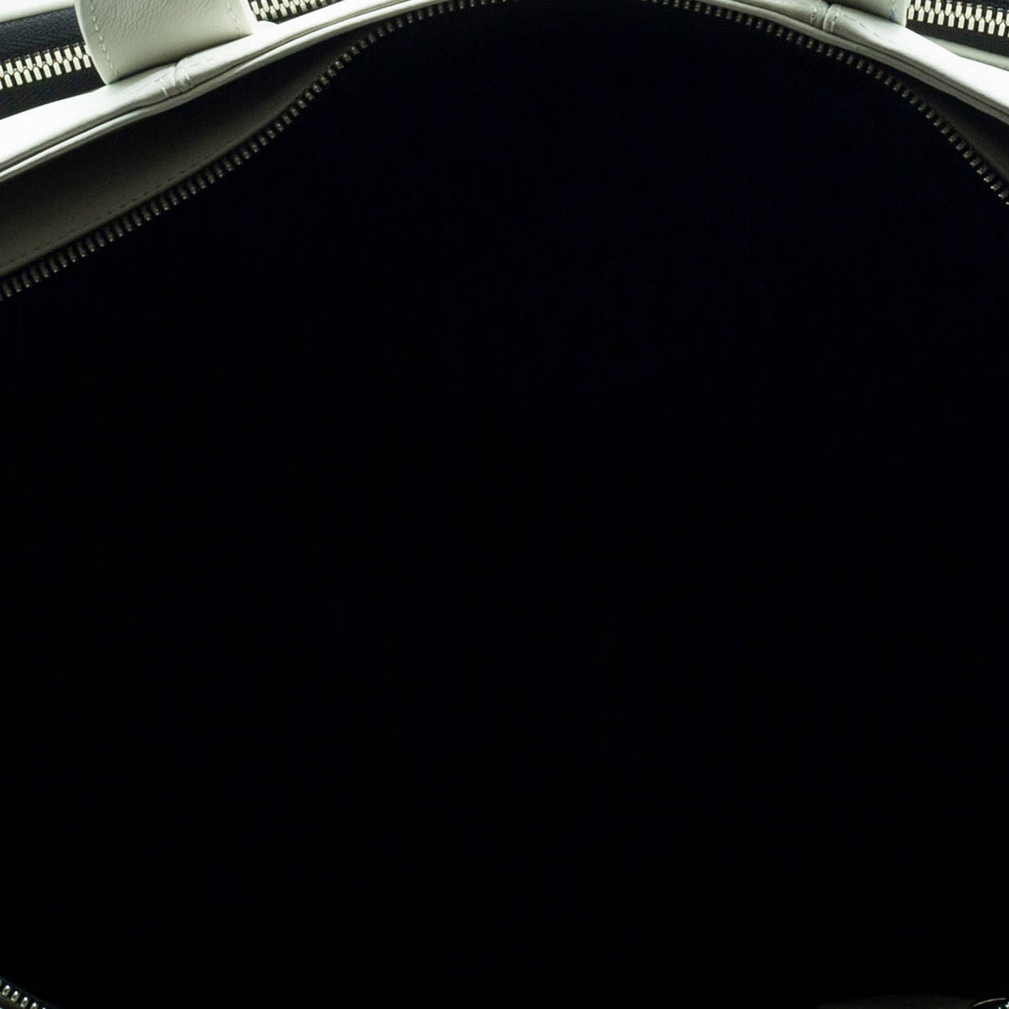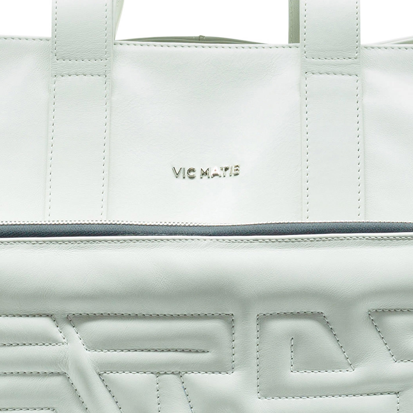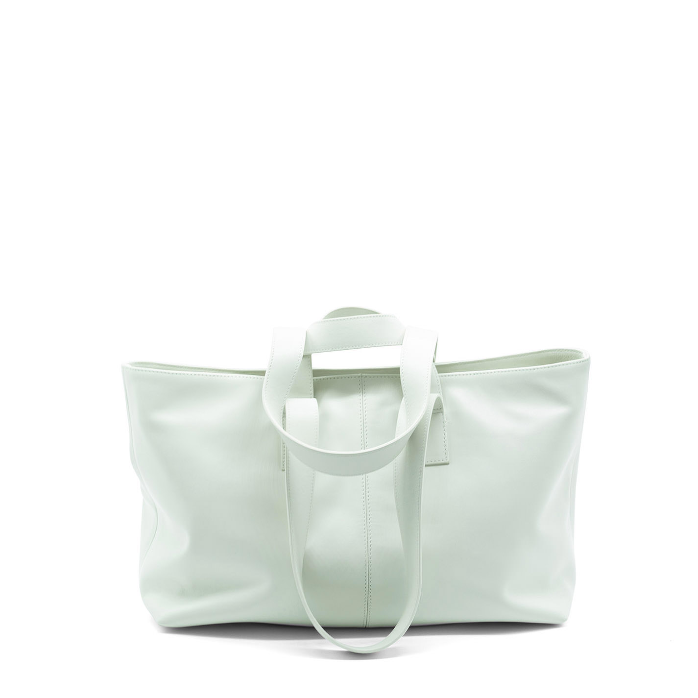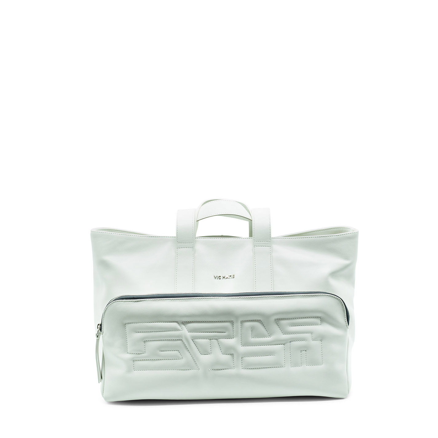 Ice handbag, crafted from smooth calfskin. It features an embroidered front pocket with metal zip, and double handles to use it as a hand bag or as a shoulder bag.