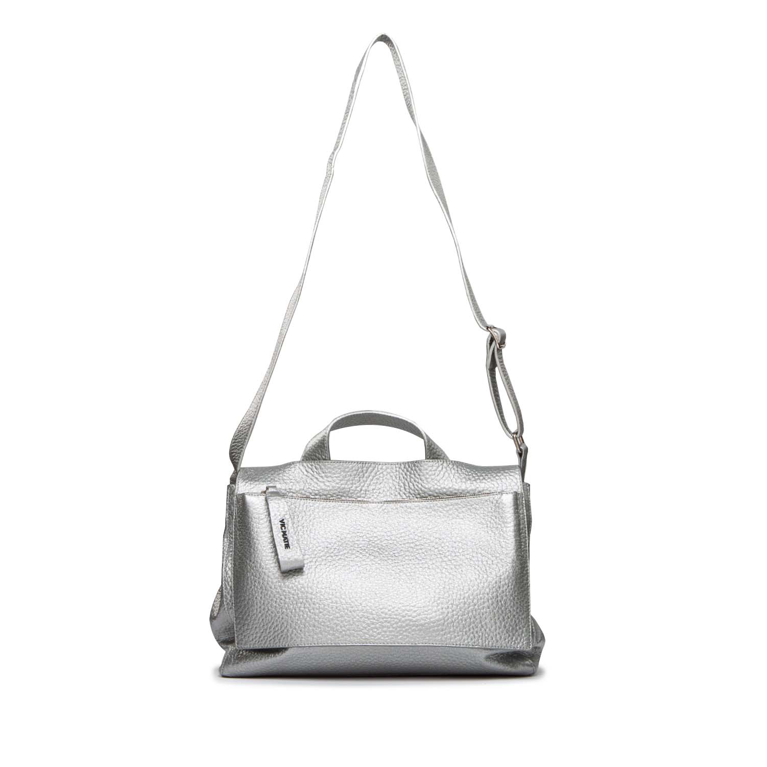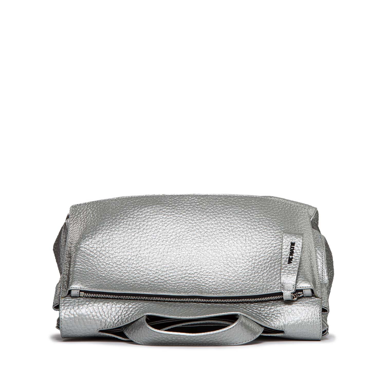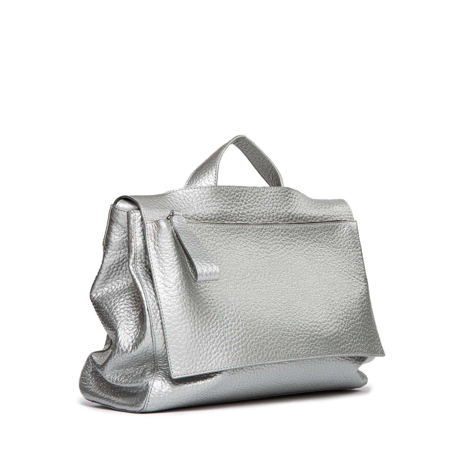 Midi silver bagmade of large grain calfskin, with double compartment and flap with zipped pocket where the handle comes out. Flap closure with hidden magnets, adjustable and detachable leather shoulder strap. Logoed key ring supplied.