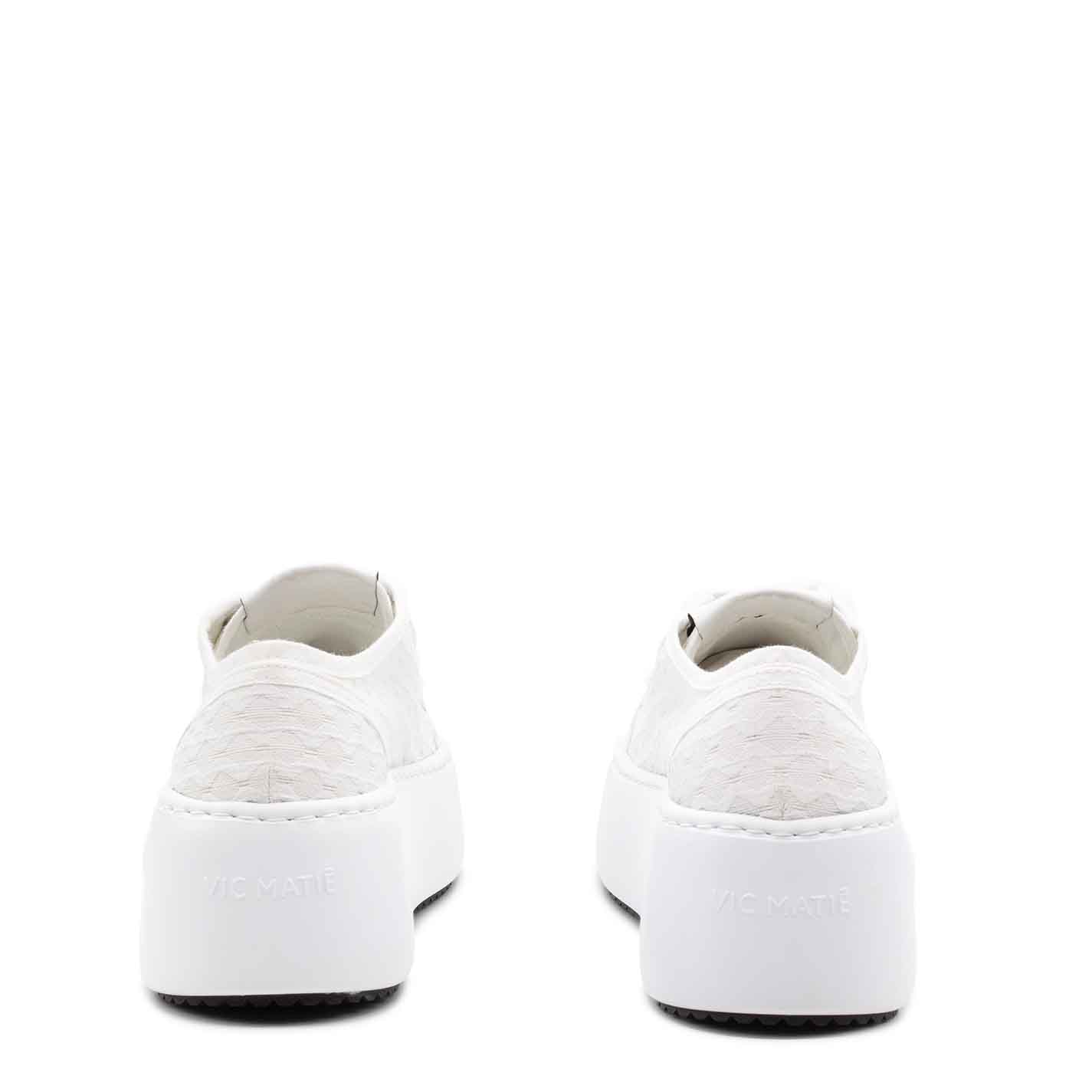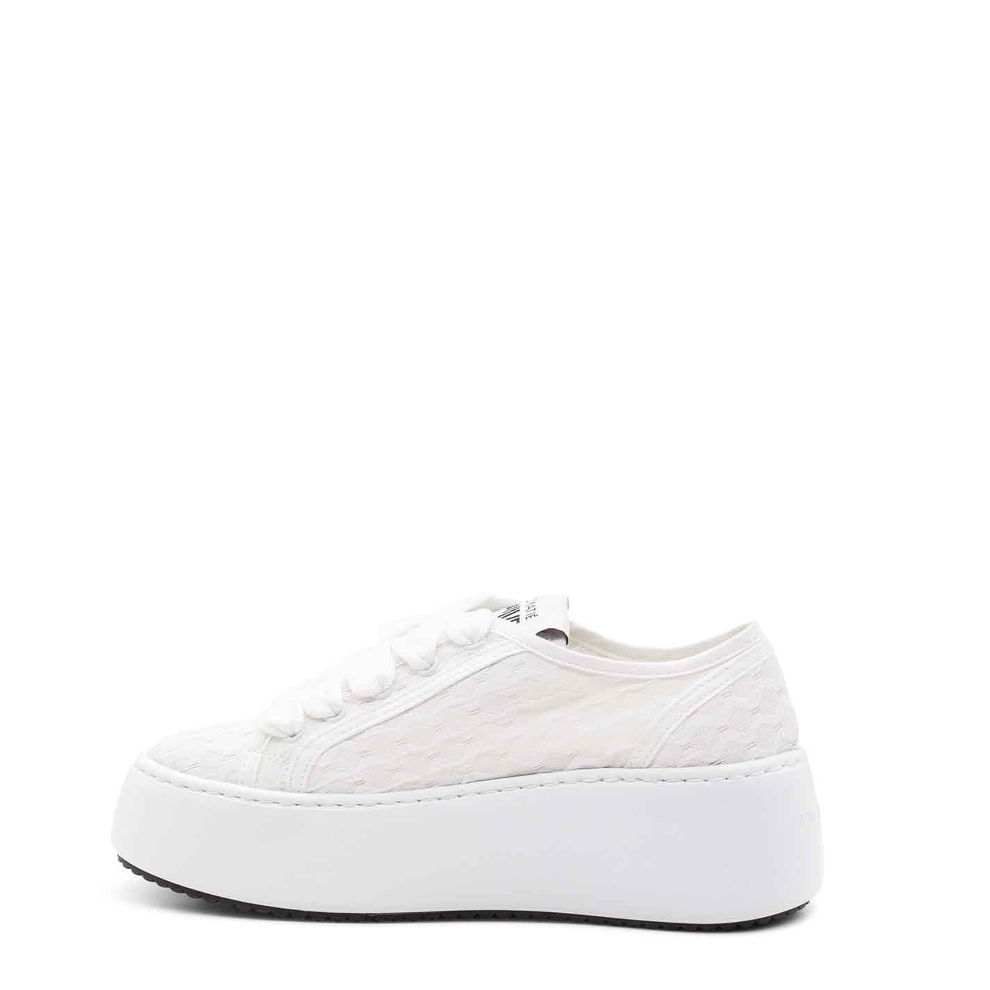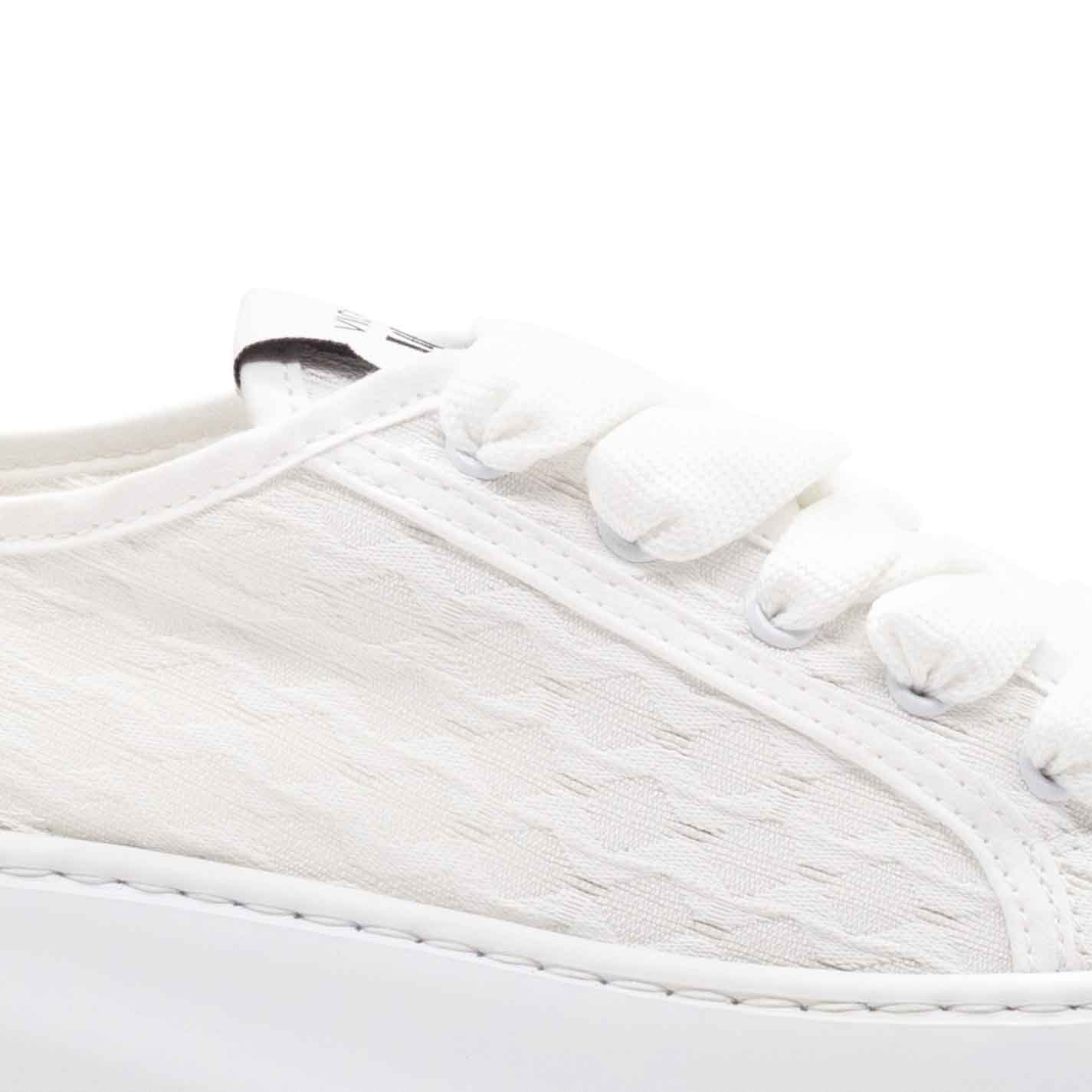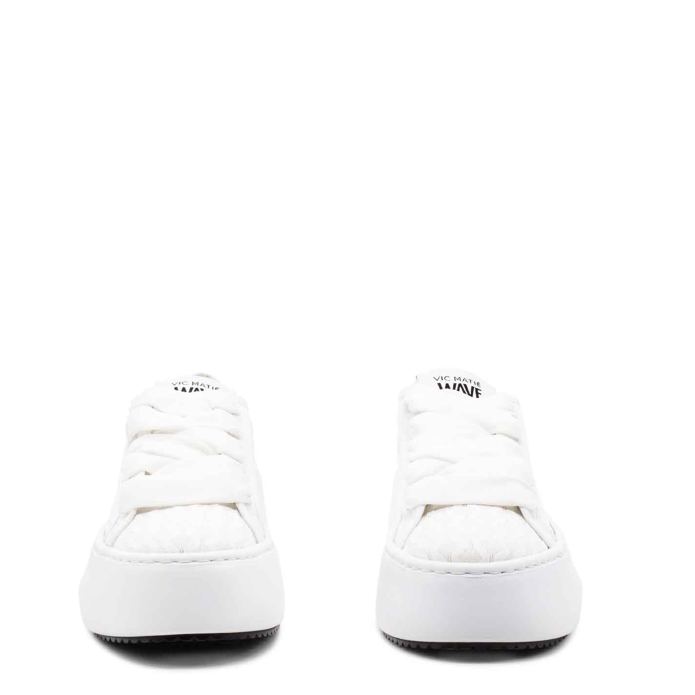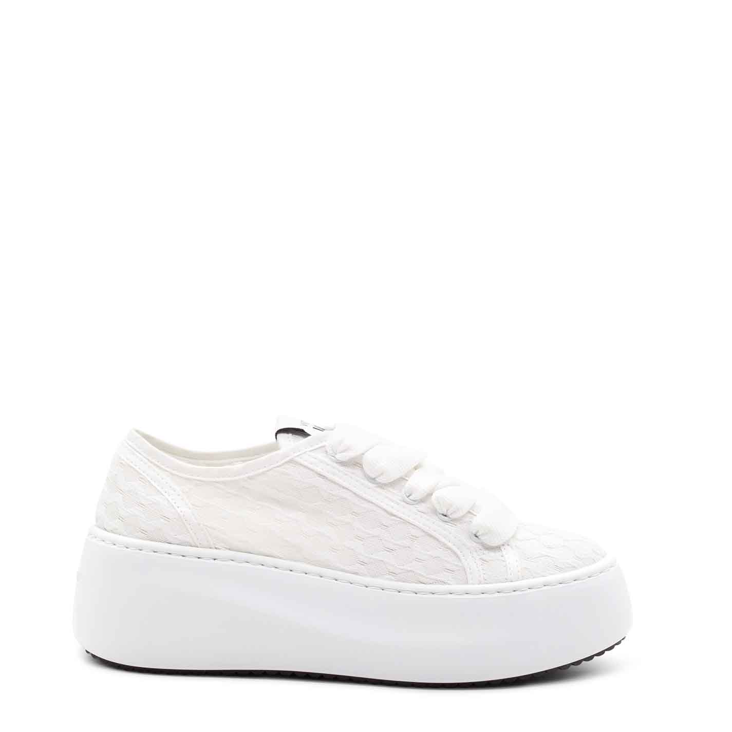 Wave white technical fabric shoes with rubbery feel, cotton edging and oversized laces. Futuristic rubber platform with slight angled effect on the outside, which provides comfort and gives the shoe a modern edge. Calfskin-covered insole. Made in Italy.
