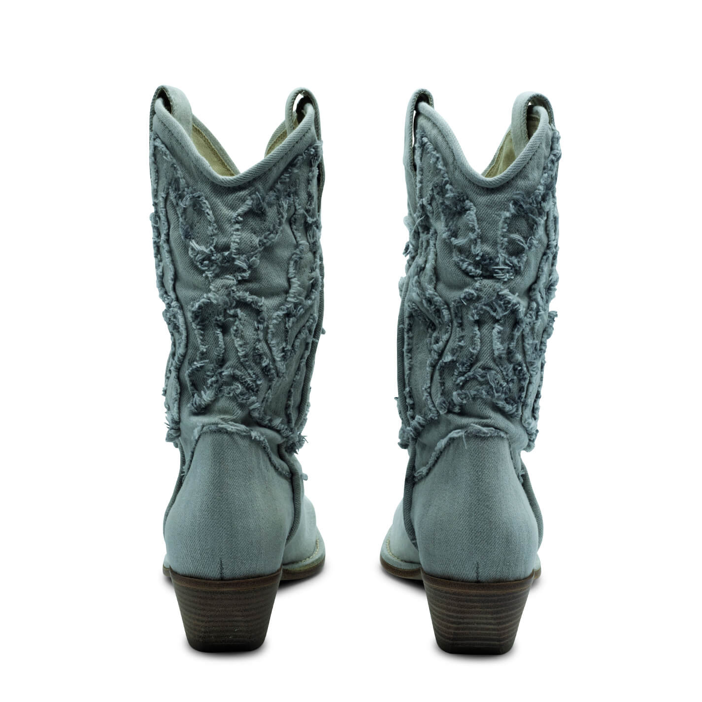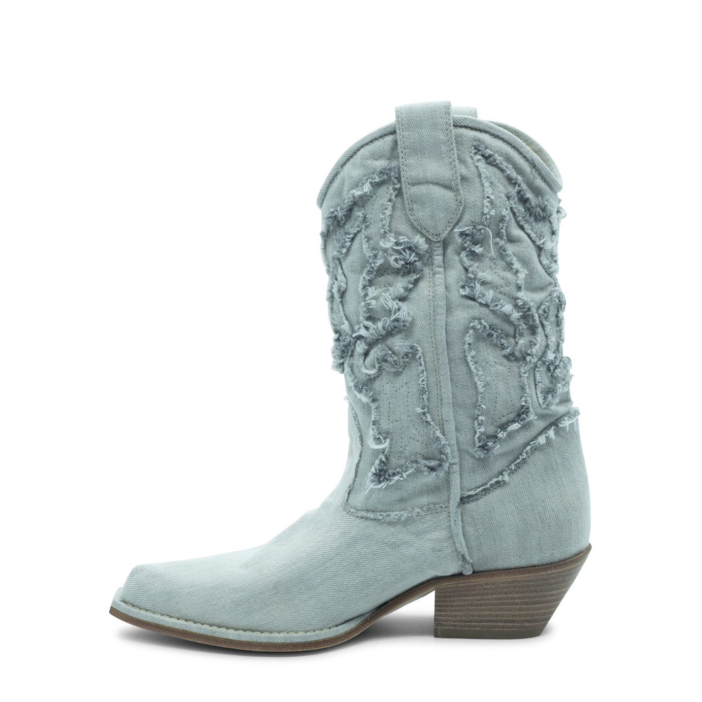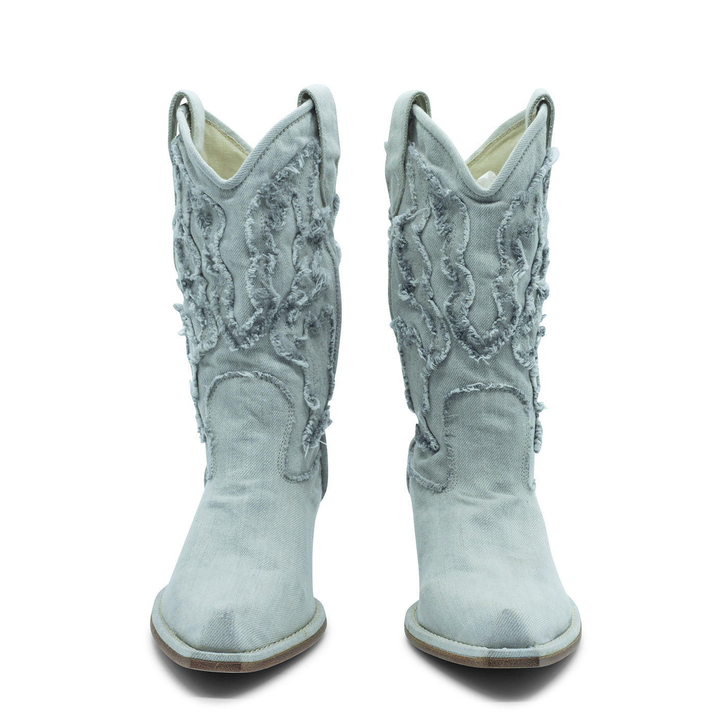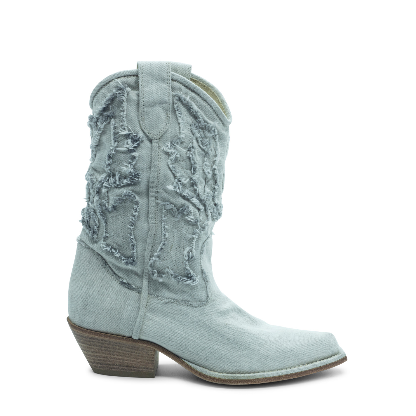 Westy fringed sand boot, made of stone wash denim, which gives the western embroidery the typical fraying of jeans;