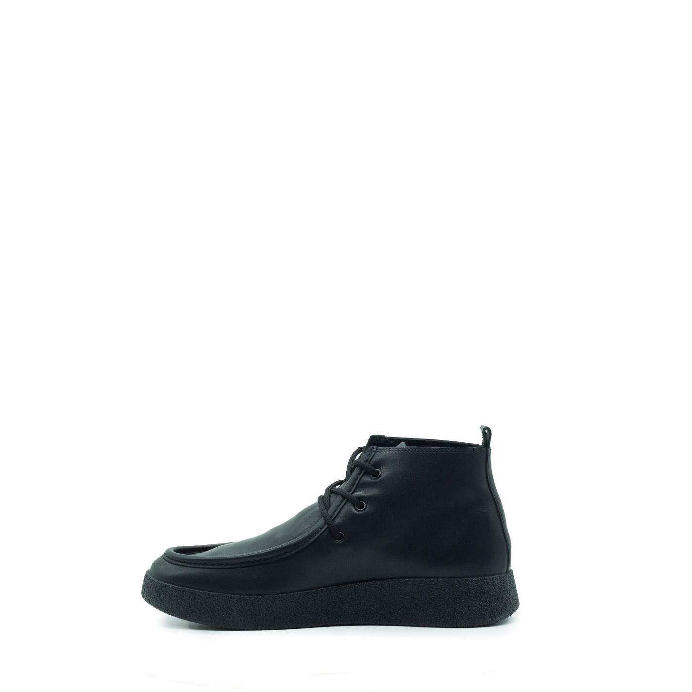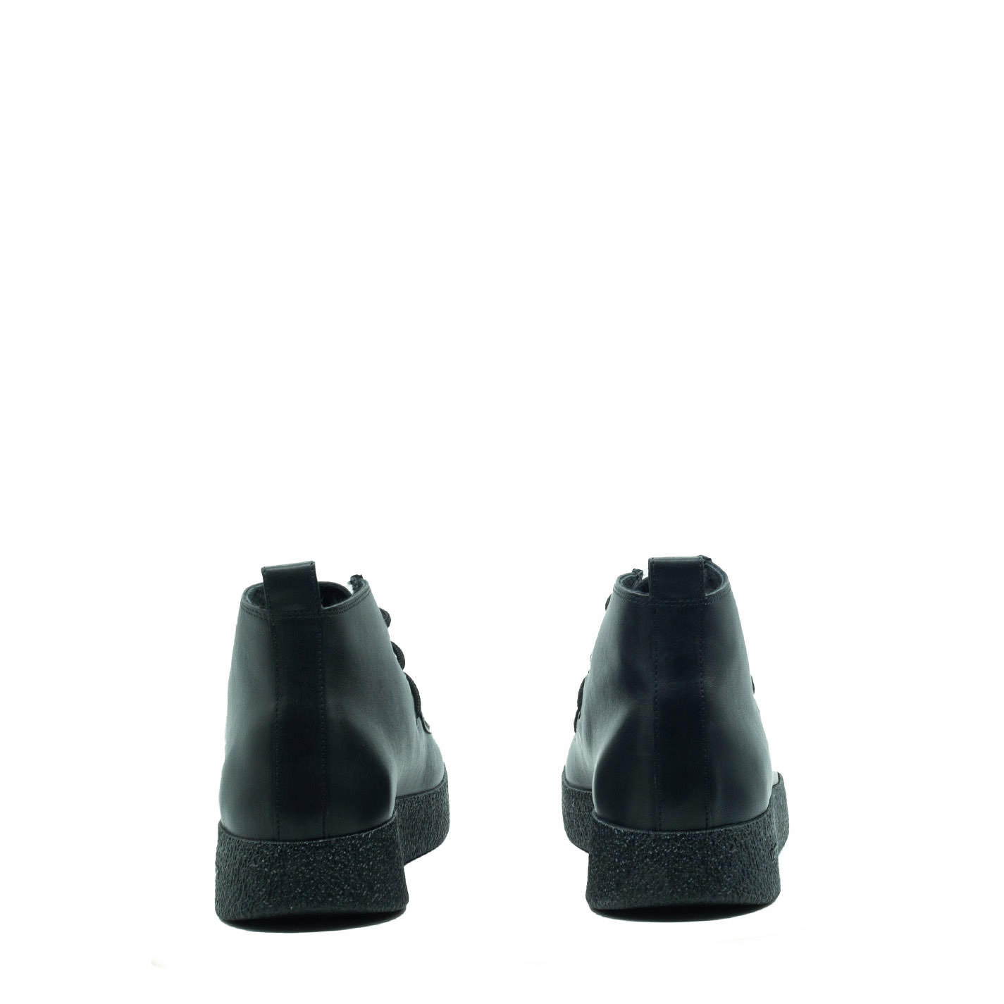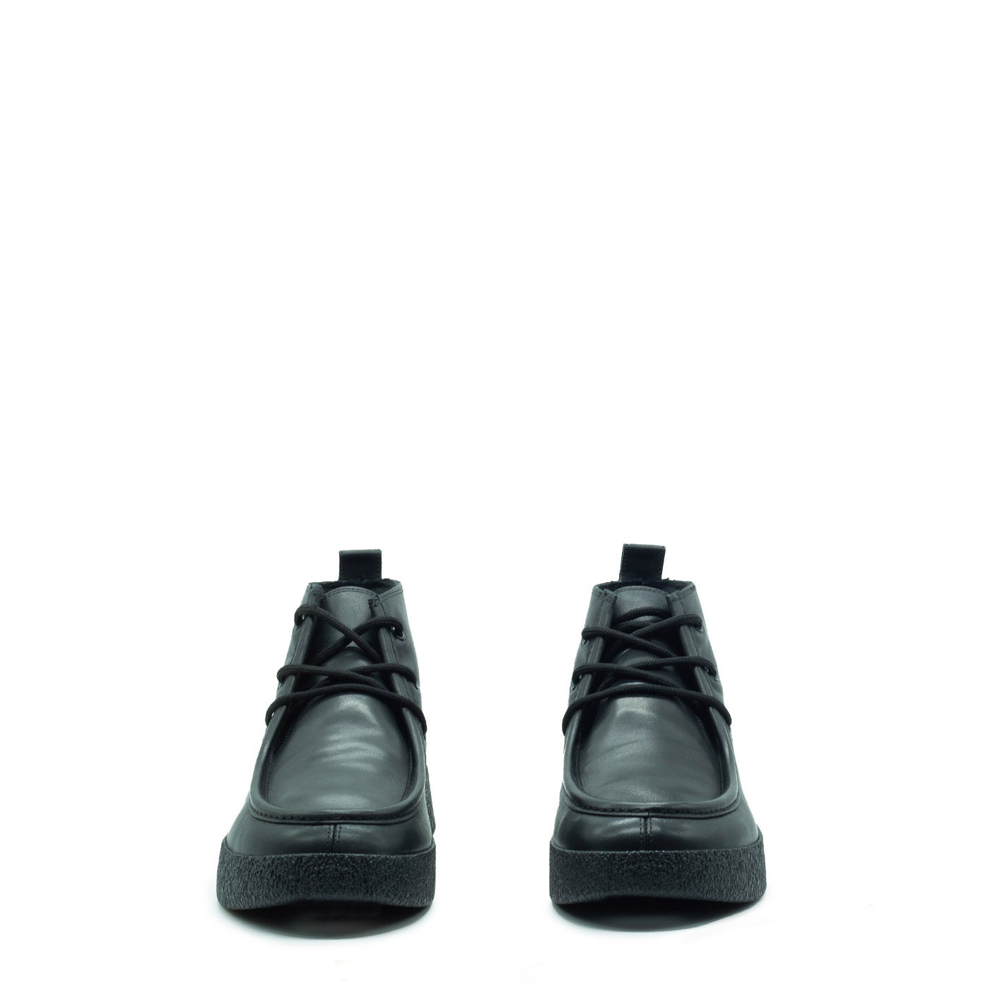 Whippy black matt Nappa calfskin ankle boots with sheepskin lining., with quarter leather piped plug and bellows tongue. This model features a lightweight crepe texture flexible rubber sole, and a flat footbed covered in fabric. Made in Italy.