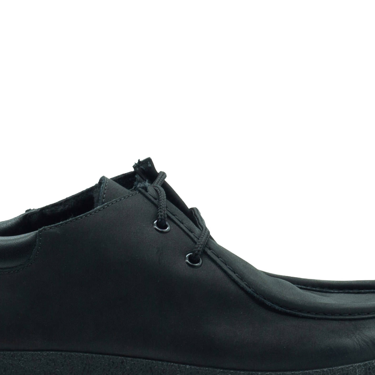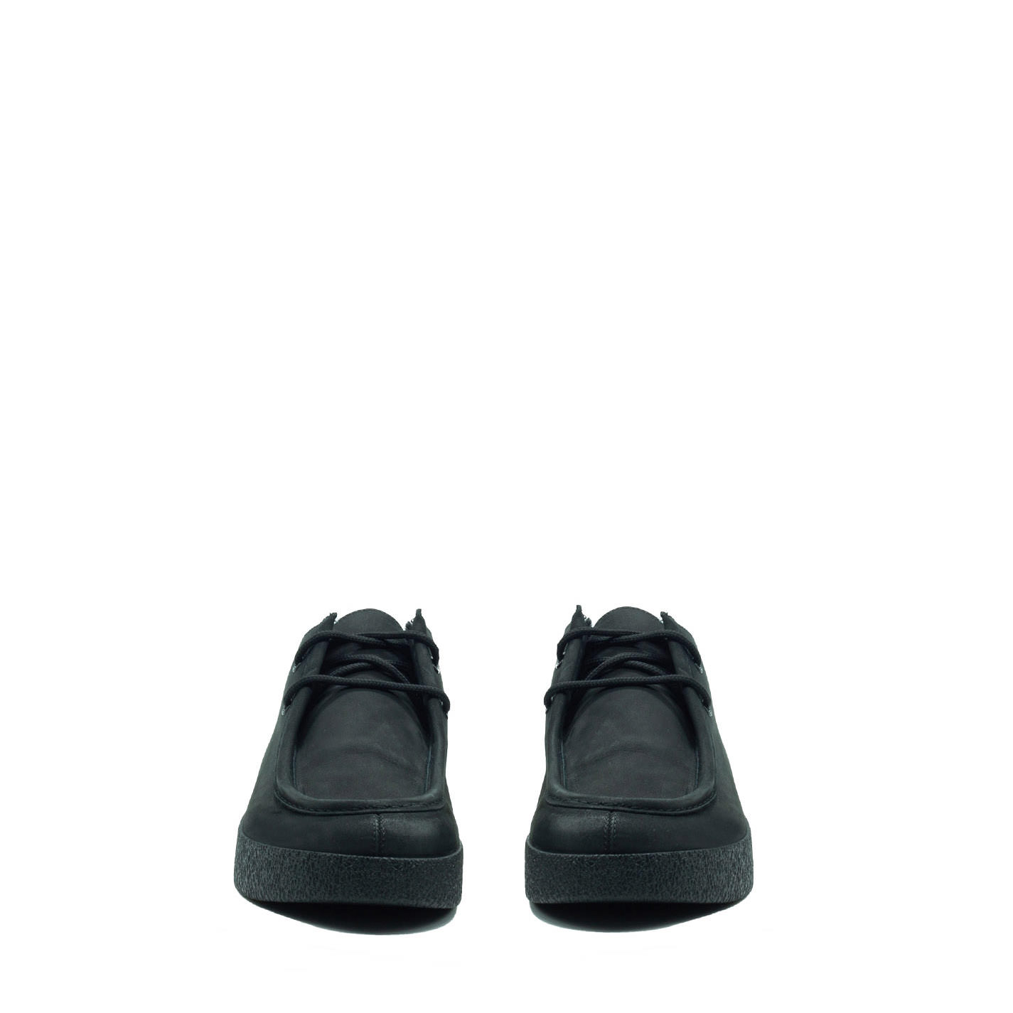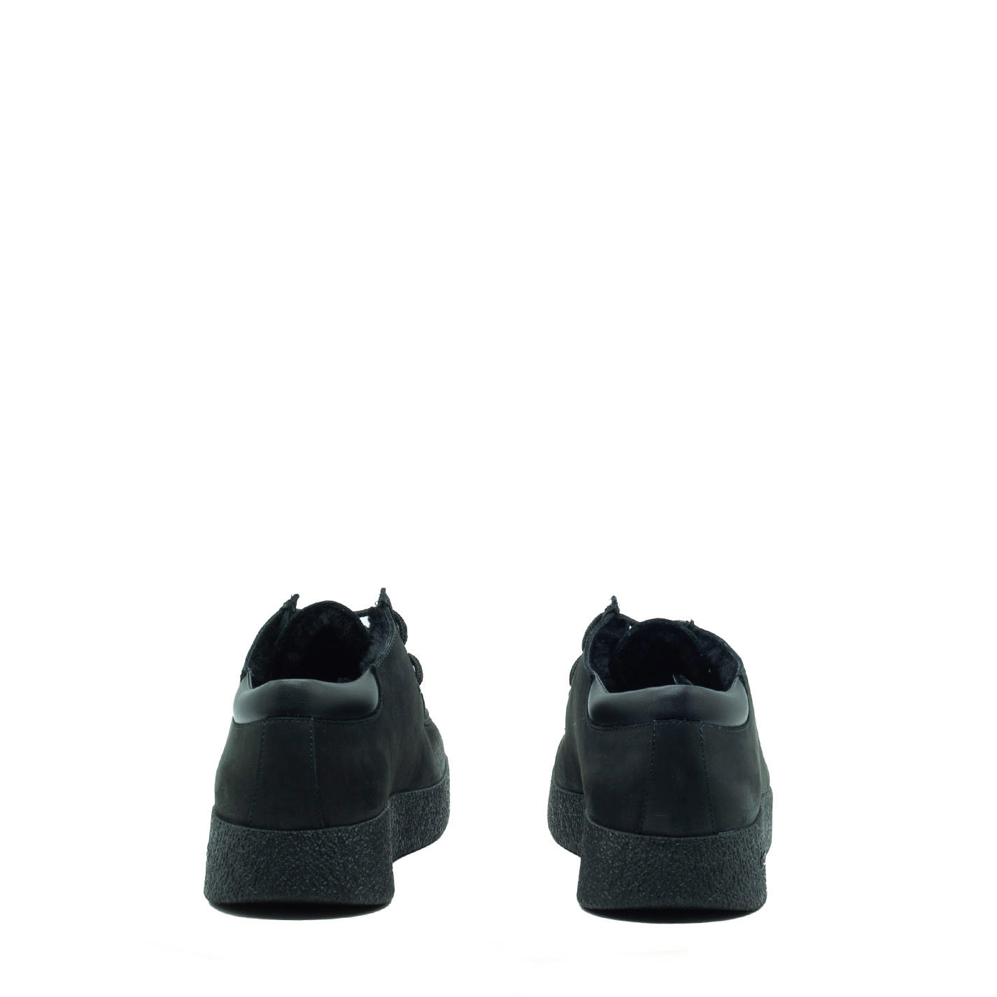 Whippy black Nubuck and matt Nappa calfskin lace-up ankle boots, with piped and welt plug, contrasting leather spoiler, and sheepskin lining. This model features a lightweight crepe texture flexible rubber sole, and a flat footbed covered in fabric. Made in Italy.