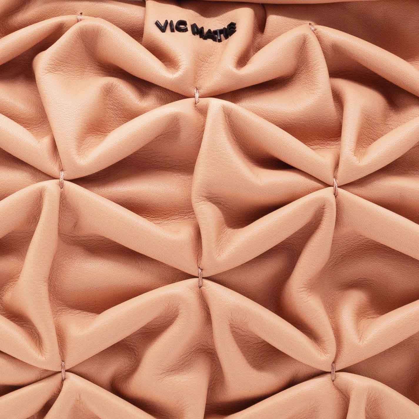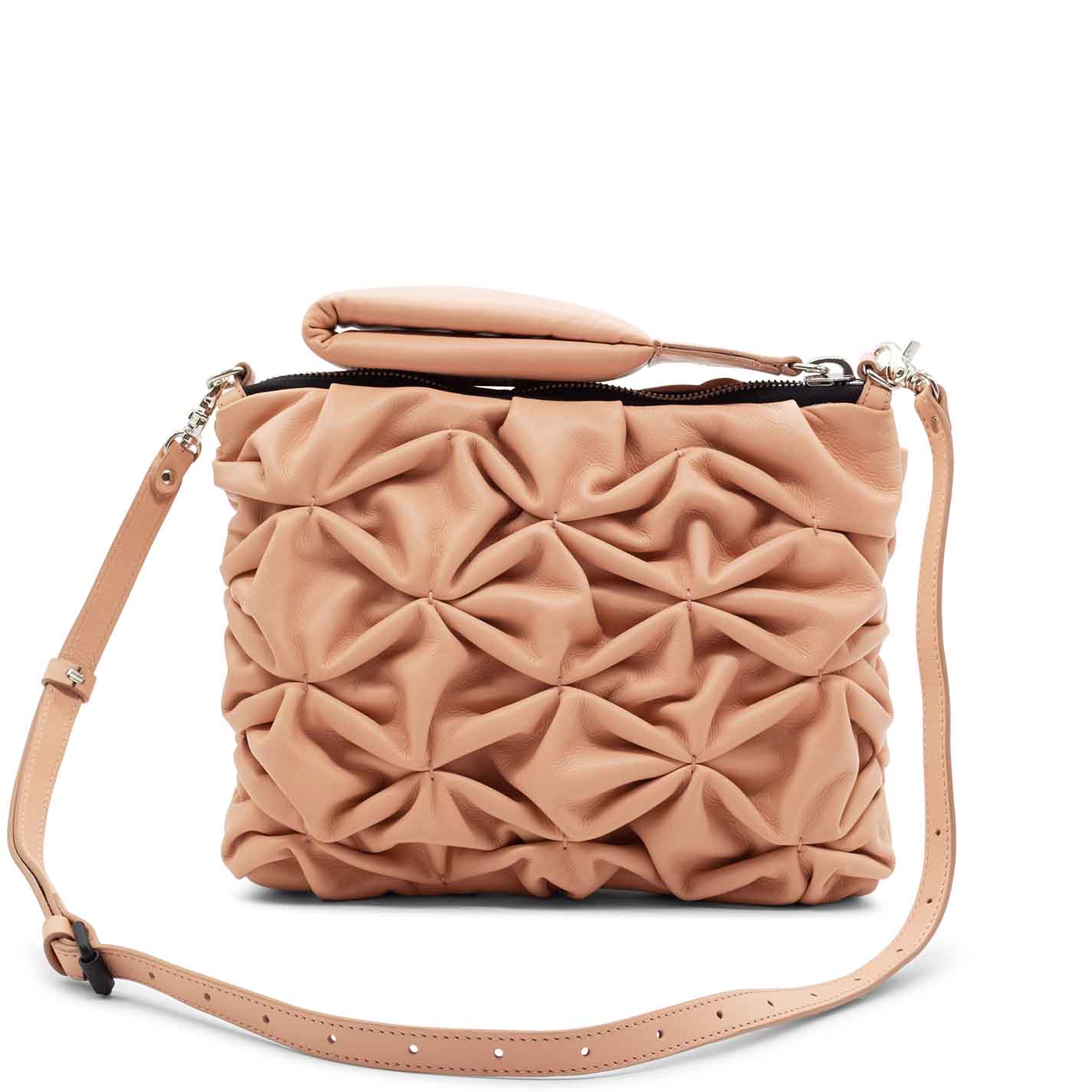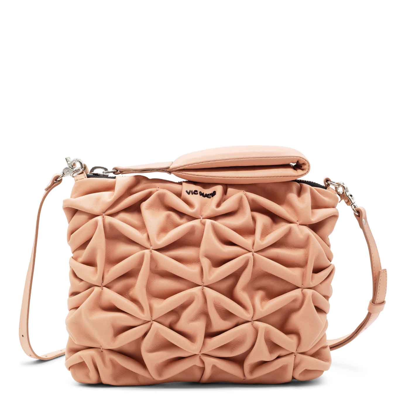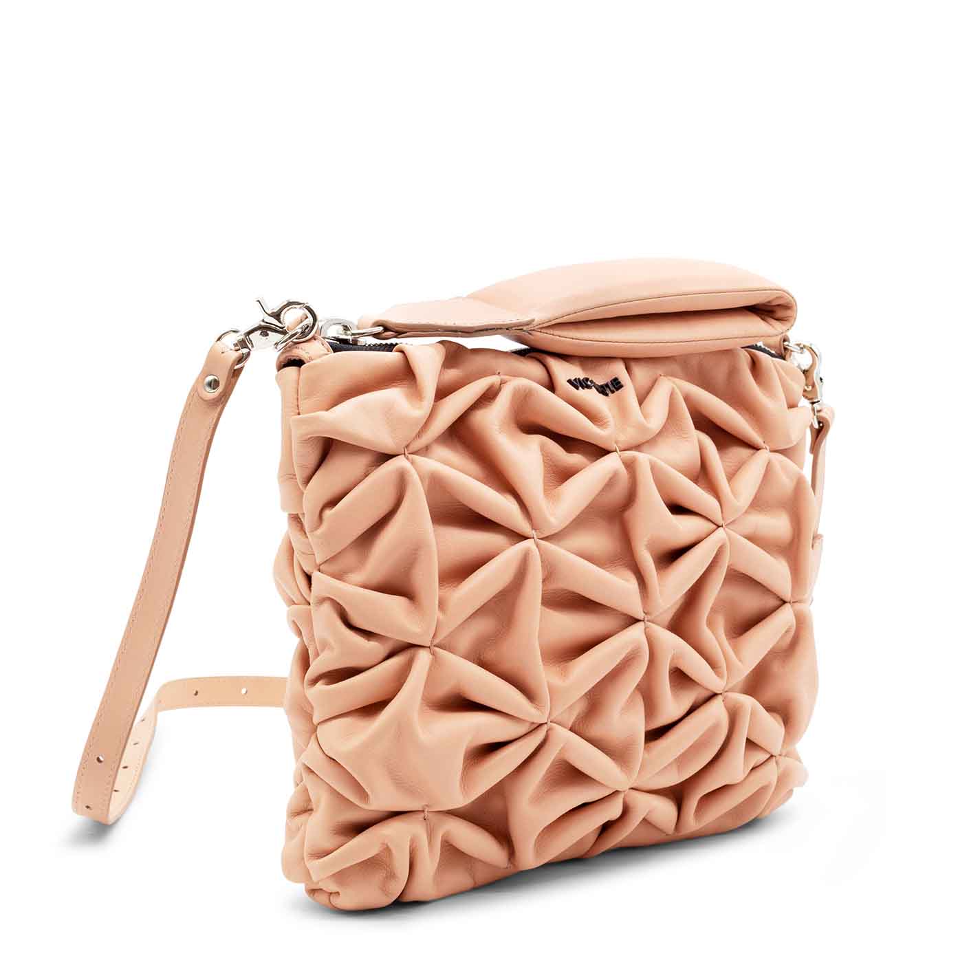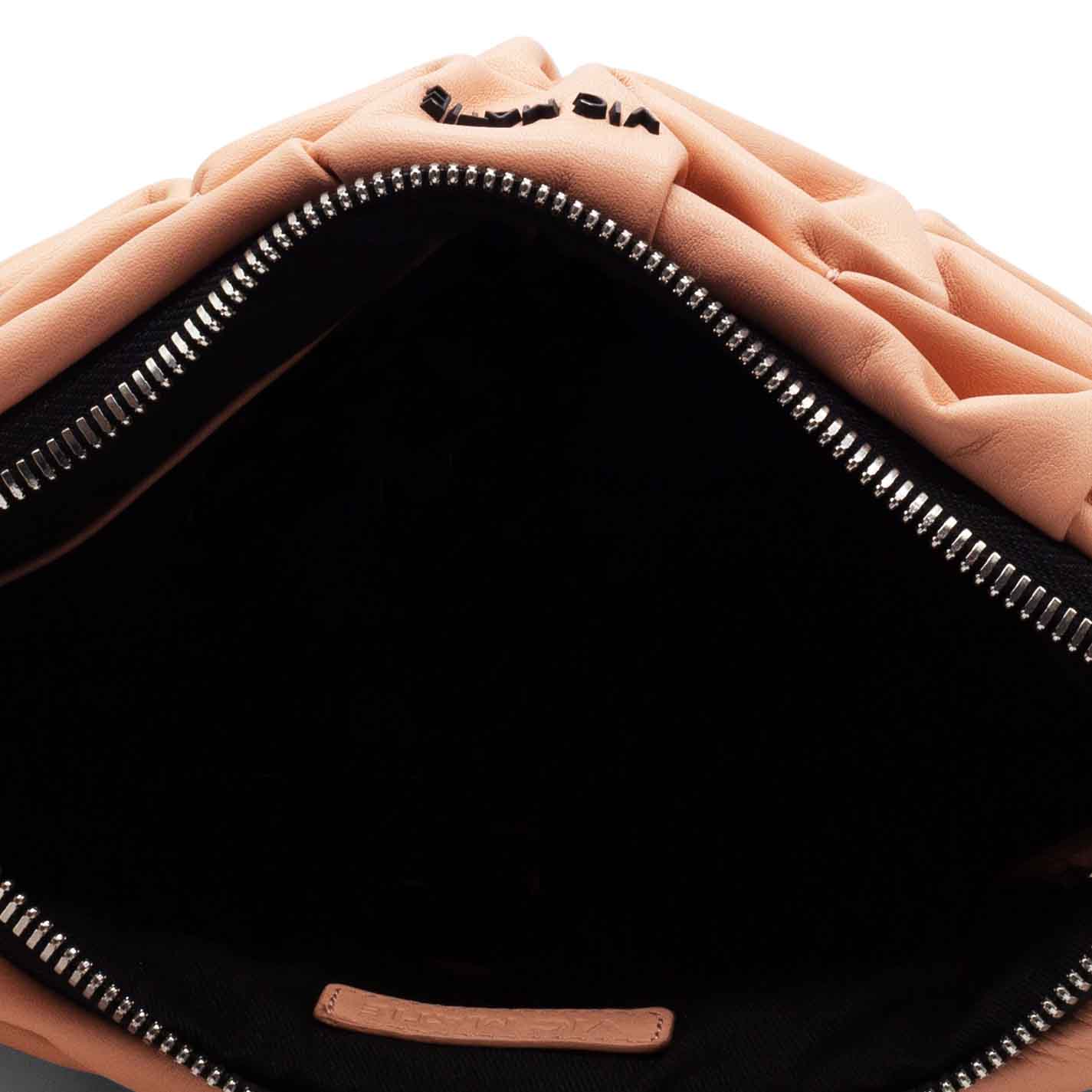 Pink pouch bag in soft nappa calfskin, with shoulder strap and hand-worked pinch stitching. Large leather zip pull and shoulder strap. Made in Italy.