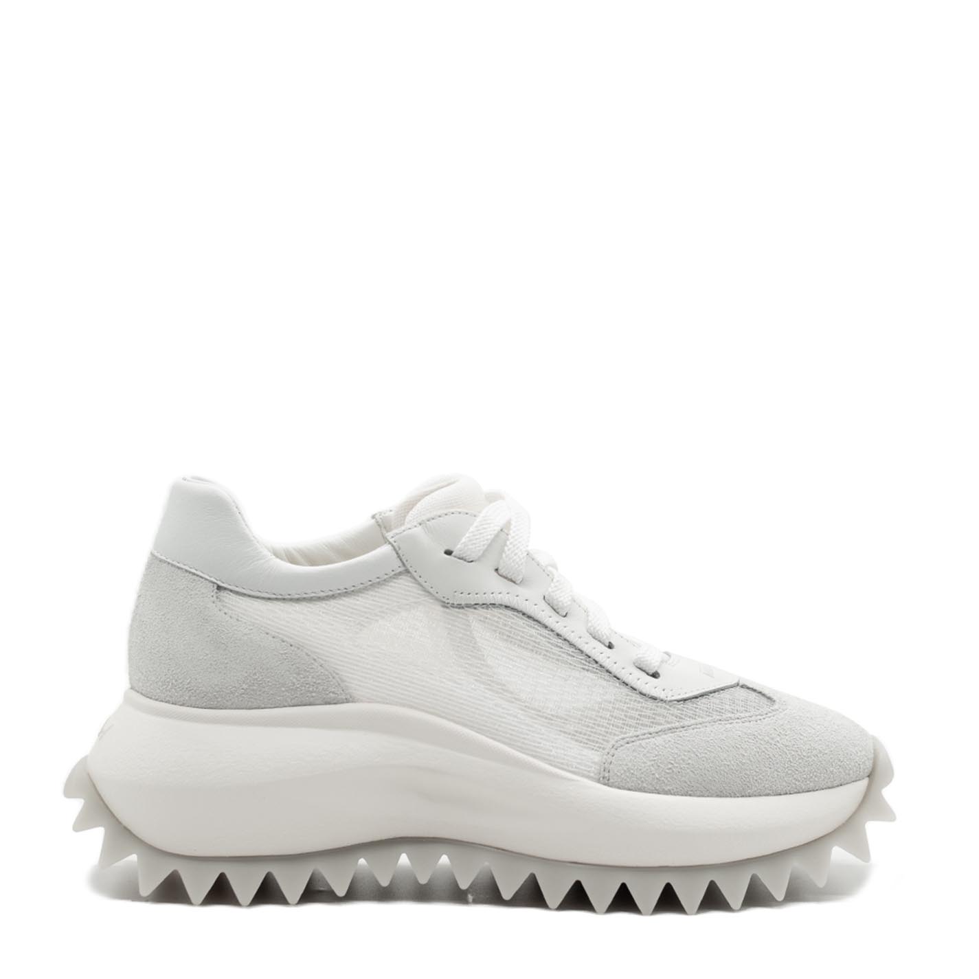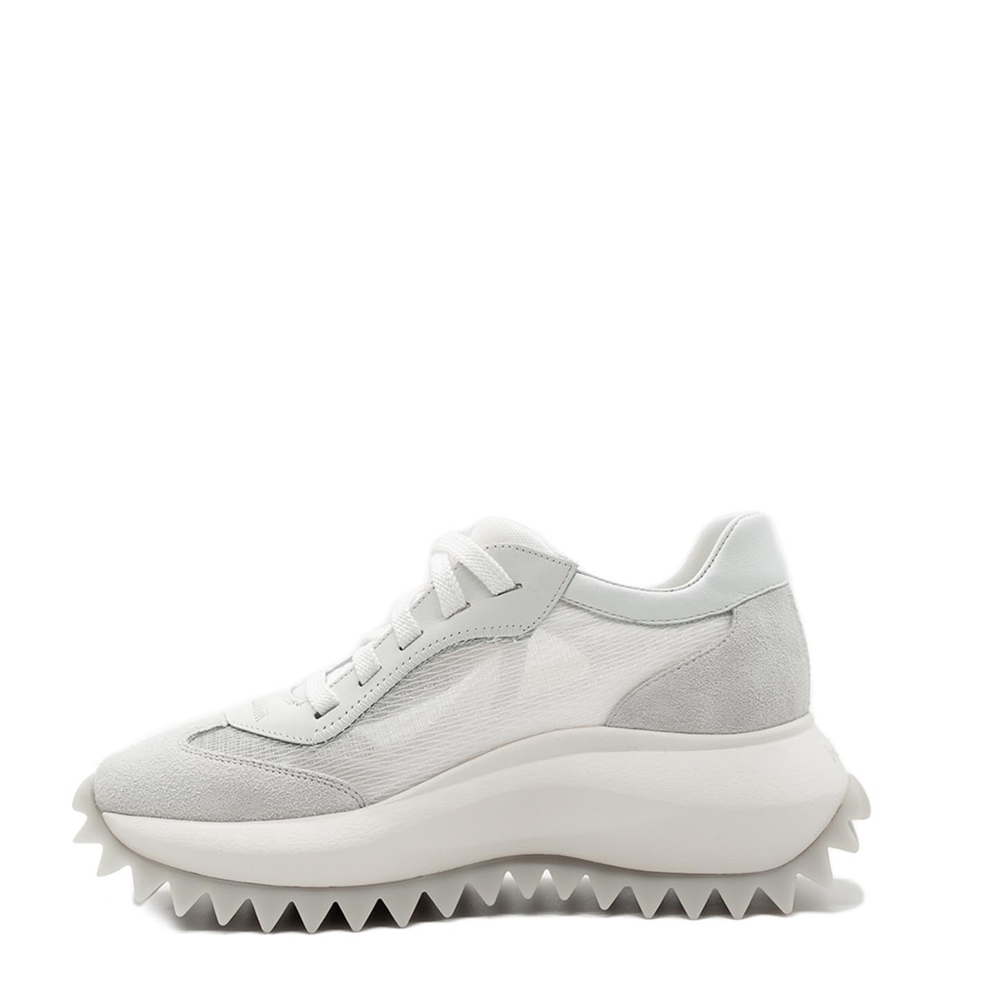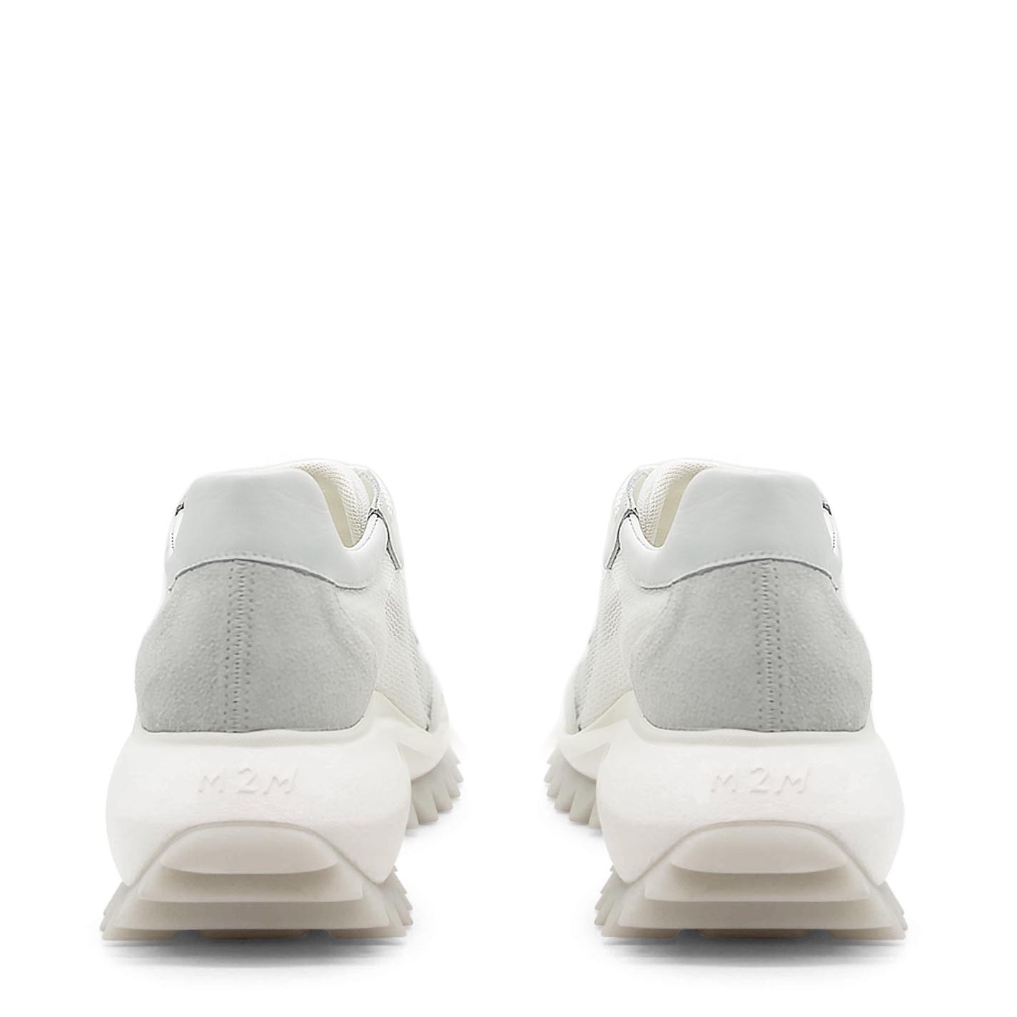 White m2m lace-ups in split calfskin and transparent mesh, with contrasting stitching. Logo-branded xl extralight one-piece sole with rubber insert and tread with maxi spikes. Pure cotton-covered anatomic insole. Made in Italy.