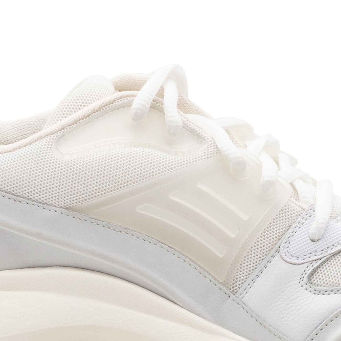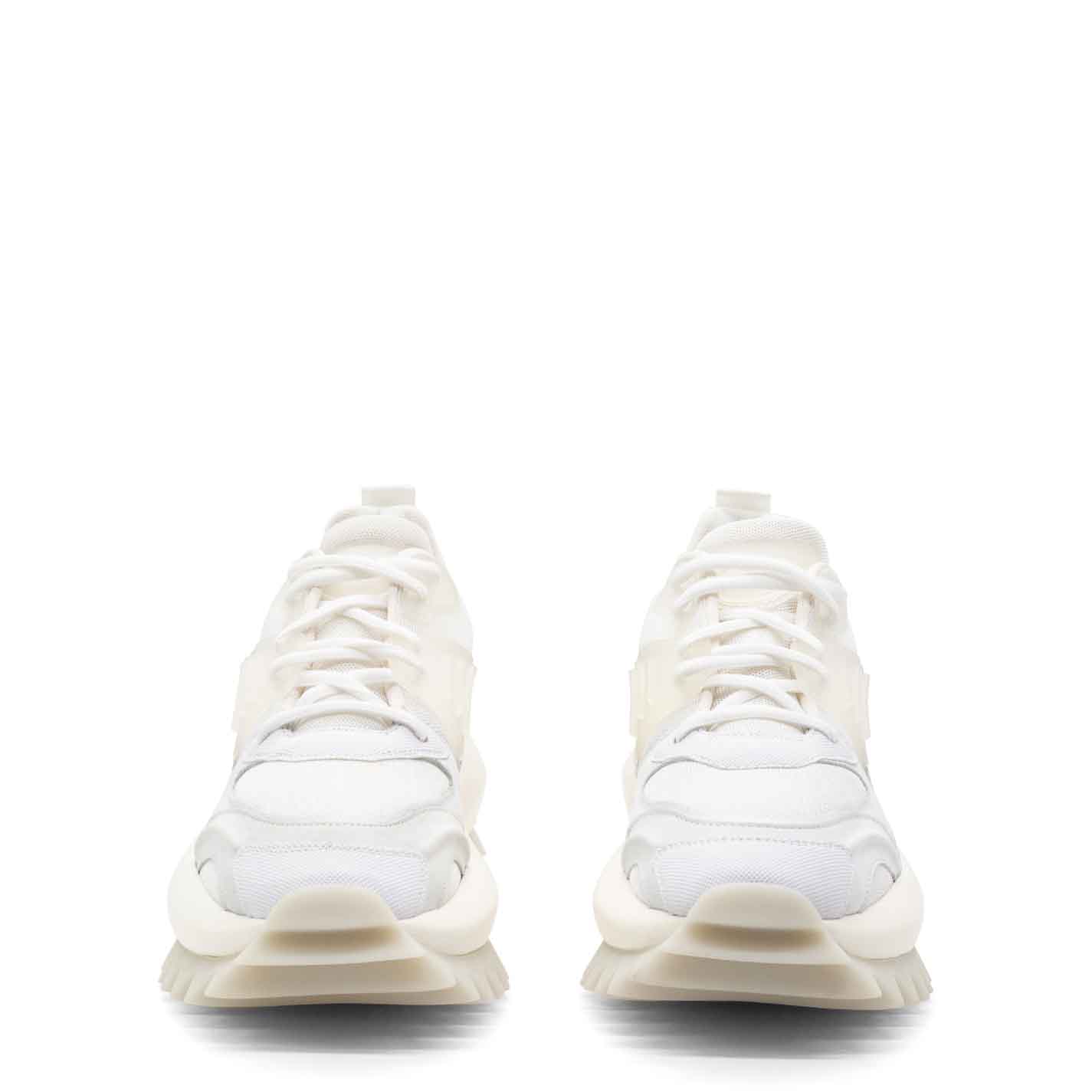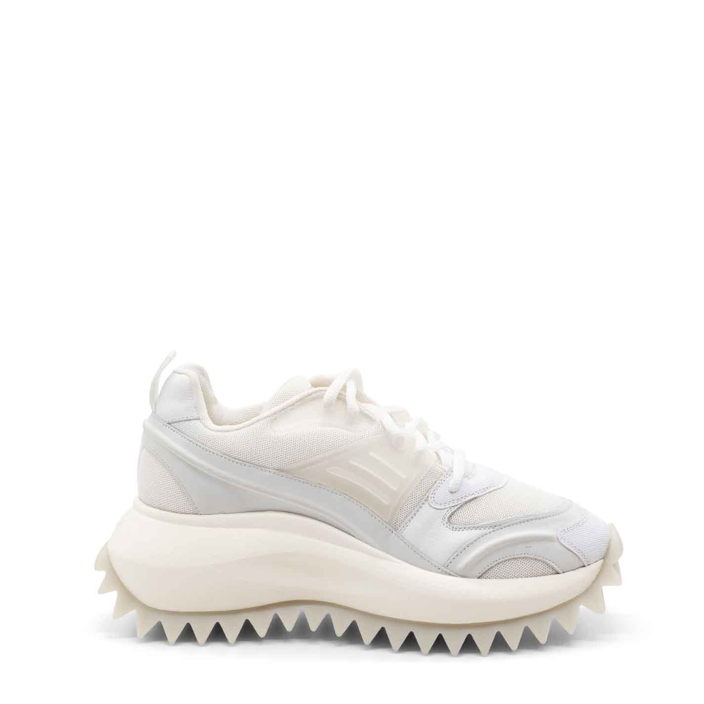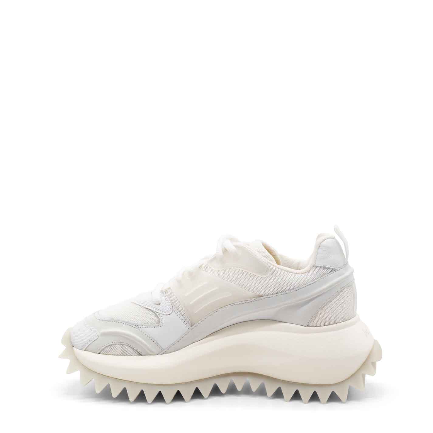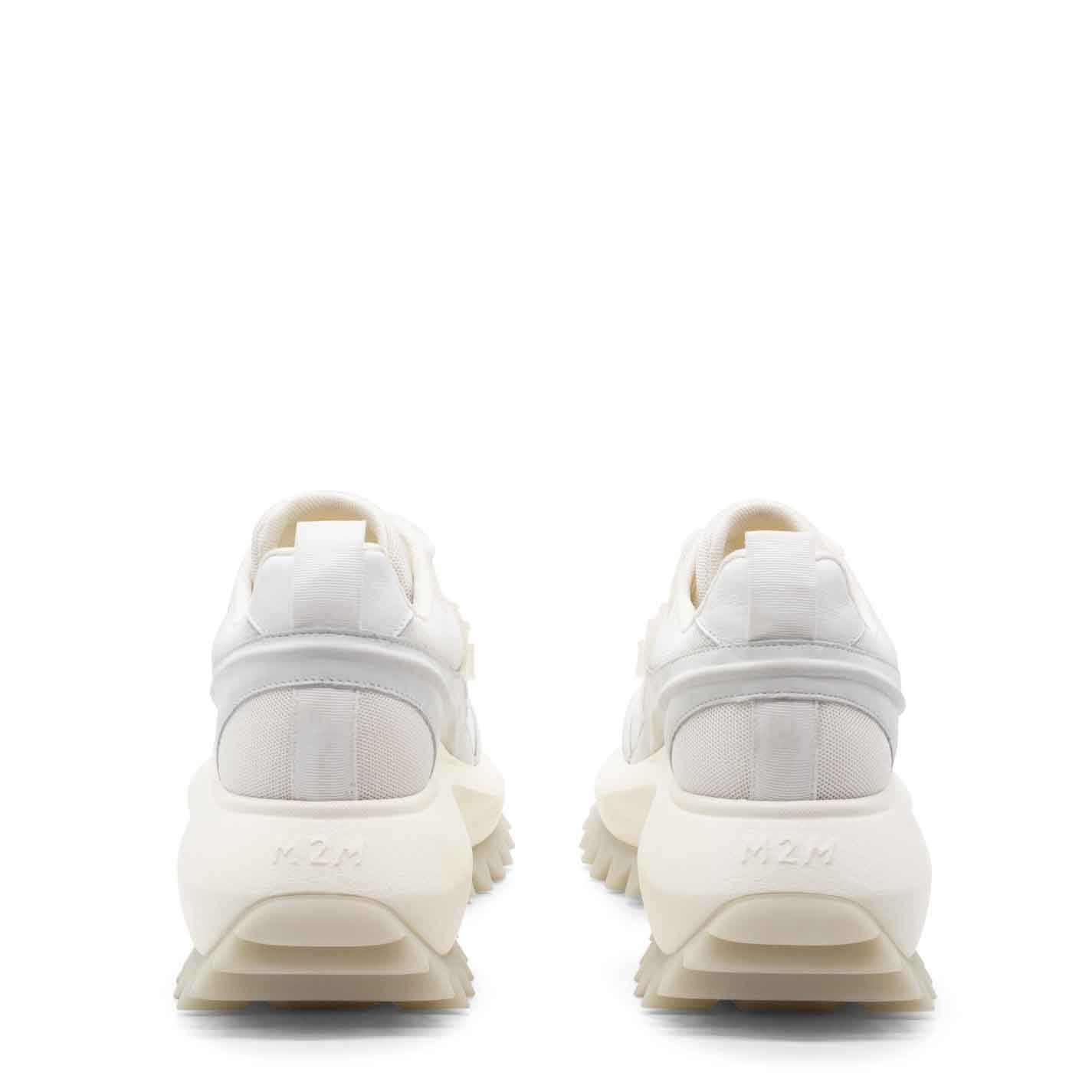 White m2m running shoes in nubuck leather, leather and mesh fabric, with accessories, lace loops and raised rubber detailing, including on the upper. Logo-branded xl extralight one-piece sole with rubber insert and tread with maxi spikes. Pure cotton-covered anatomic insole. Made in Italy.