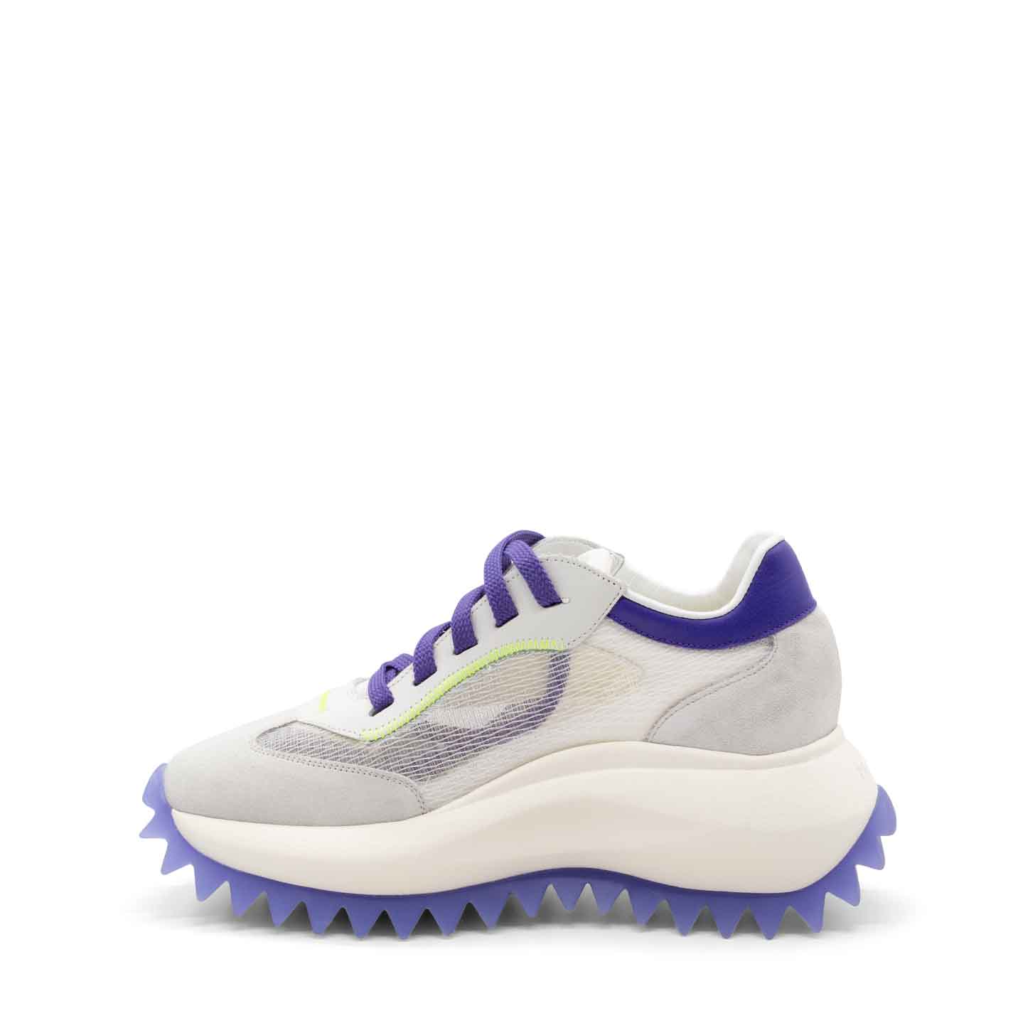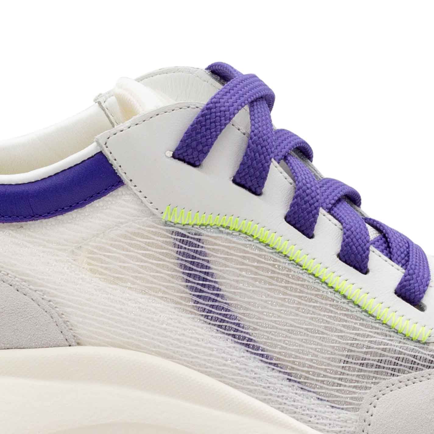White/purple m2m lace-ups in split calfskin and transparent mesh, with contrasting stitching. Logo-branded xl extralight one-piece sole with rubber insert and tread with maxi spikes. Pure cotton-covered anatomic insole. Made in Italy.
