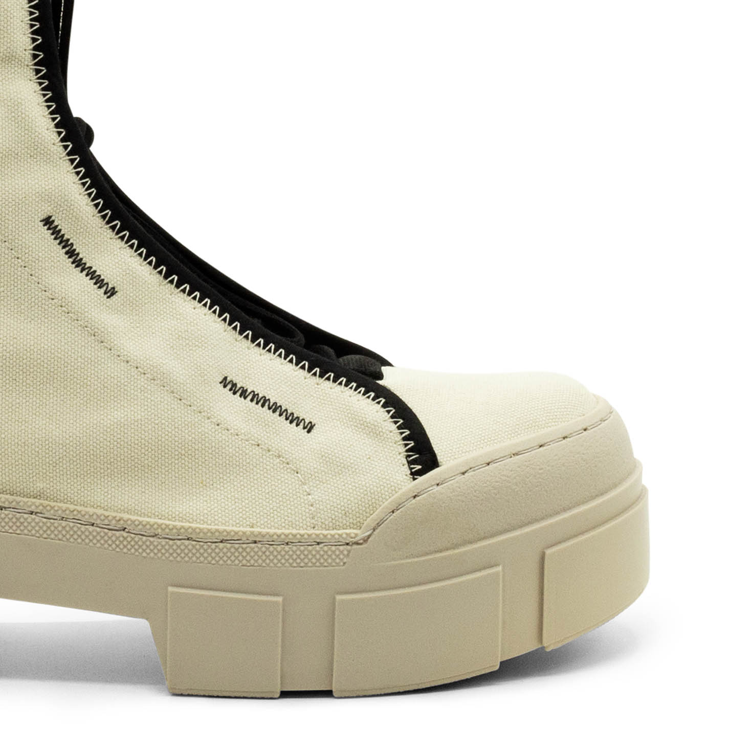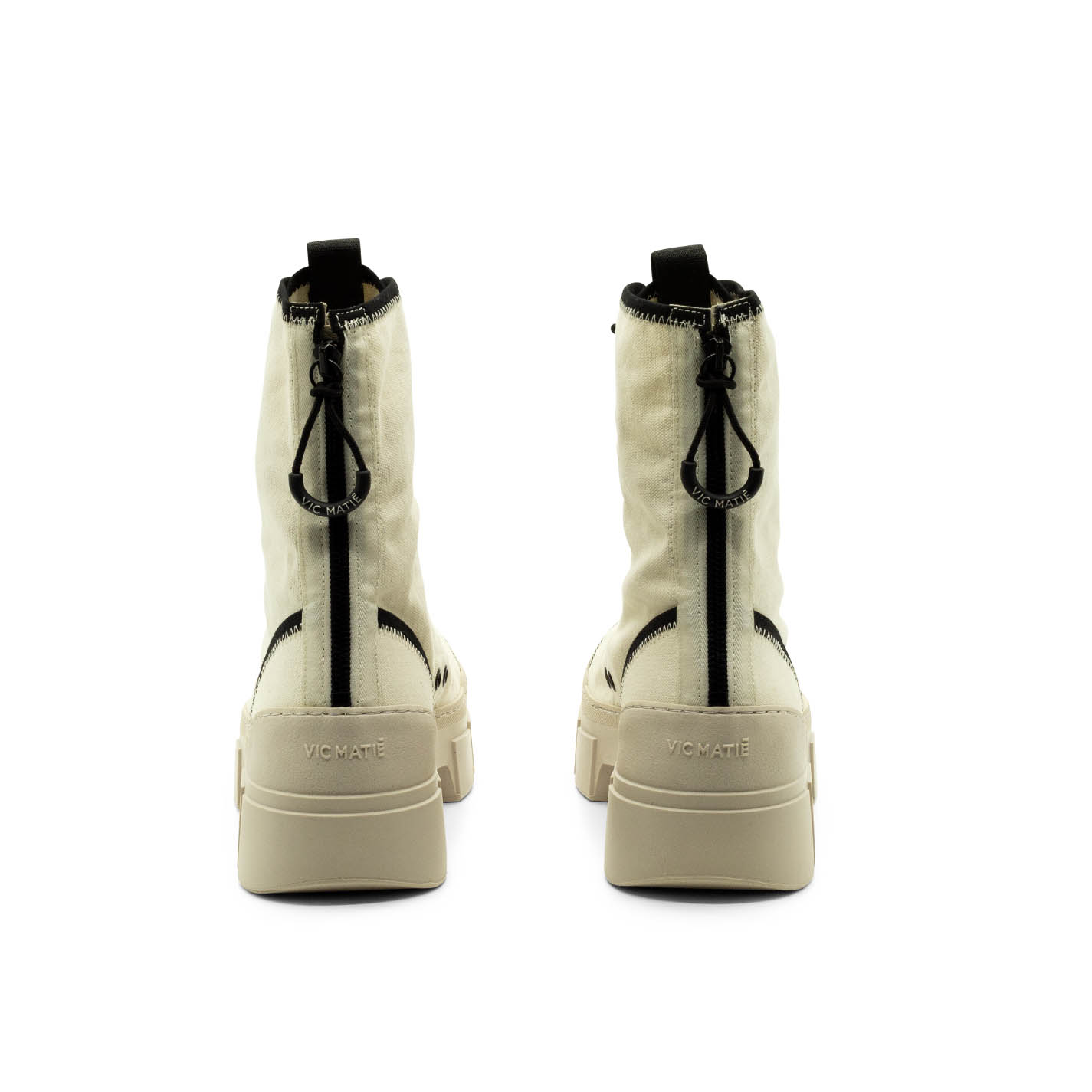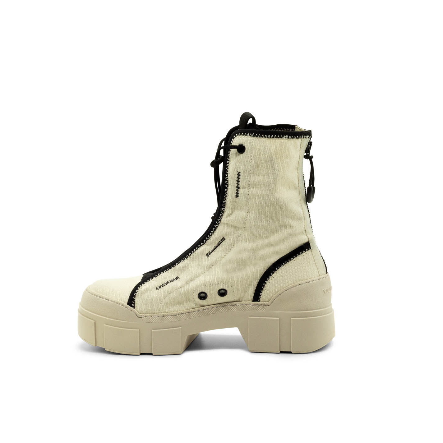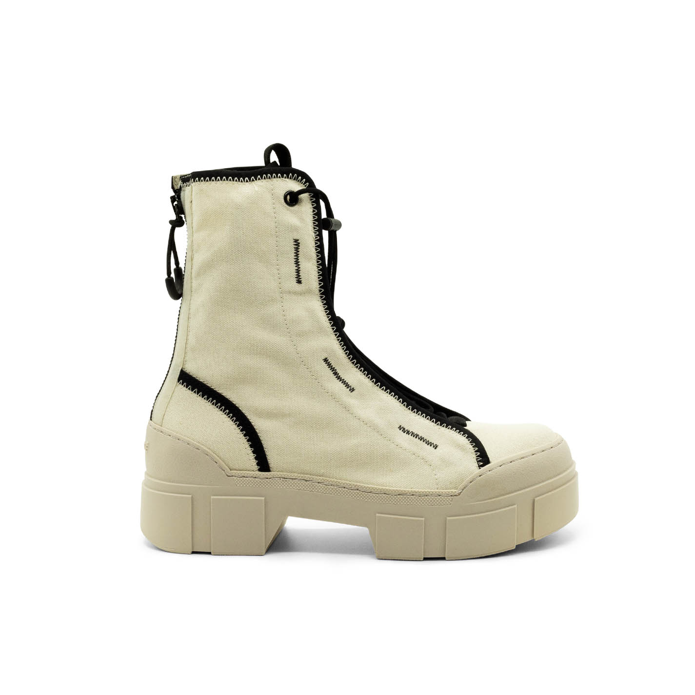 Women’s cream Roccia combat boots in unlined cotton with fabric edging, black zigzag detailing, toggle-adjustable lacing, grosgrain detail, two-tone zip at the back to help put them on and branded rubber pull tab. TPU shell sole with superimposed strips and soft, calfskin-covered TAG insole. Made in Italy.