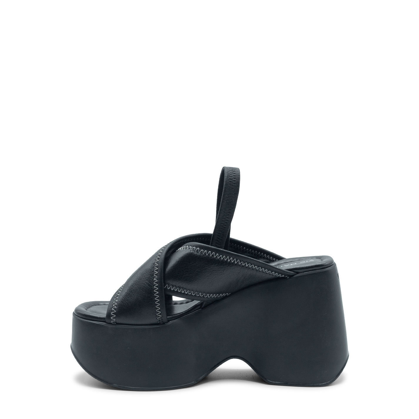Elastic covered in leather for greater stability. Wedge in super light, comfortable and tonal rubbery material with non-slip tread. Padded leather insole enriched with stitching. Made in Italy.