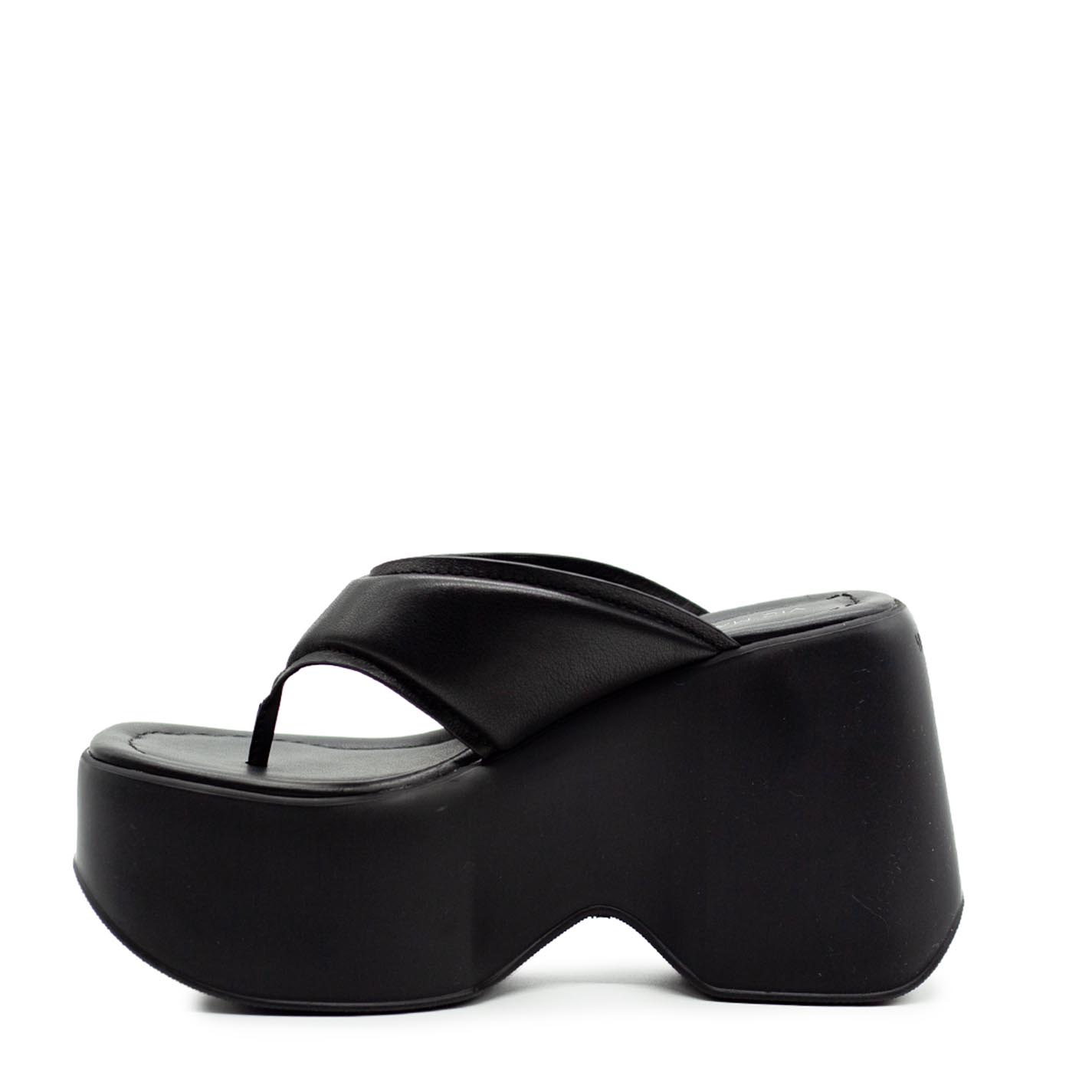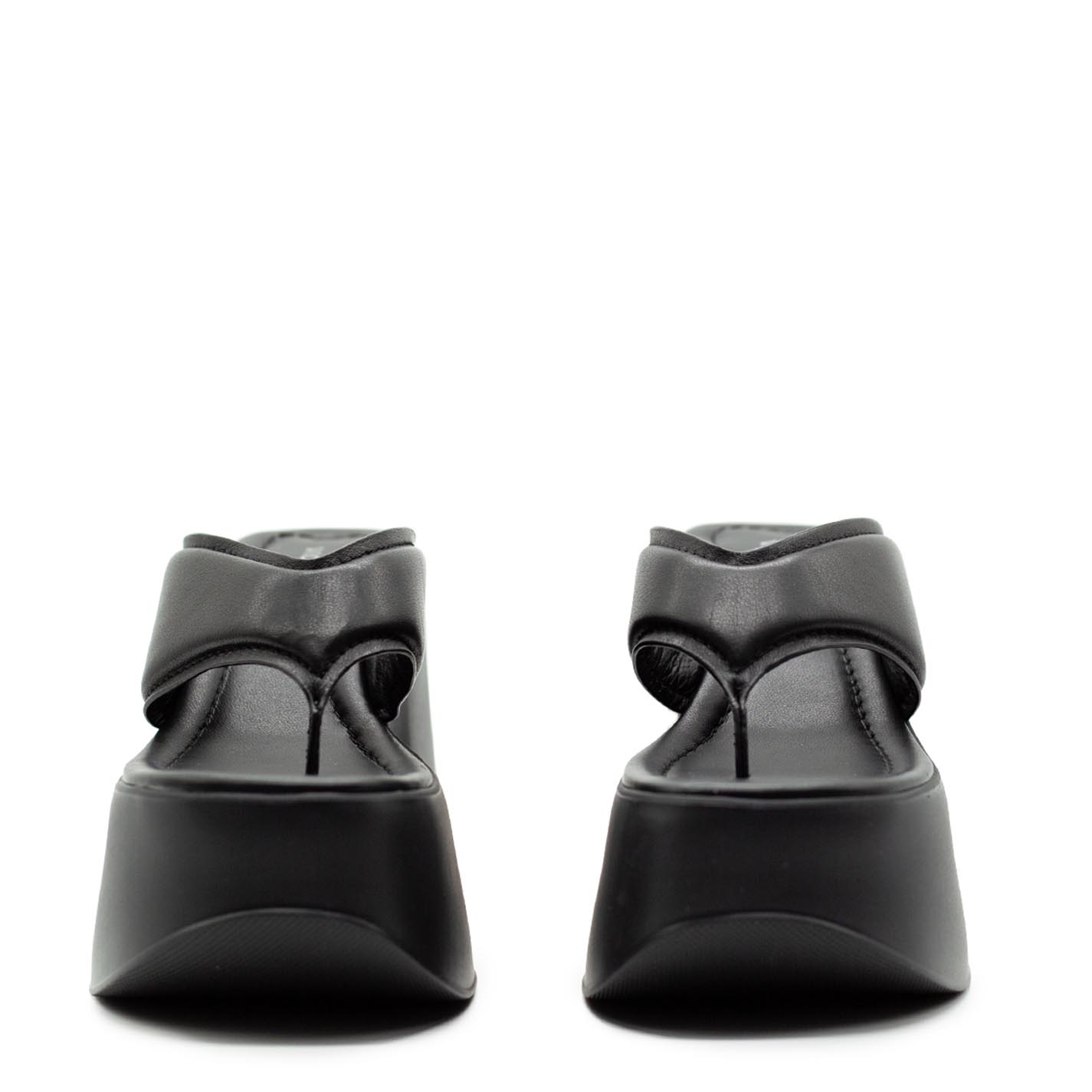 Black Yoko thong sandals in soft nappa calfskin, with raised motif. Super-light and comfortable foam wedge. Padded and stitched leather insole. Non-slip outsole. Made in Italy.