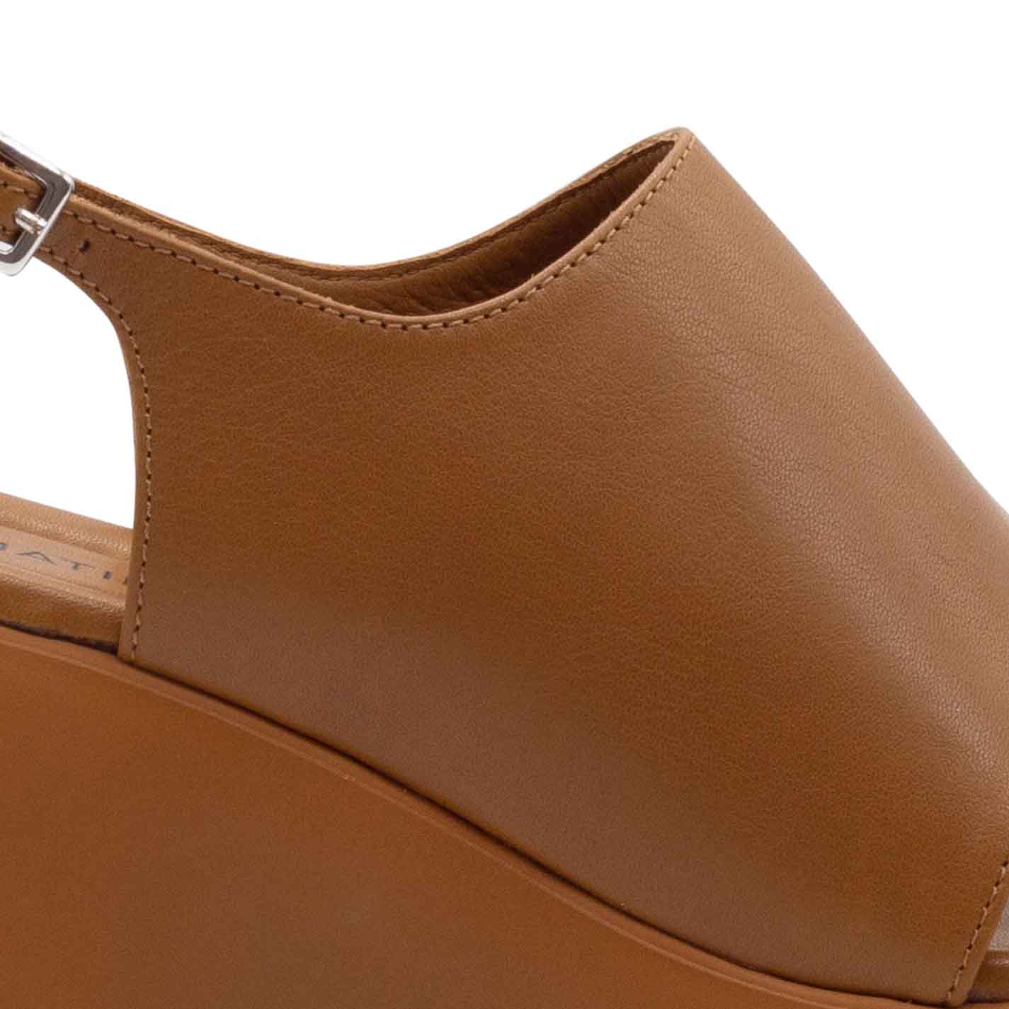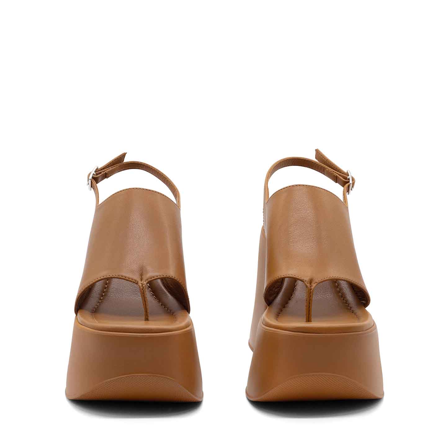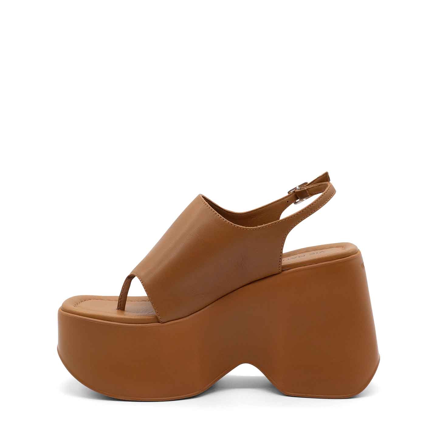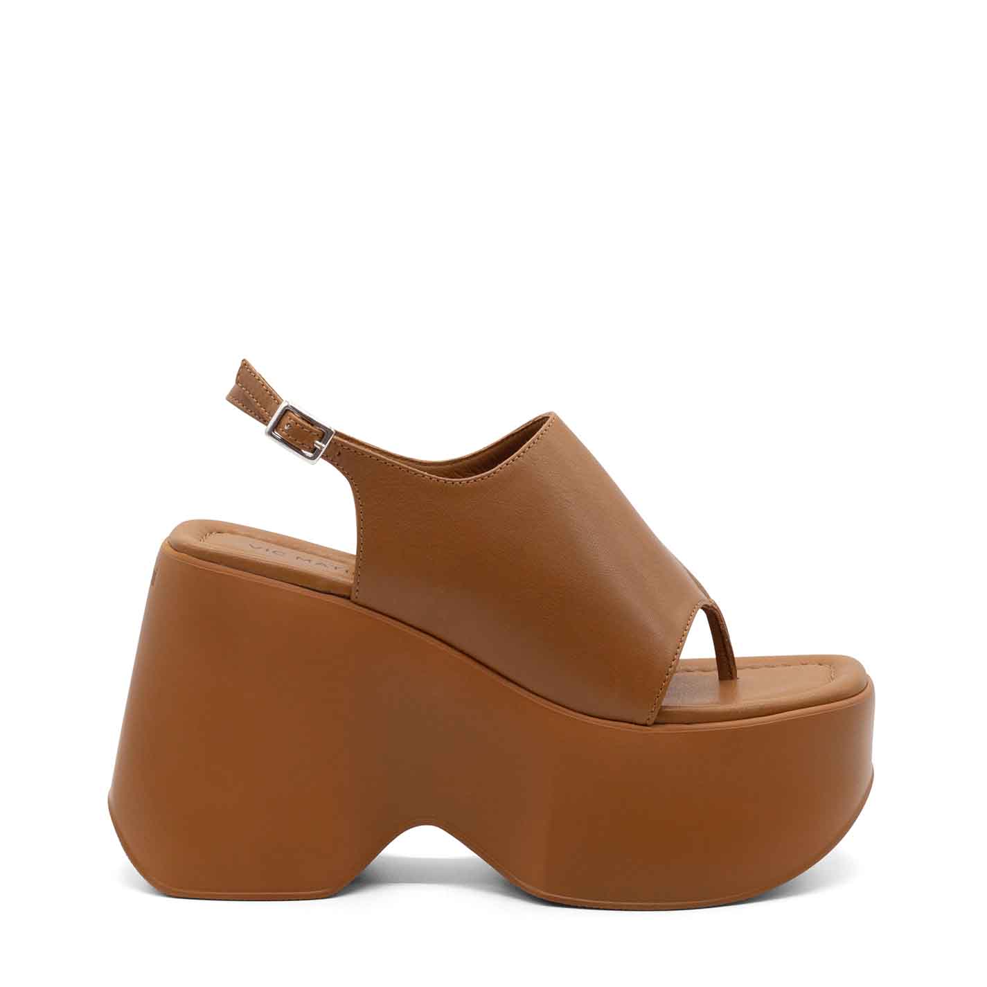 Yoko thong slip-ons in soft tobacco-brown nappa calfskin, with buckle-adjustable strap. Super-light and comfortable foam wedge. Padded and stitched leather insole. Non-slip outsole. Made in Italy.