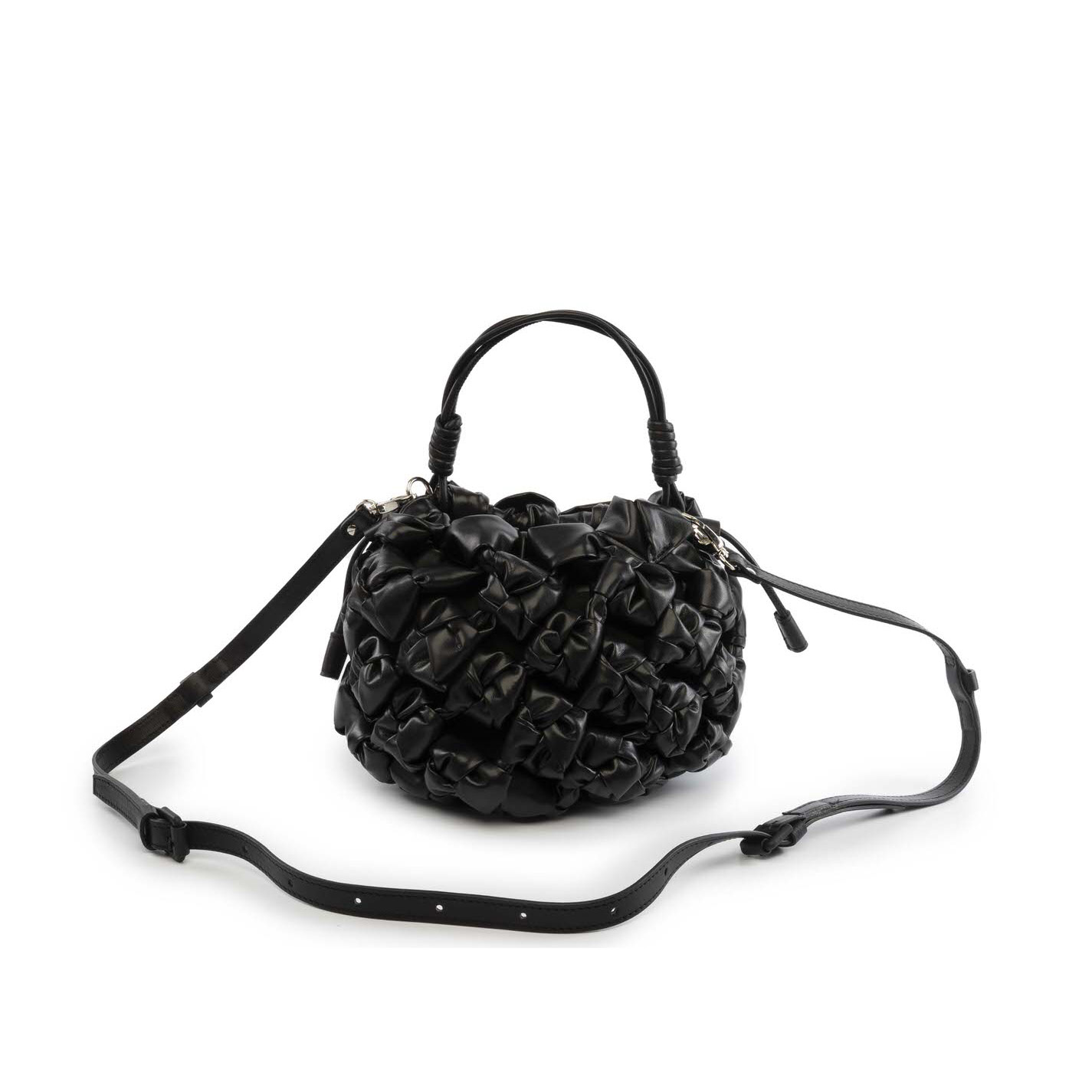 Black bag consisting entirely of interwoven faux leather strips. Leather drawstring fastening and knotted-string handle. Removable and adjustable leather shoulder strap. Embellished with metal logo.