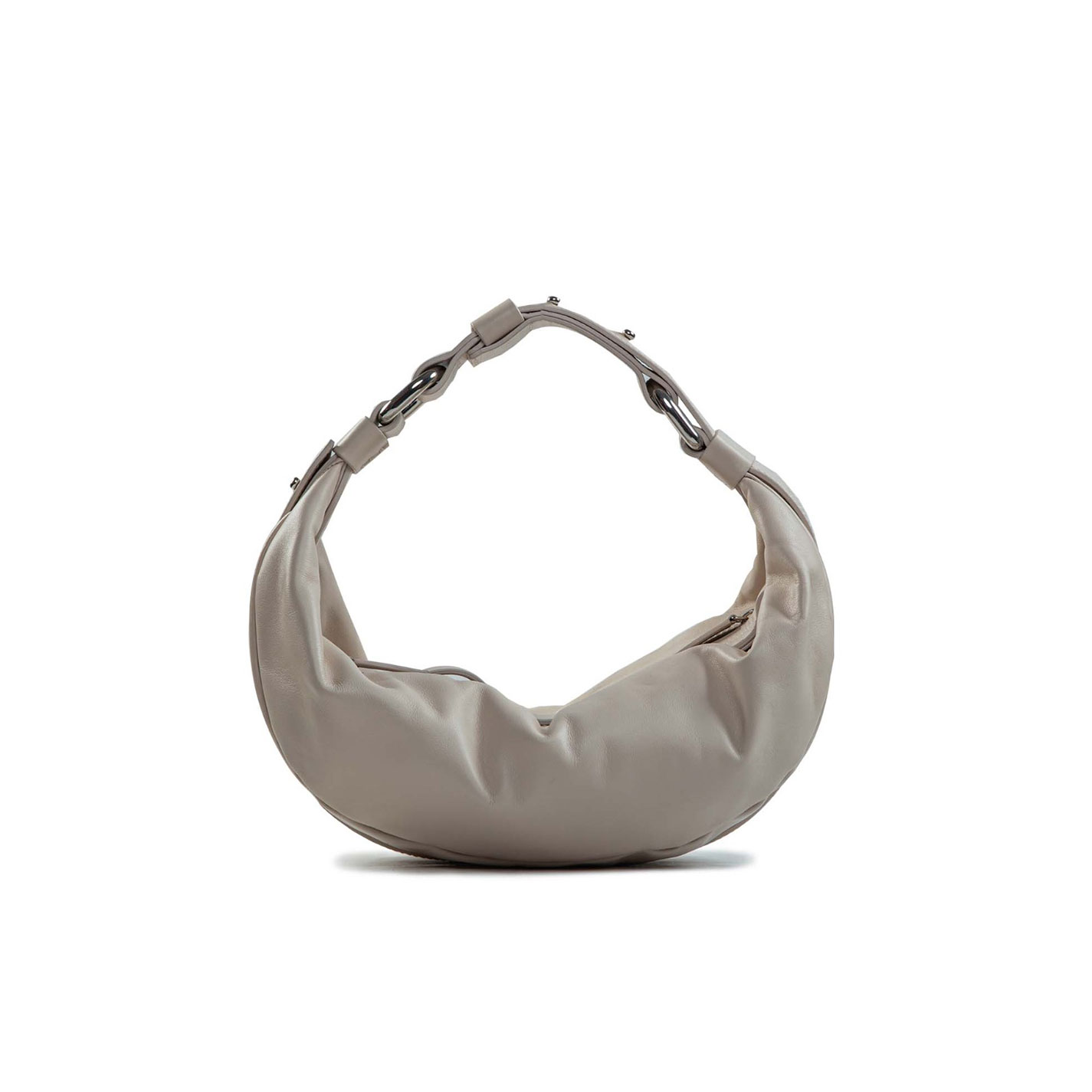 Borsa mezza luna avorio, realizzata in morbida pelle di vitello, con manici in pelle, tracolla regolabile e apribile per poterlo utilizzare anche come marsupio. Doppio scomparto chiuso con zip metalliche.