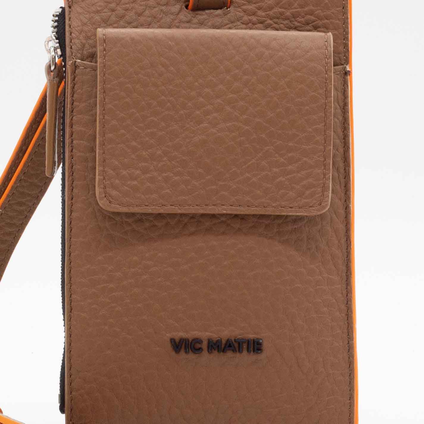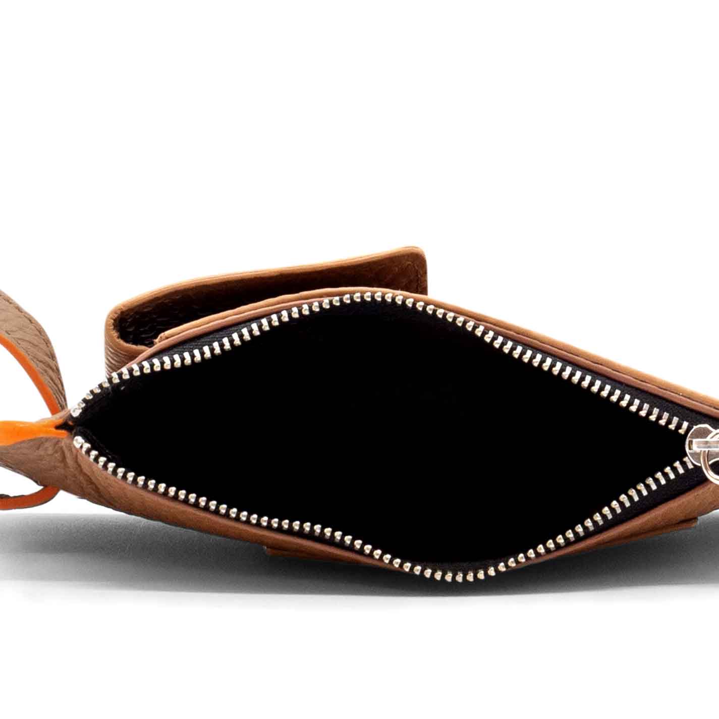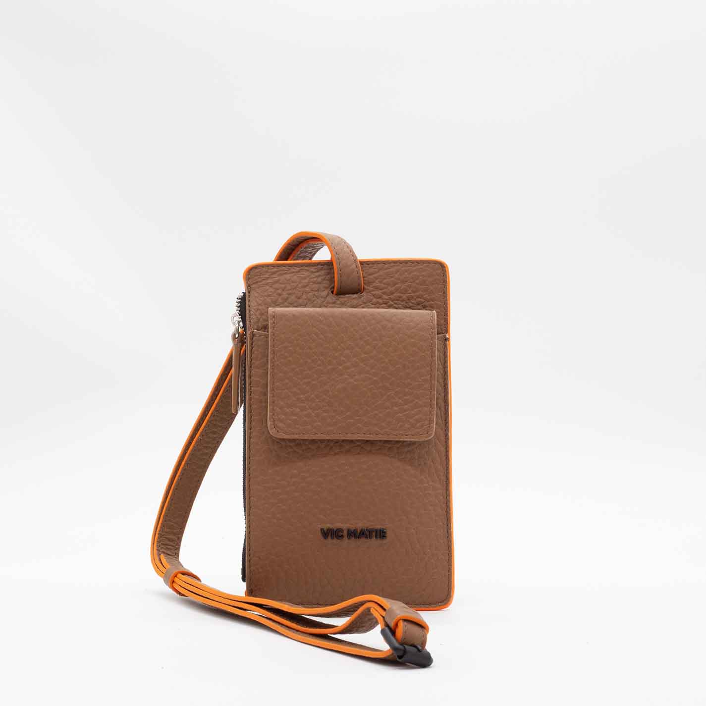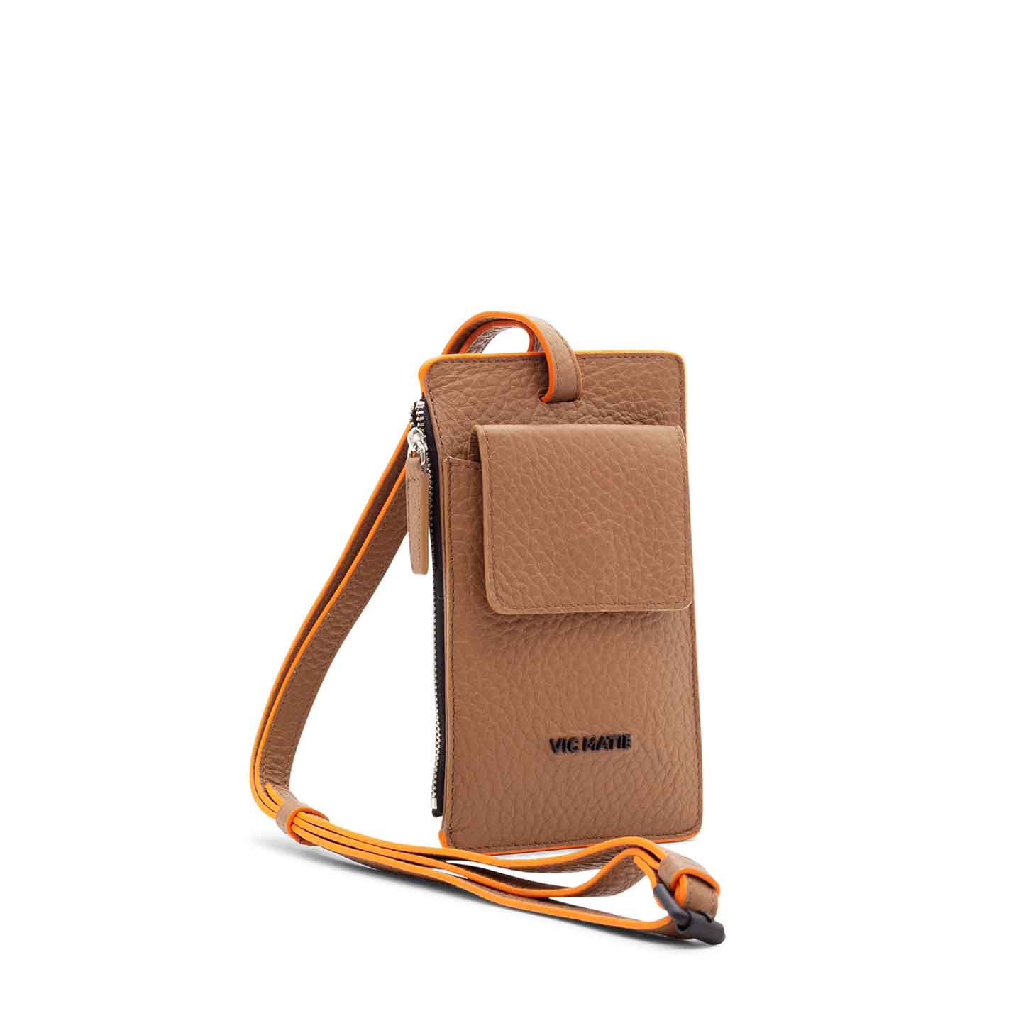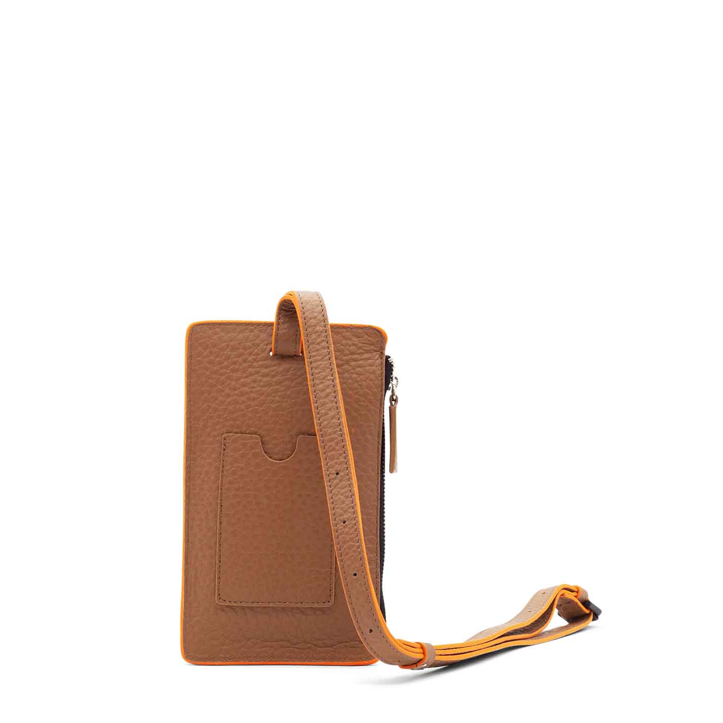 porta cellulare a tracolla tabacco con lissatura arancio fluo con chiusura magnetica, tasca laterale porta documenti chiusa da zip con tirante in pelle, tracolla in pelle staccabile e regolabile. Logo metallico sulla parte frontale.