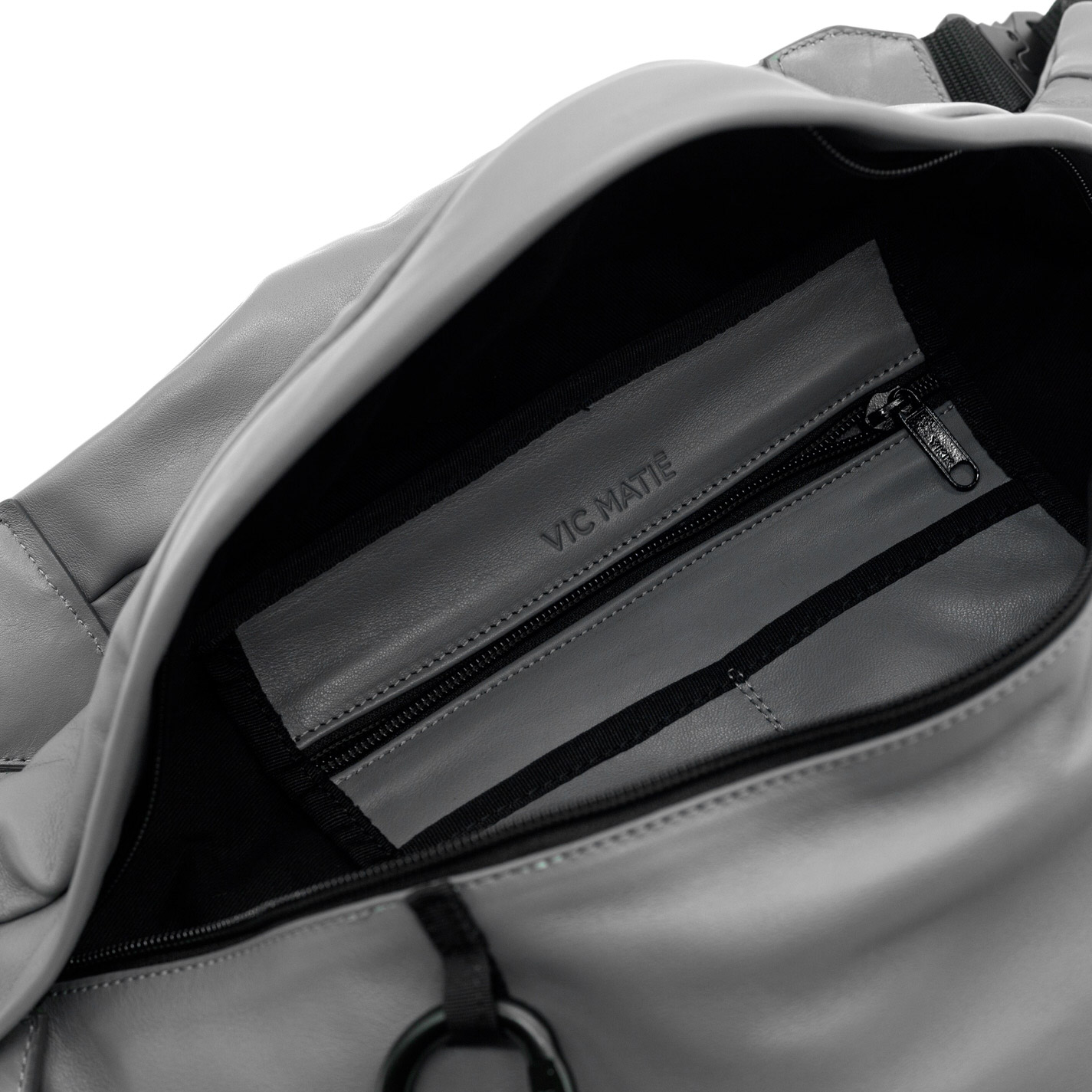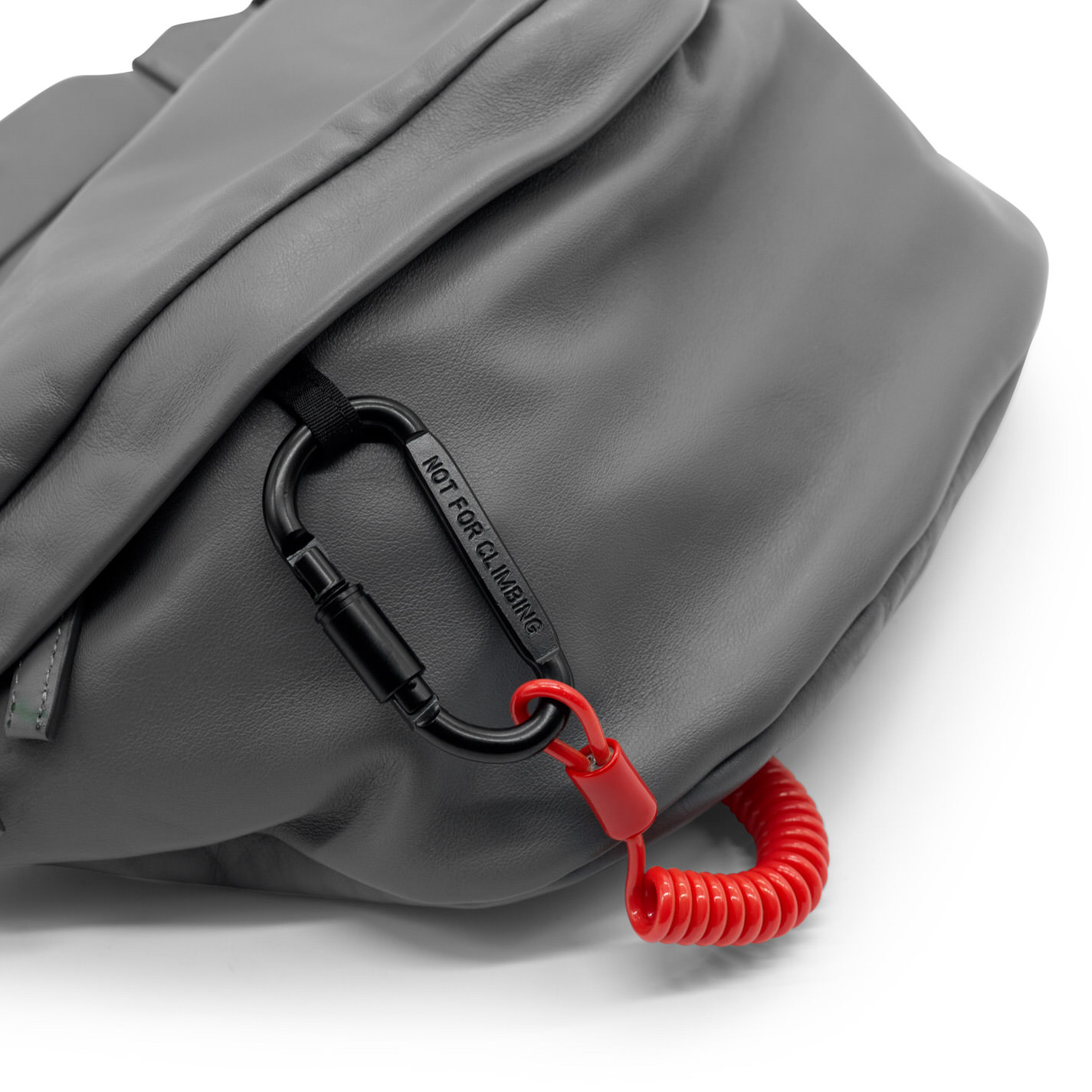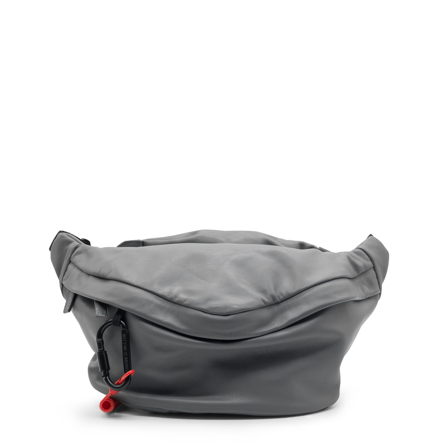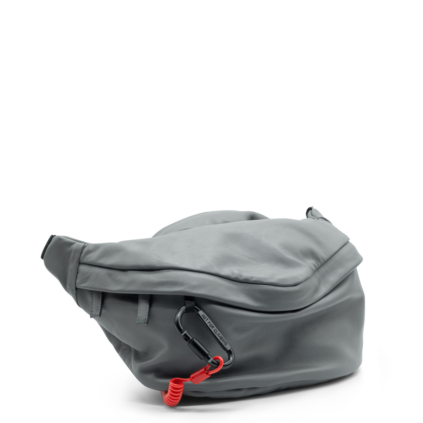 Maxi marsupio grigio realizzato in morbida nappa di vitello. Chiusura con grande zip. Borsello in pelle su cinta con chiusure tecniche apribili, che permettono di poterlo indossare anche sul polso. Cintura regolabile da portare in spalla o in vita.
