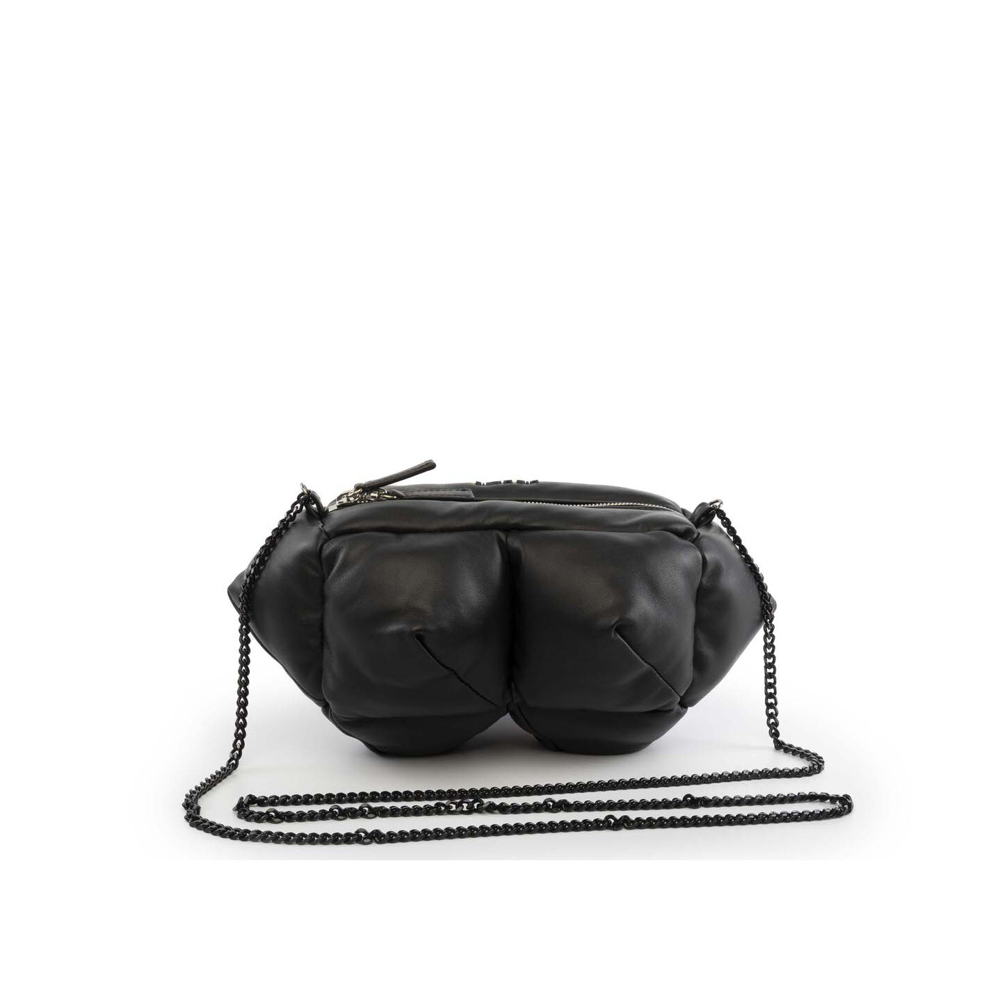 Tracollina nera piramidi 3d,realizzata in nappa con coppe imbottite a mano, chiusura superiore con zip, tracolla di catena metallica verniciata. Impreziosita da logo metallico sul davanti.