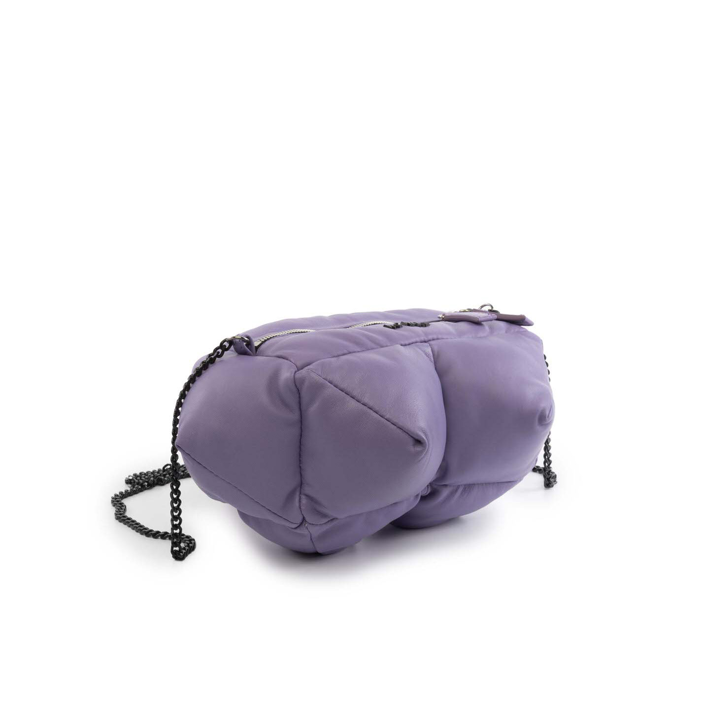 Tracollina viola piramidi 3d,realizzata in nappa con coppe imbottite a mano, chiusura superiore con zip, tracolla di catena metallica verniciata. Impreziosita da logo metallico sul davanti.
