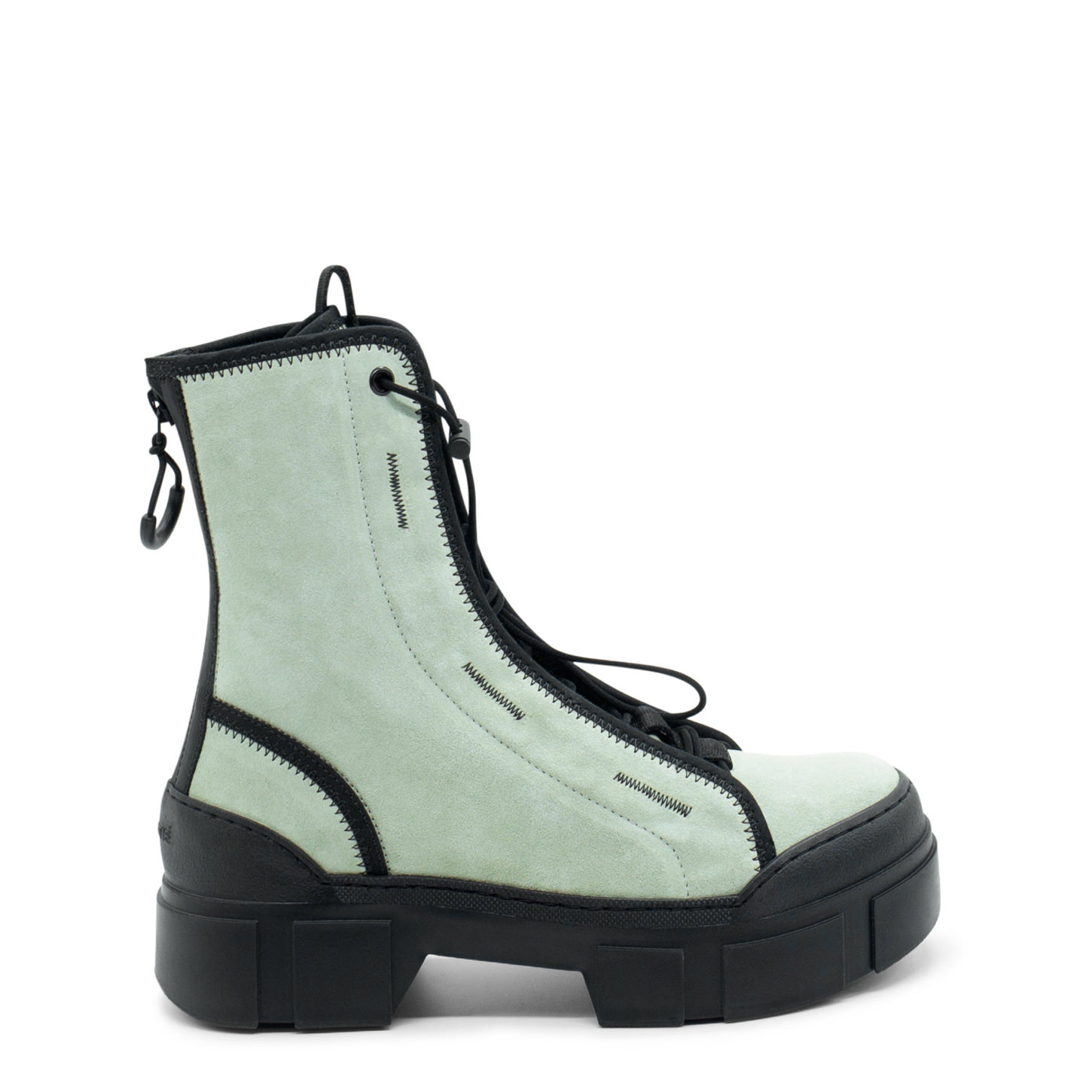 Anfibio Roccia in crosta osso di vitello effetto lavato, bordature e dettagli zig zag neri, stringa elastica regolabile con tira coulisse;