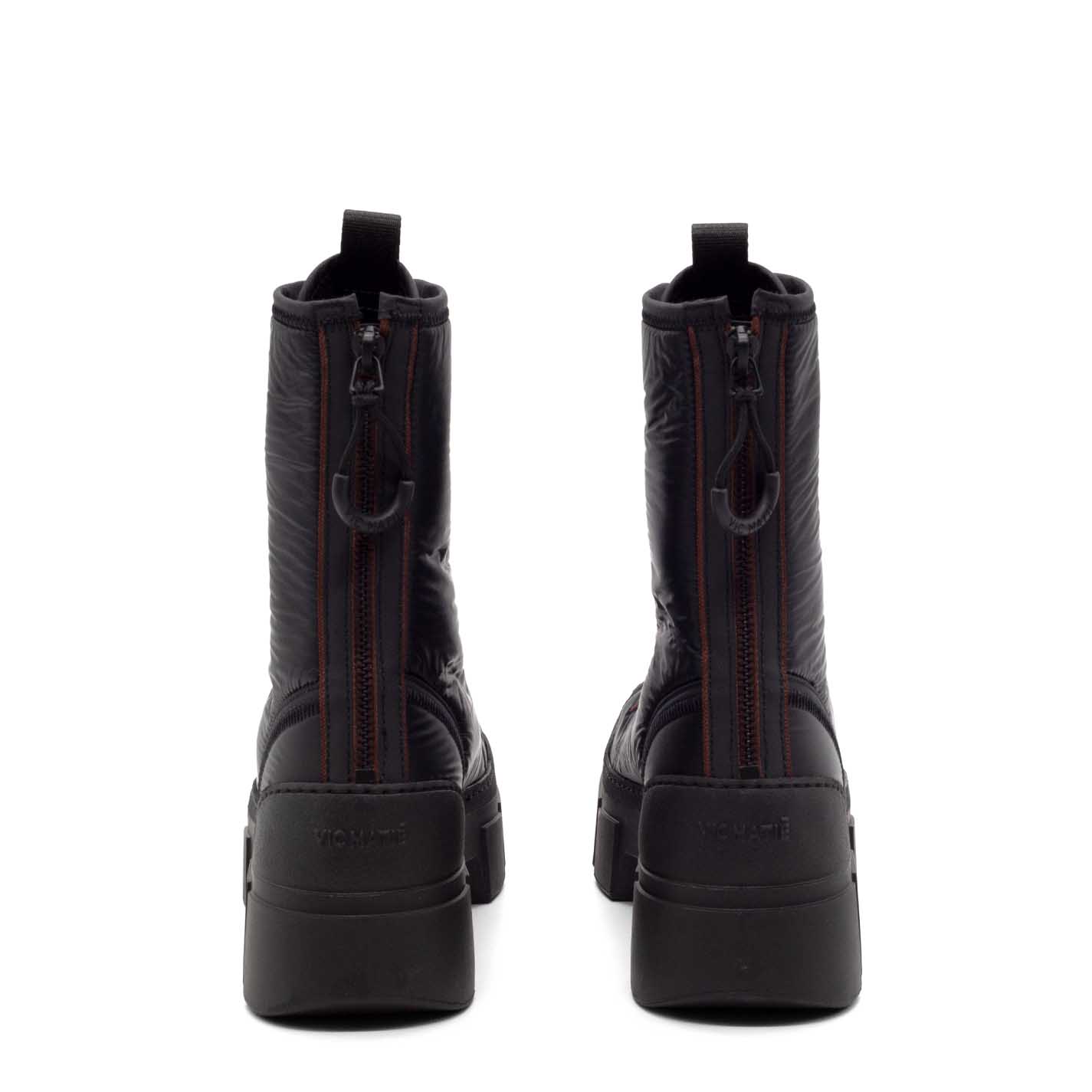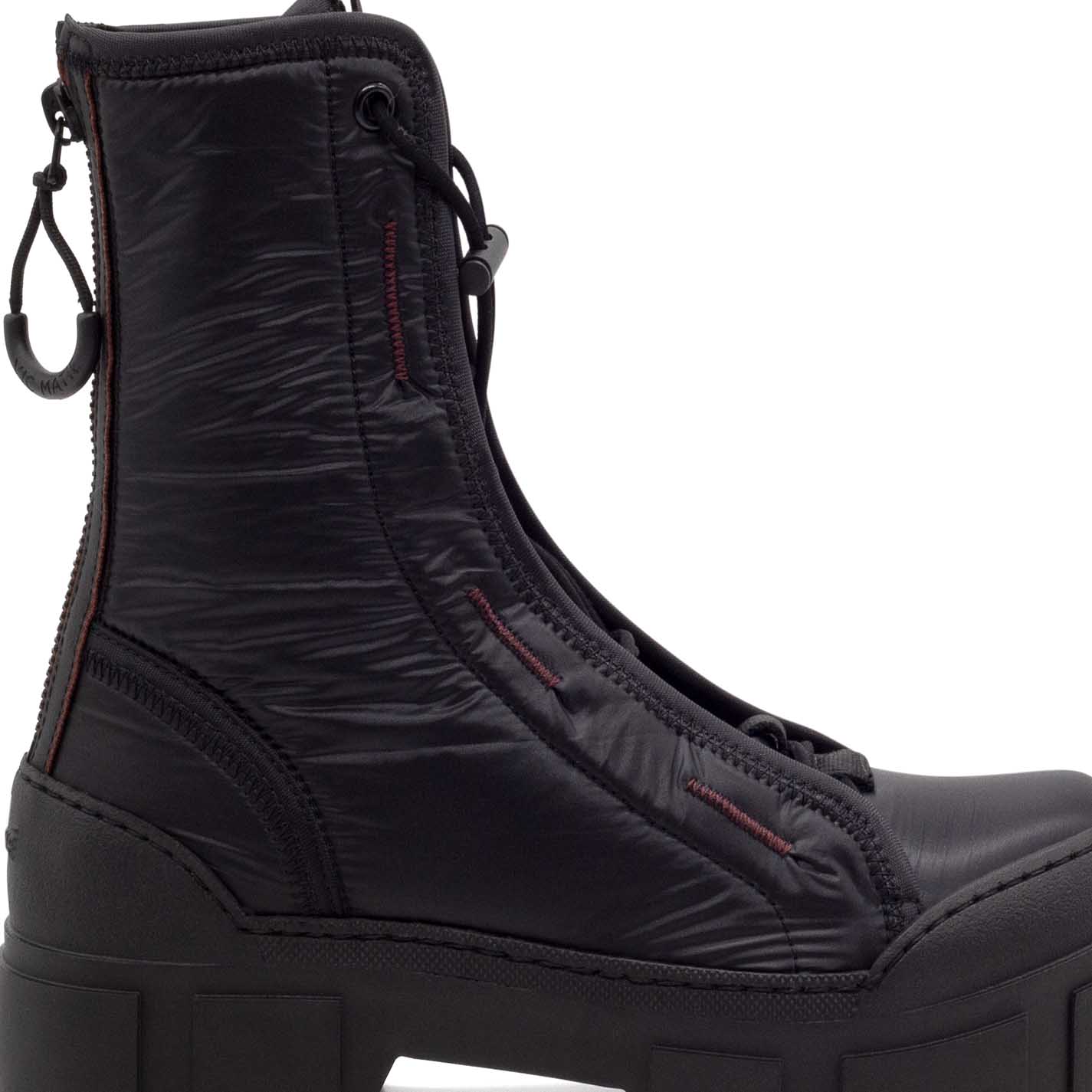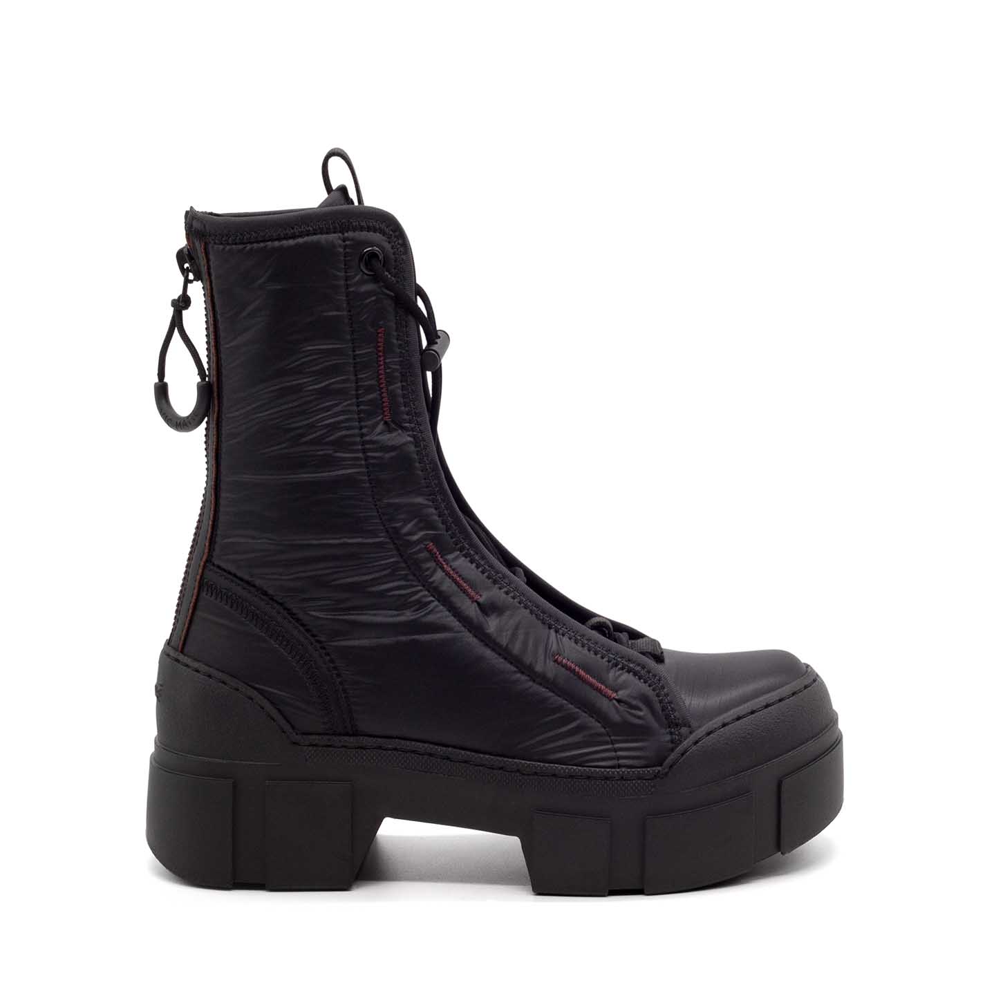 Anfibio Roccia nero/viola realizzato in nylon lucido imbottito, bordature e dettagli zig zag viola, stringa elastica regolabile con tira coulisse;