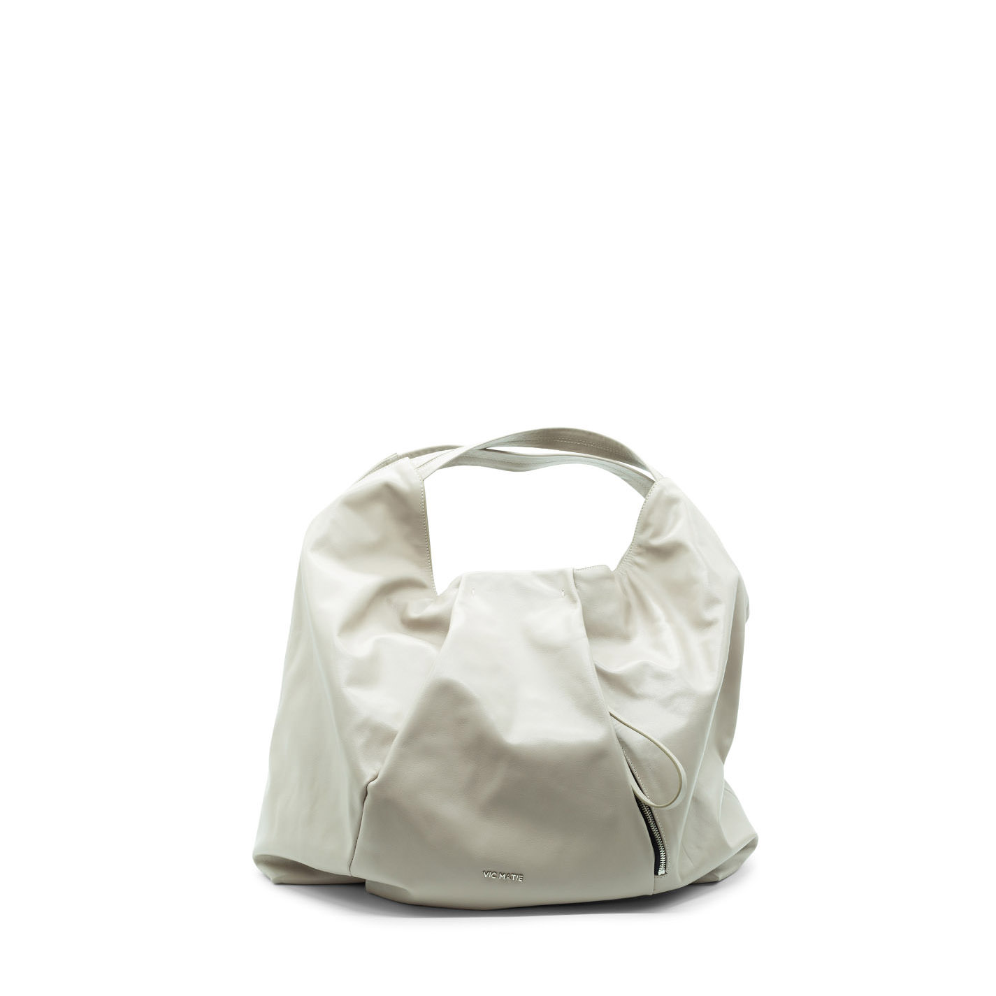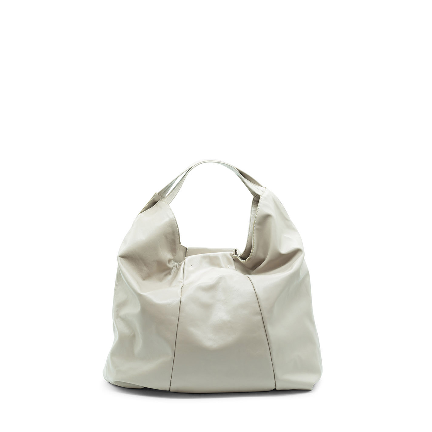 maxi shopper con pieghe tortora ,realizzata in pelle di vitello liscio, con manici in pelle e taschino nascosto sul davanti. Chiusura con automatici. Logo metallico sul davanti.