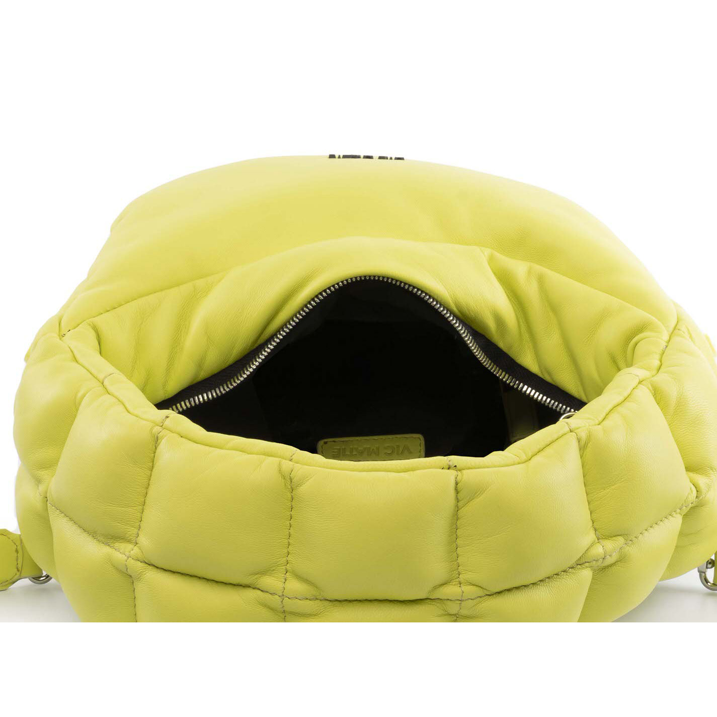 Tracolla lime mezza luna, realizzata in morbida nappa, con quadrotti imbottiti, con borchie laterali verniciate tono su tono, chiusura con zip, tracolla in pelle staccabile e regolabile. Impreziosita da logo metallico sul davanti.