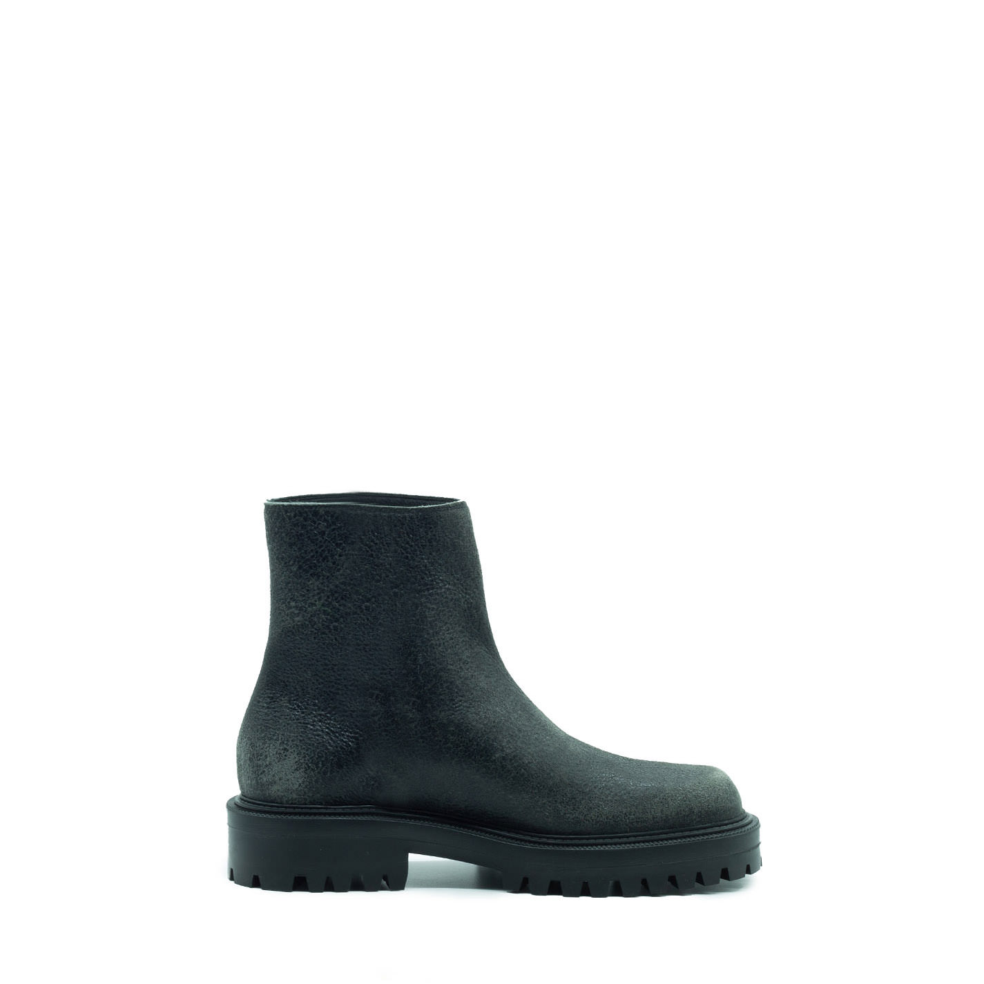 Biker car grigio realizzato in pelle effetto screpolato "punk style "anni 90, zip di metallo interna per facilitare la calzata. Suola in gomma carrarmato con finto guardolo cucito, plantare ricoperto in pelle di vitello. Made in Italy.