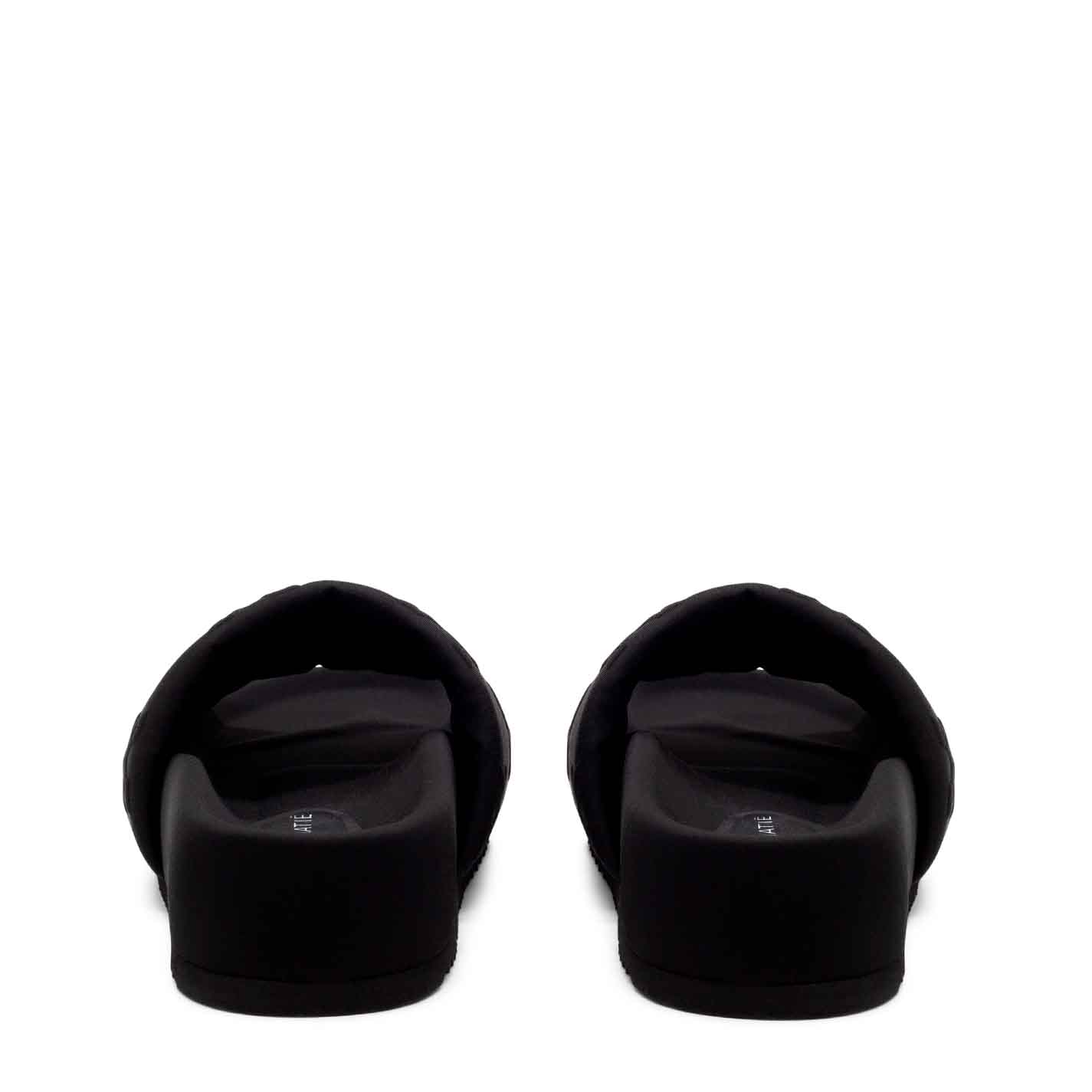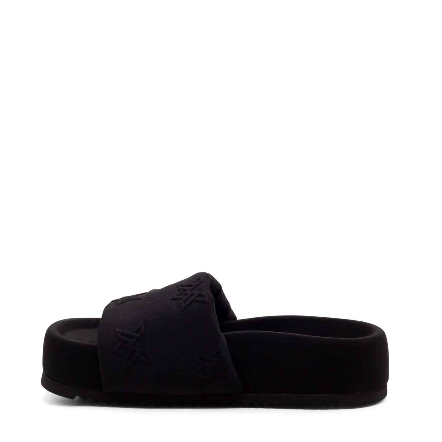 Bubble ciabatta flatform in lycra nera imbottita, con lavorazione di monogrammi a rilievo. Fusbet ricoperto in lycra tono su tono con la tomaia. Suola in gomma dentellata. Made in Italy.