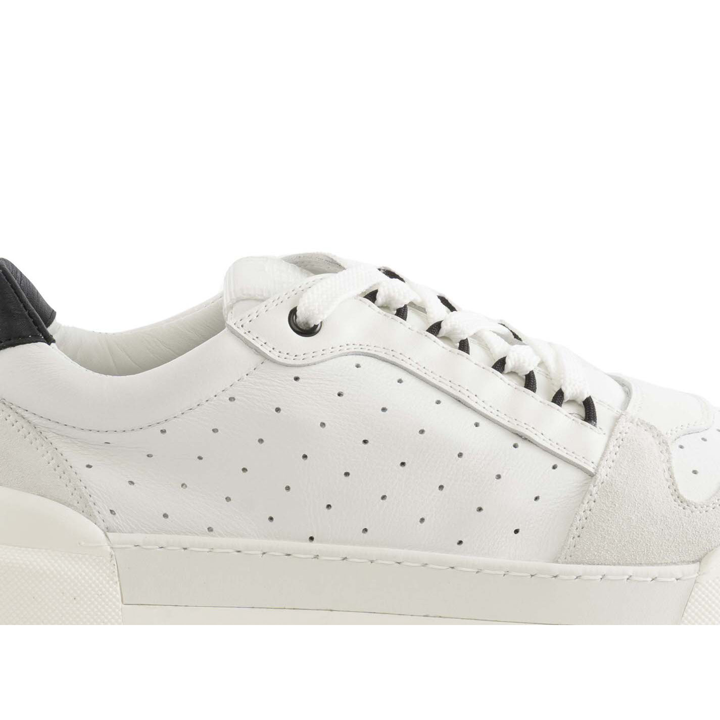 Cassetta sneakers bianca/nera realizzata in crosta e pelle traforata su punte e gambetti laterali, interamente sfoderata, con spoiler a contrasto. Suola a cassetta cucita, con riporto in pelle e comodo plantare in pelle di vitello. Made in Italy.