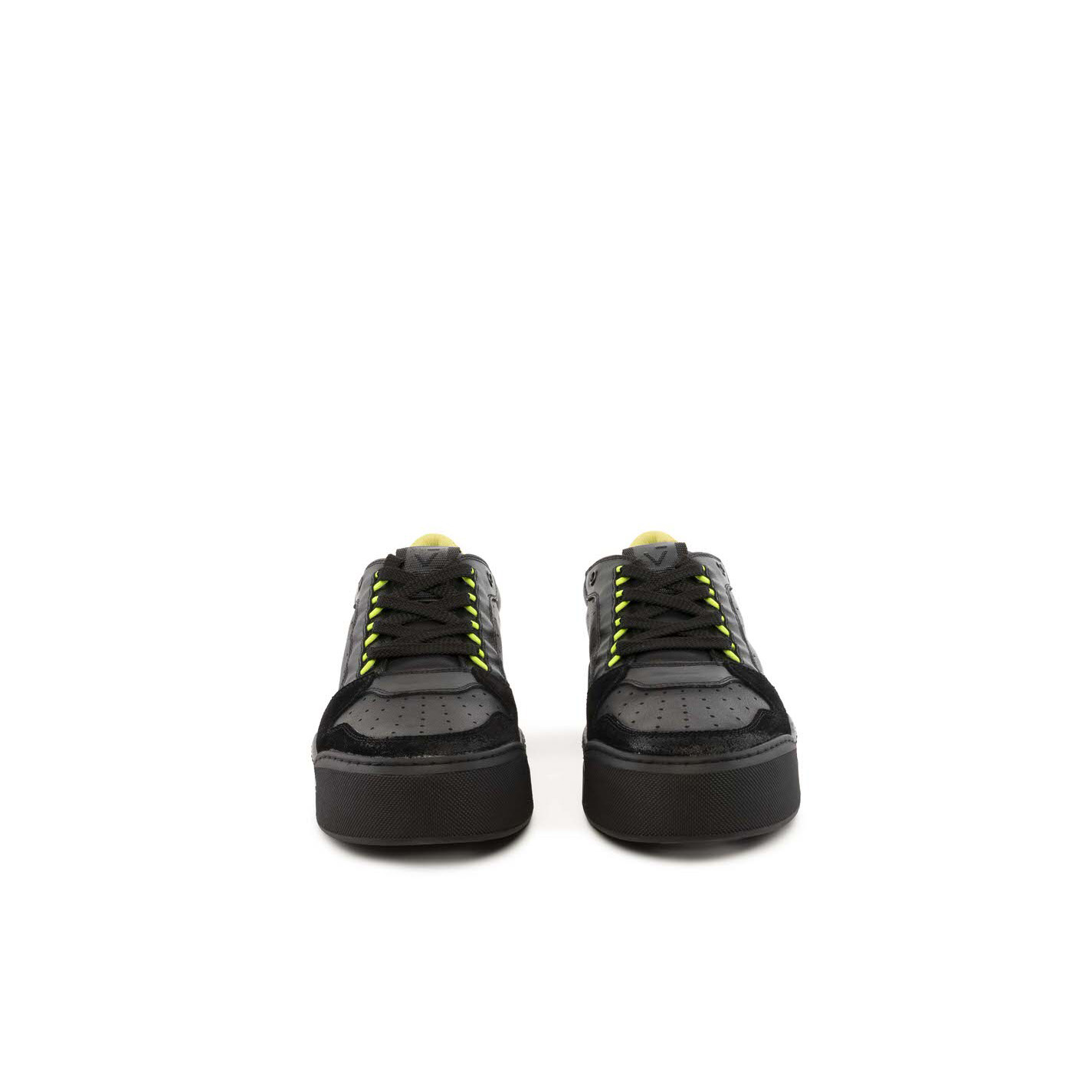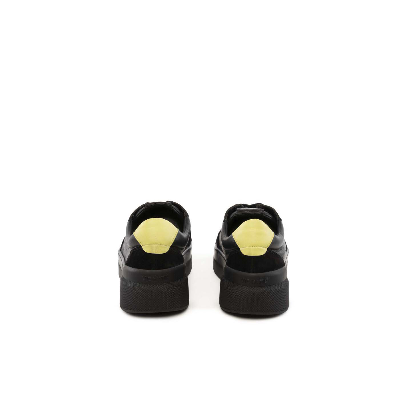 Cassetta sneakers nera/lime realizzata in crosta e pelle traforata su punte e gambetti laterali, interamente sfoderata, con spoiler e passa laccia contrasto. Suola a cassetta cucita, con riporto in pelle e comodo plantare in pelle di vitello. Made in Italy.