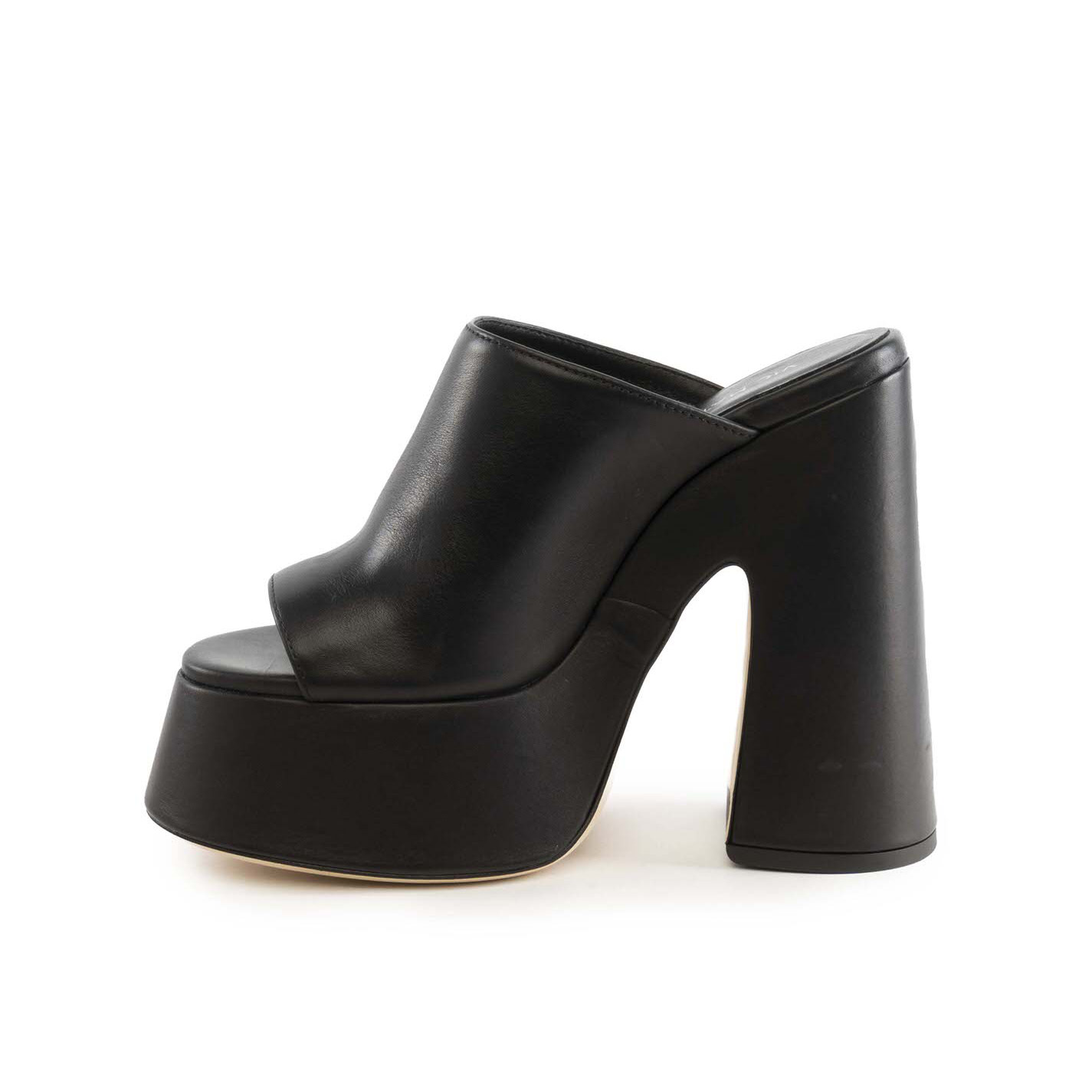 Ciabatta plateau Flare nera in pelle di vitello opaco liscia. Suola in cuoio ,plateau monoblocco ricoperto pelle dalla linea "scampanata". Made in Italy.