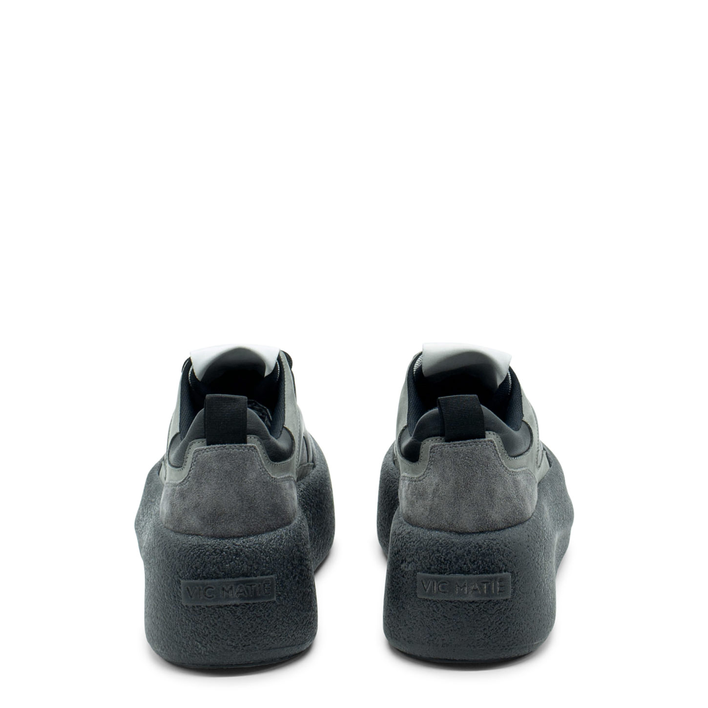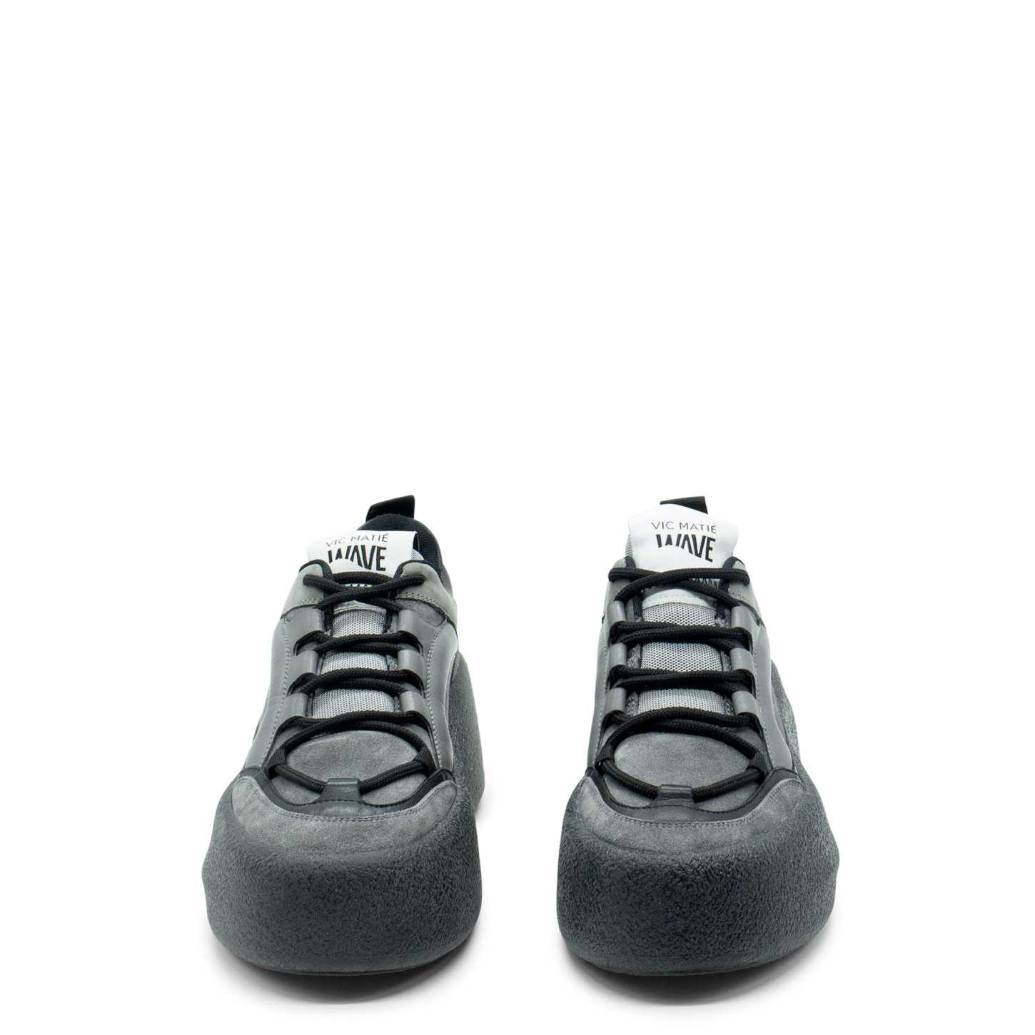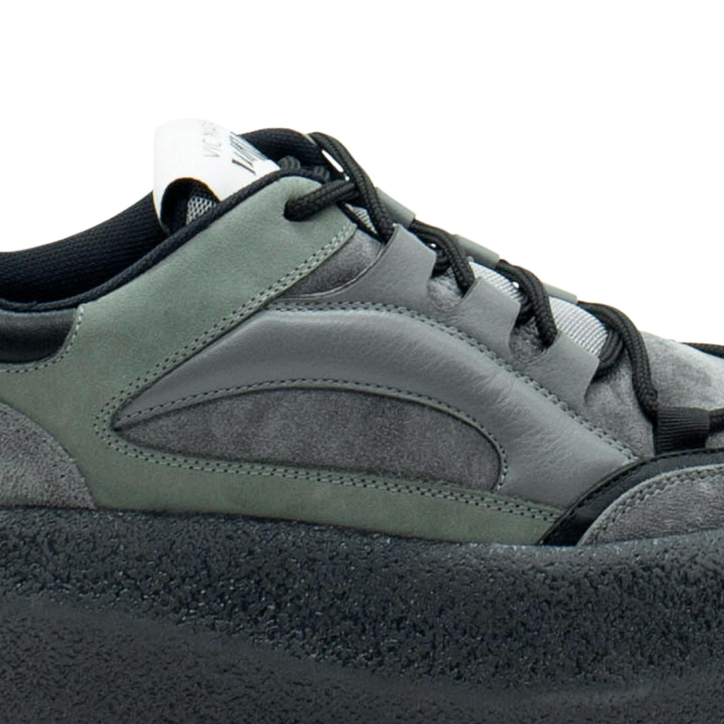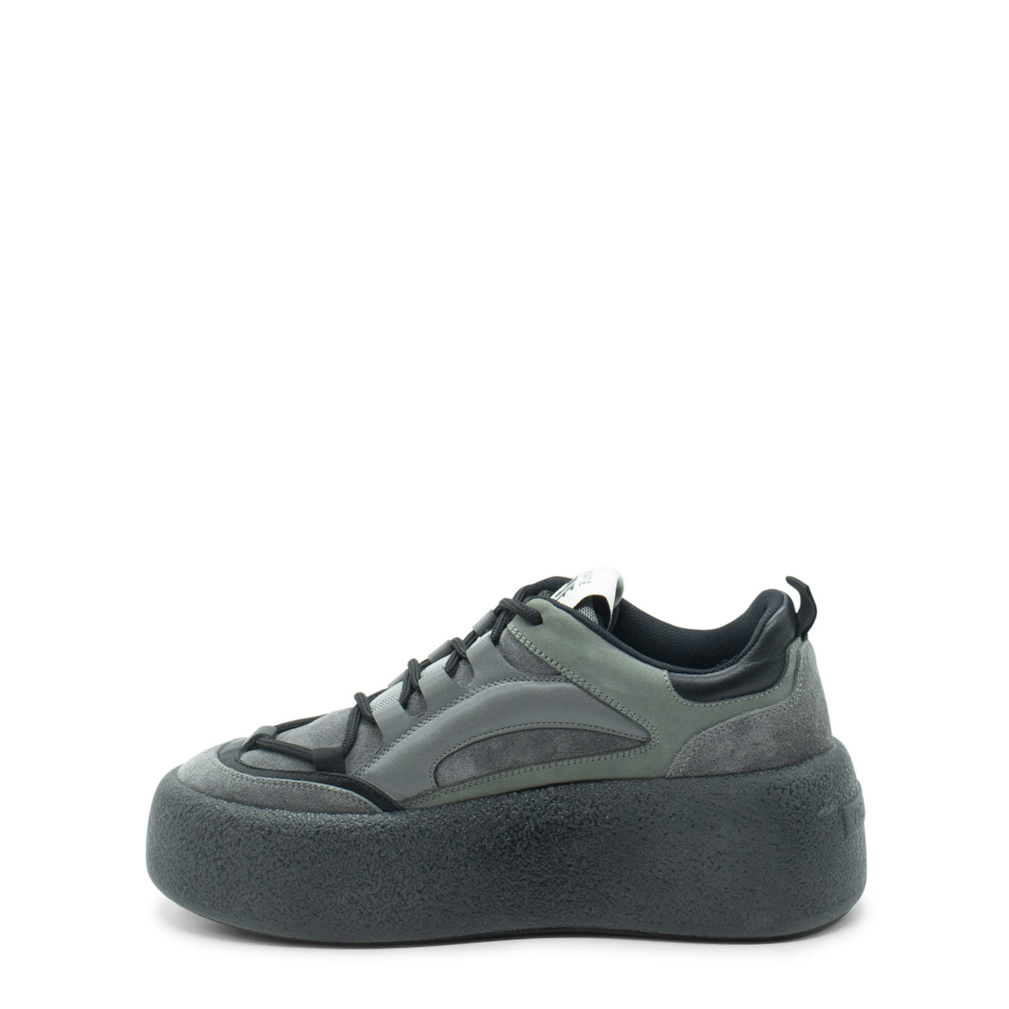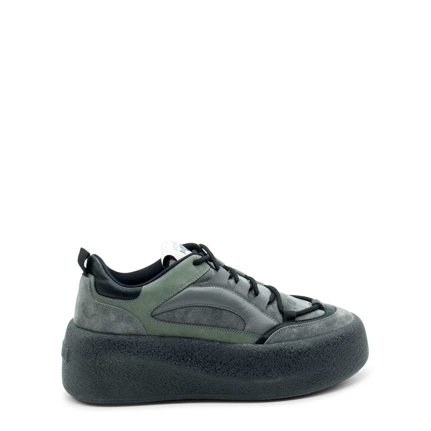 Creepy sneakers grigia/nera realizzata in crosta e nabuk con riporti in pelle tono su tono e spoiler a contrasto. Platform in para con leggera sporgenza esterna. Morbido plantare ricoperto pelle. Made in Italy.