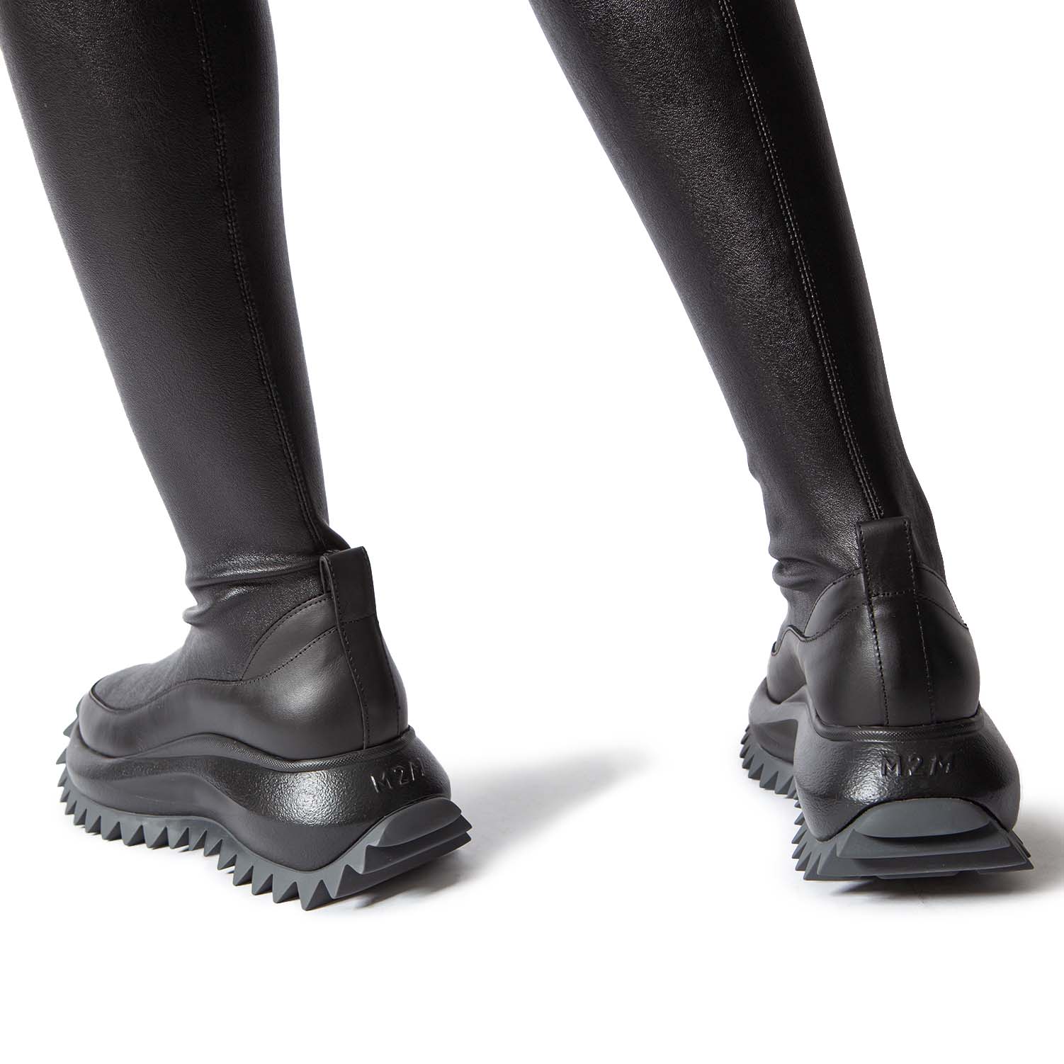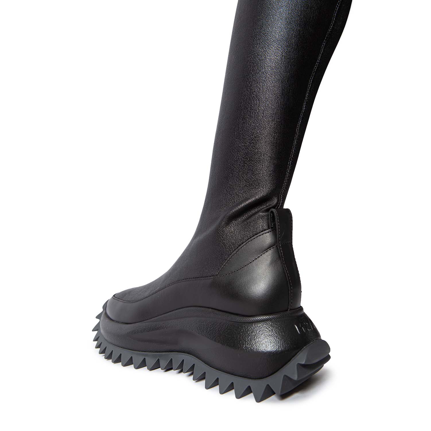 D22 Running-Cuissardes ecopelle stretch nera,gambale slanciato ed aderente fino a sopra il ginocchio. Suola monoblocco xl extralight,logata con riporto in gomma e battistrada con maxi spikes, plantare anatomico rivestito in puro cotone. Made in Italy.