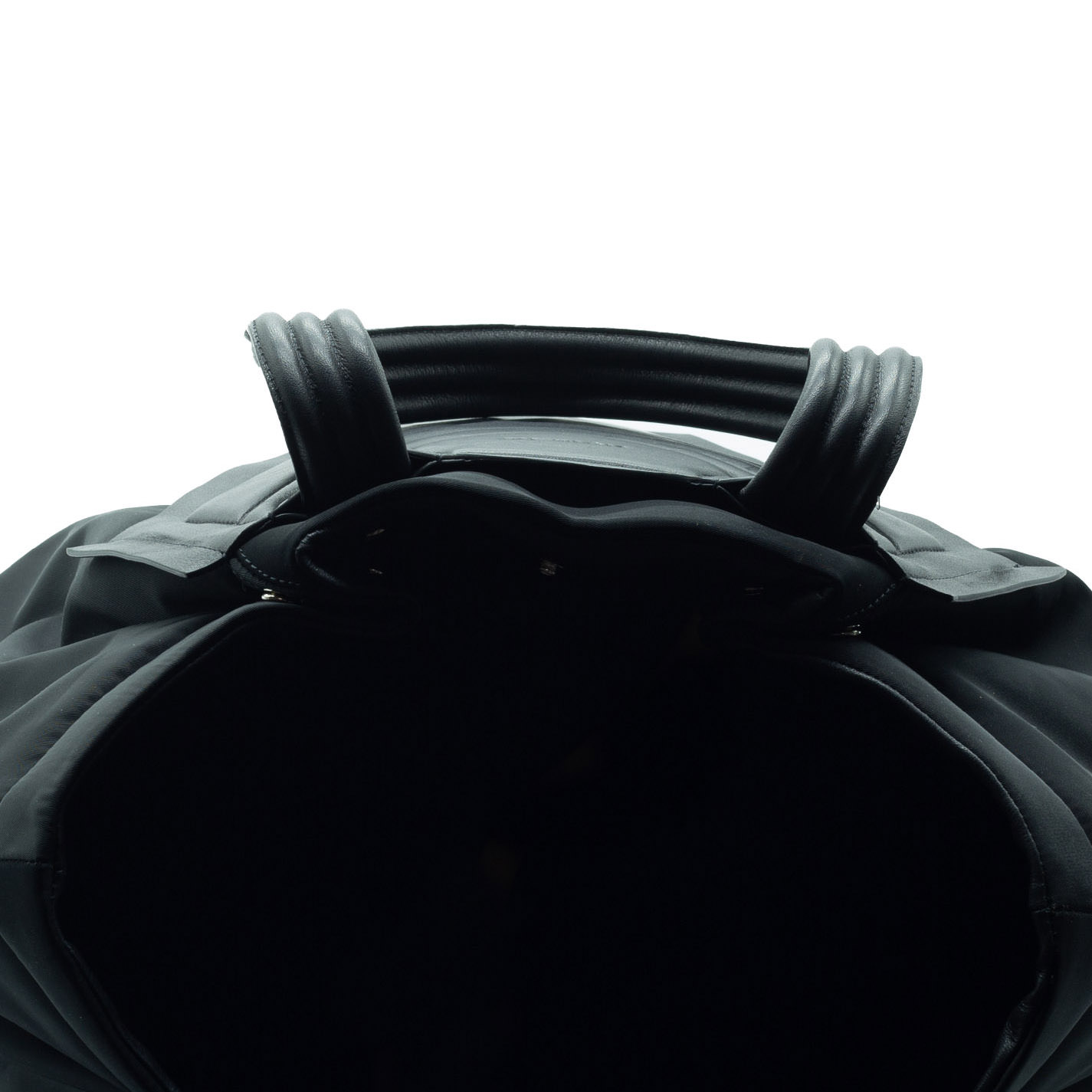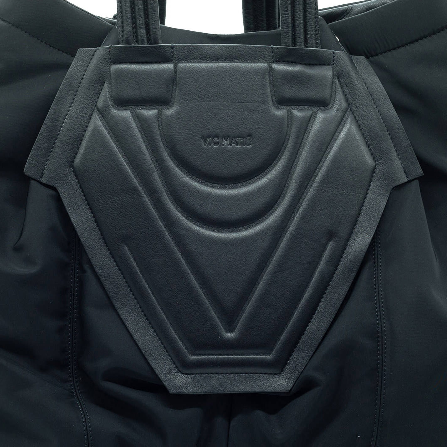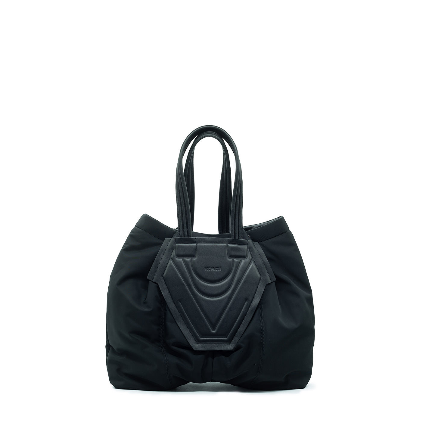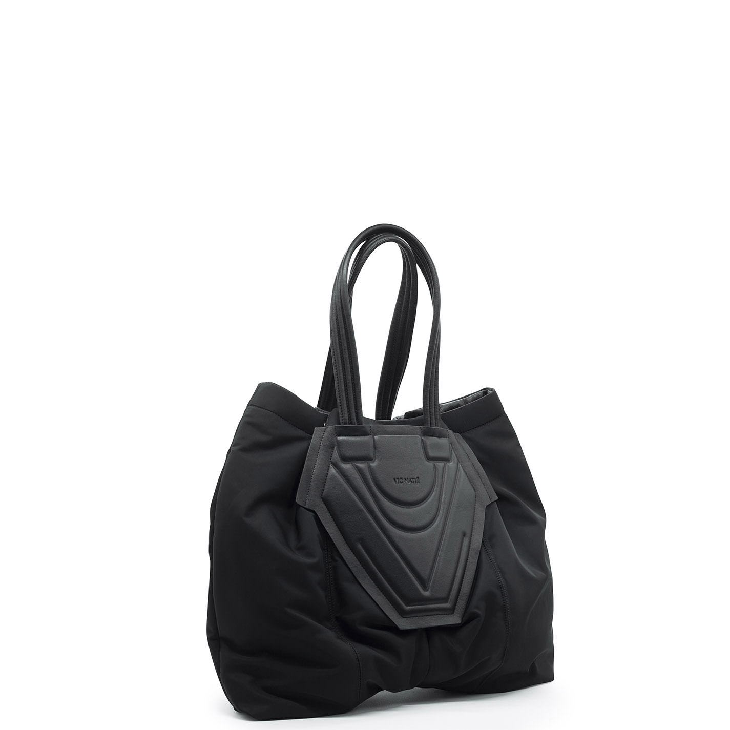 Borsa nera realizzata in nylon e morbida nappa di vitello. Sul davanti motivo di incisioni e rilievi, chiusura con automatici-Lunghi manici impunturati, tasche zippate laterali con laccetti in pelle pendenti.