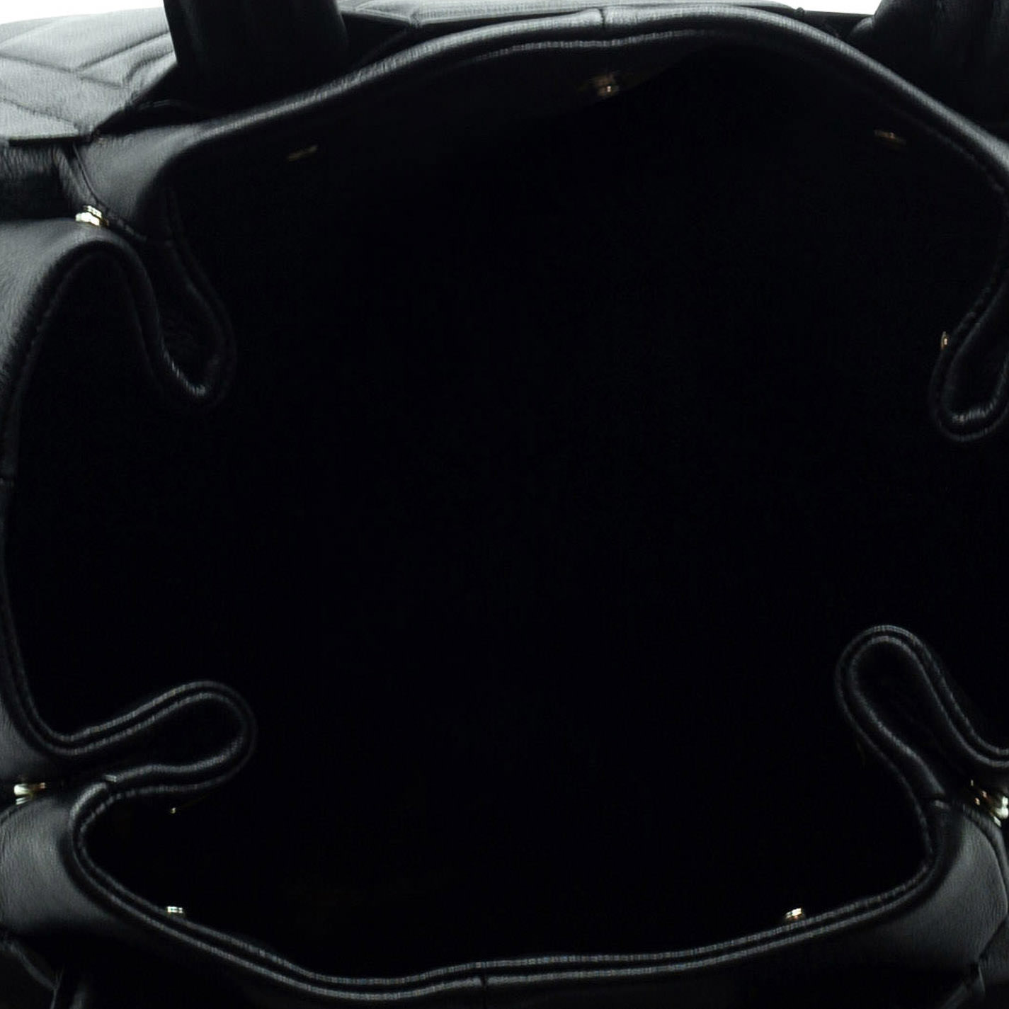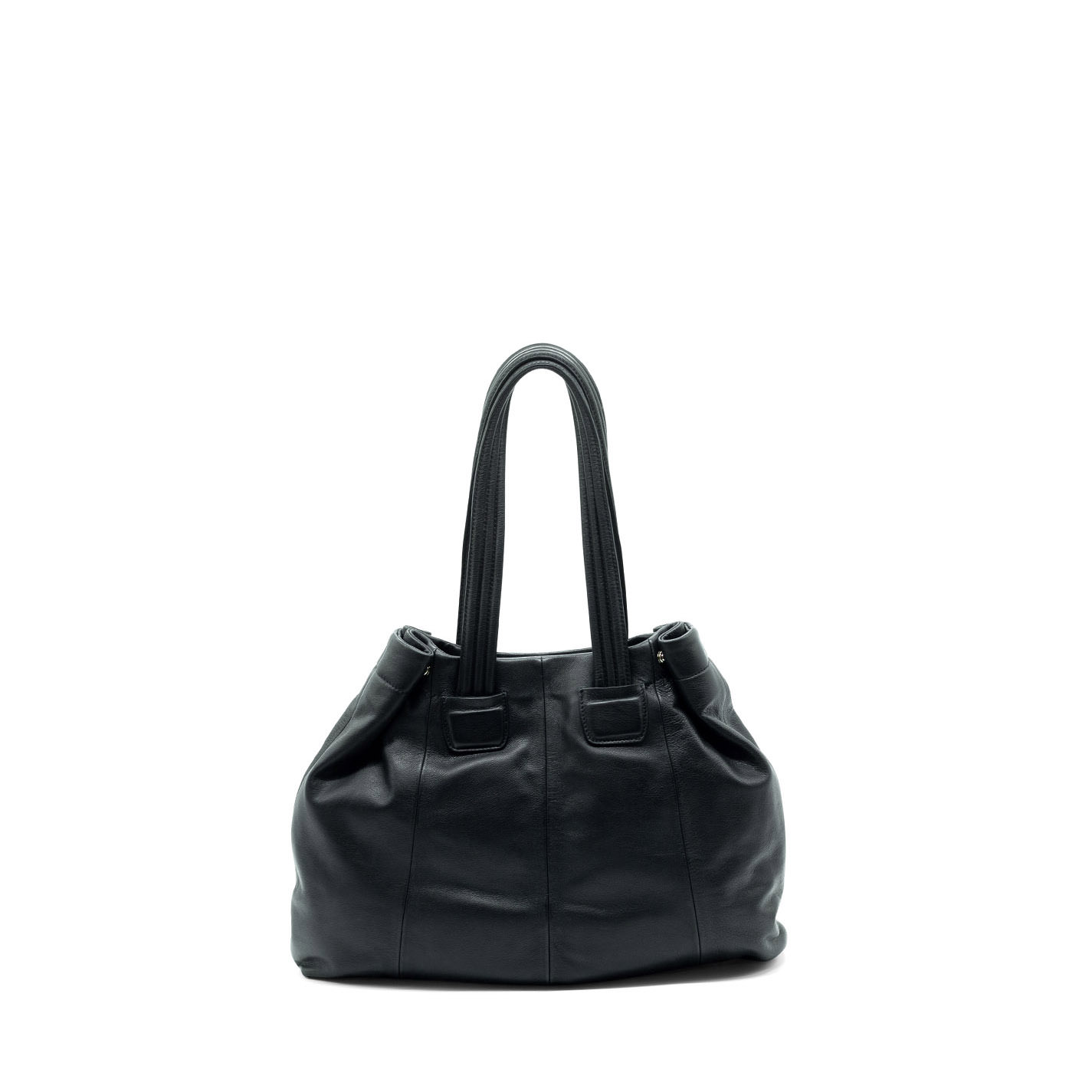 Borsa nera realizzata in morbida nappa di vitello. Sul davanti motivo di incisioni e rilievi, chiusura con automatici-Lunghi manici impunturati, tasche zippate laterali con laccetti in pelle pendenti.