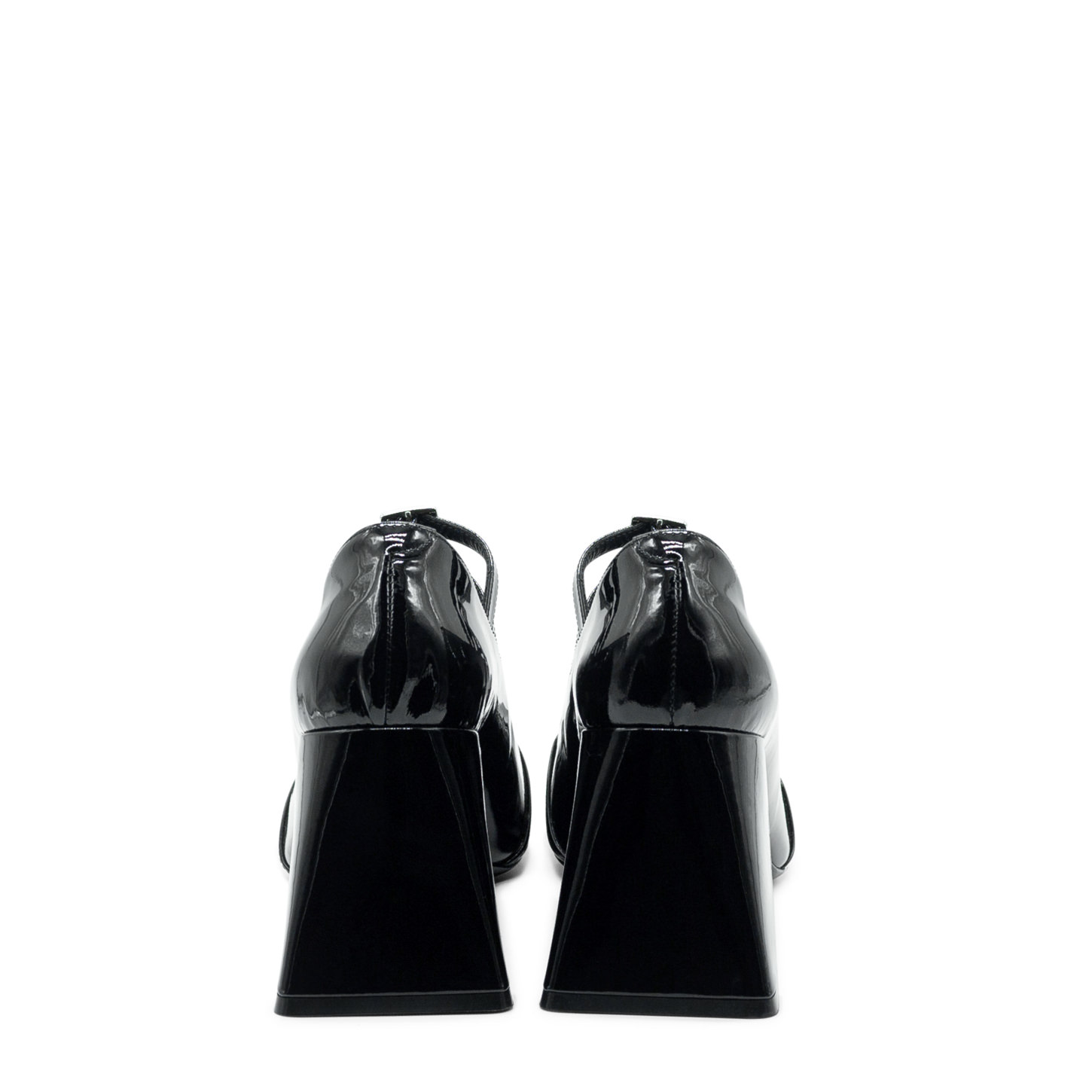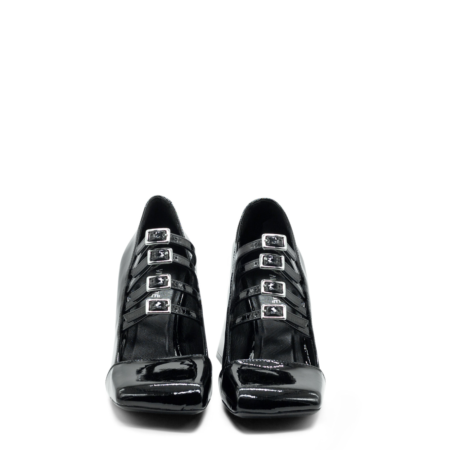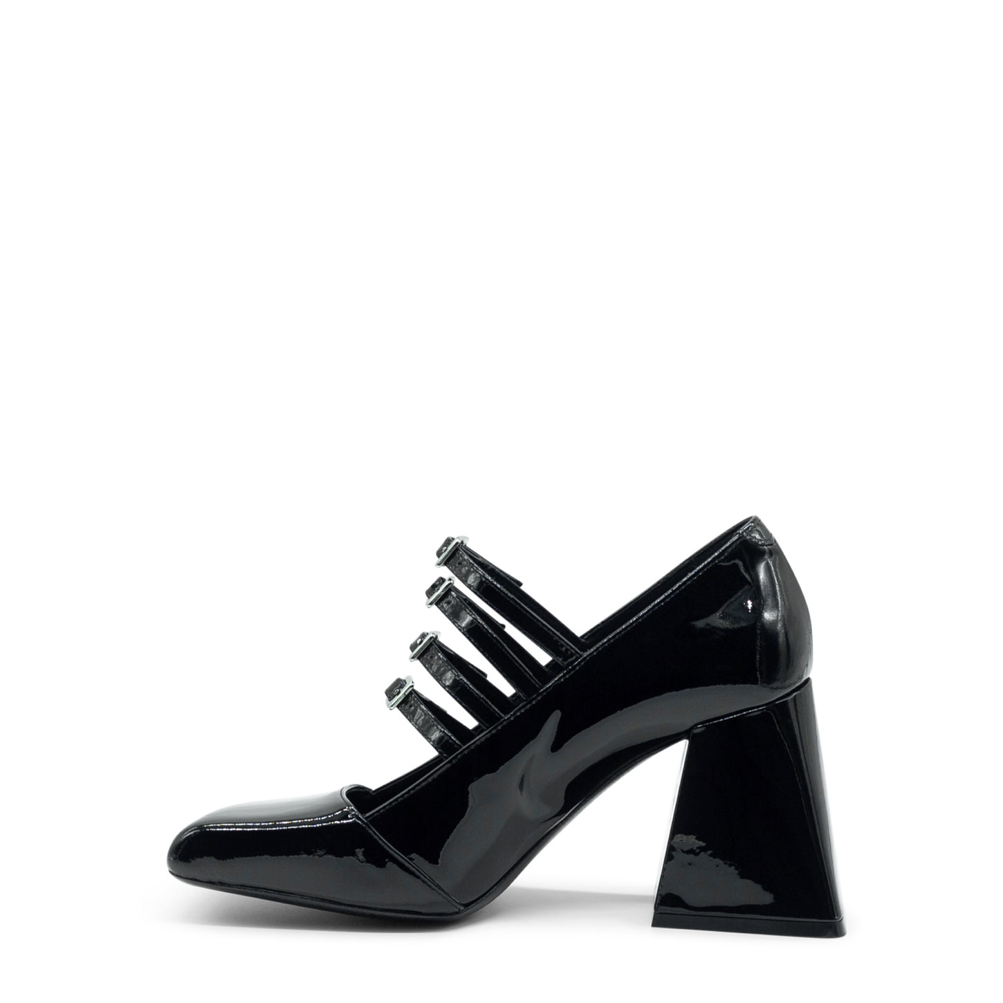 Decolleté ming in vernice nera ,con 4 cinturini regolabili da fibbie. Suola in cuoio, tacco squadrato a campana fasciato pelle, punta assimmetrica.Made in Italy.
