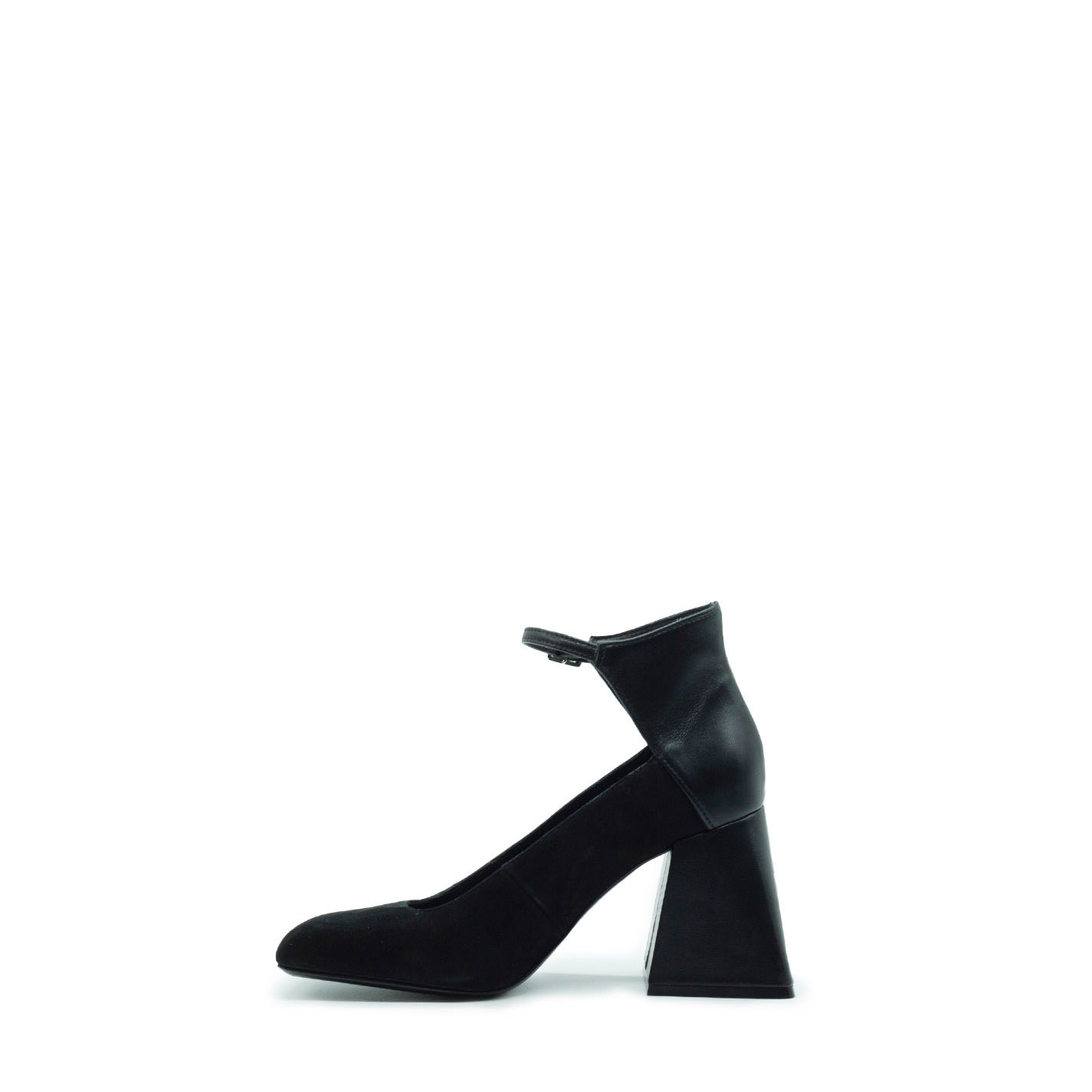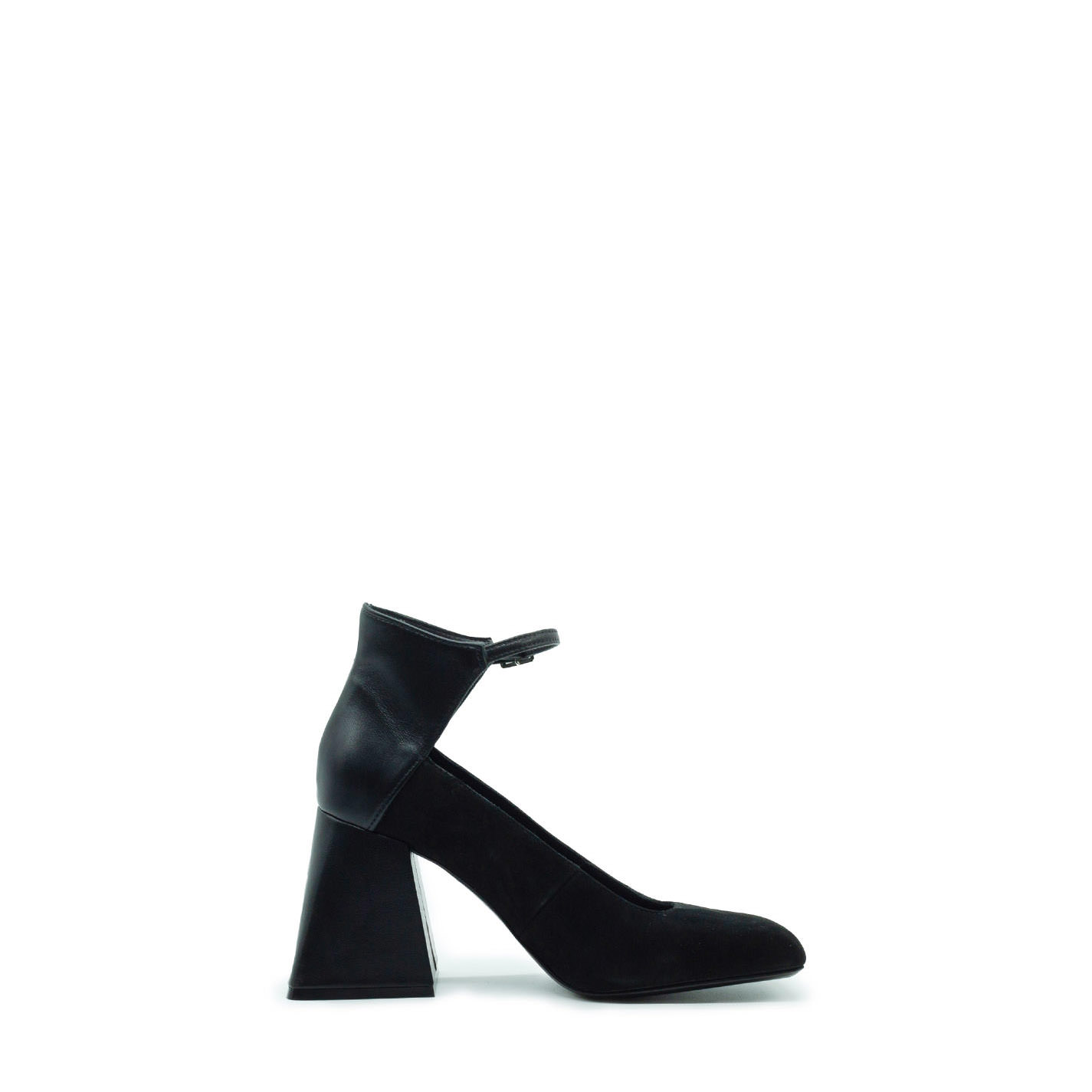 Decolleté ming nera in camoscio e nappa, cinturino regolabile con fibbia, scollo squadrato. Suola in cuoio, tacco squadrato a campana fasciato pelle, punta assimmetrica.Made in Italy.