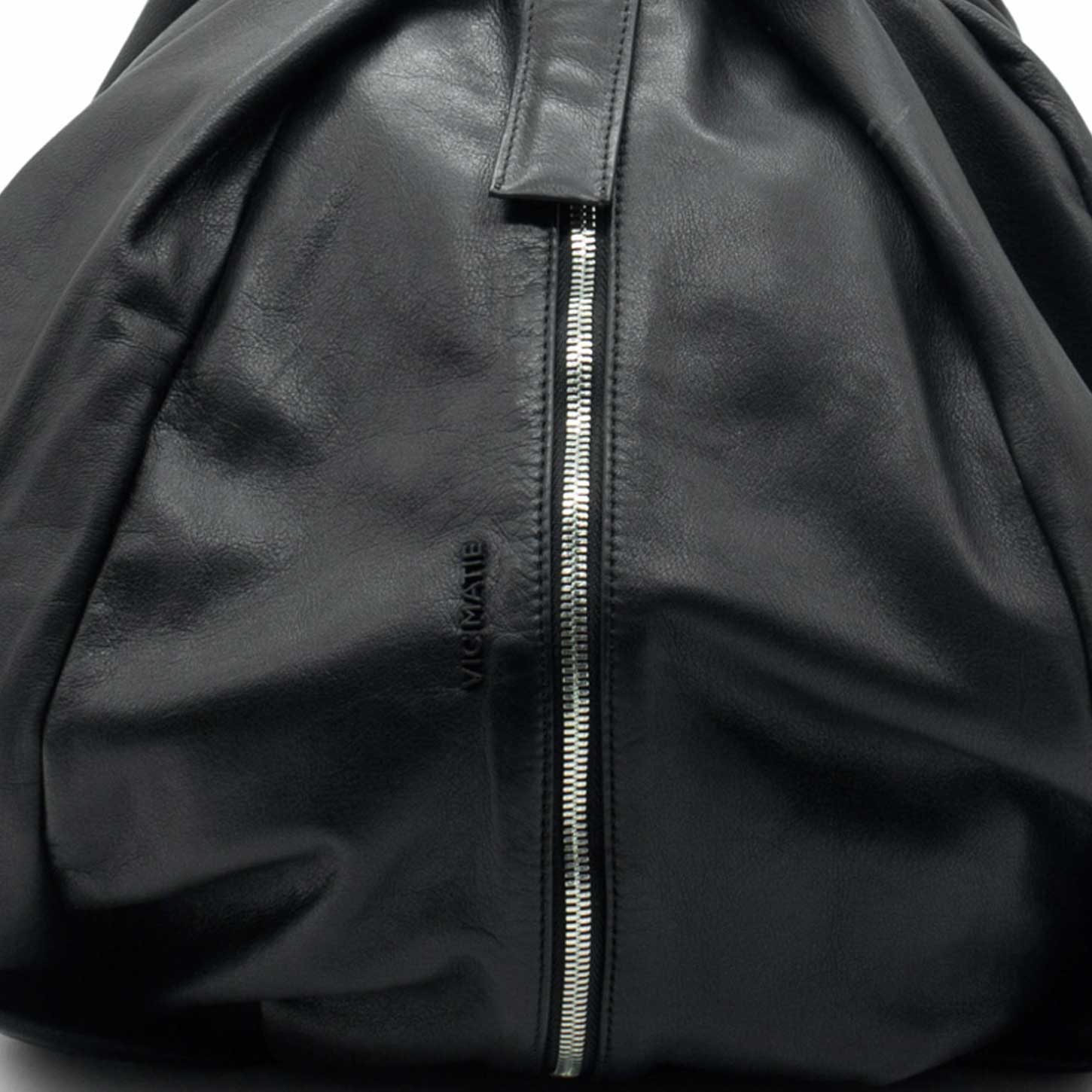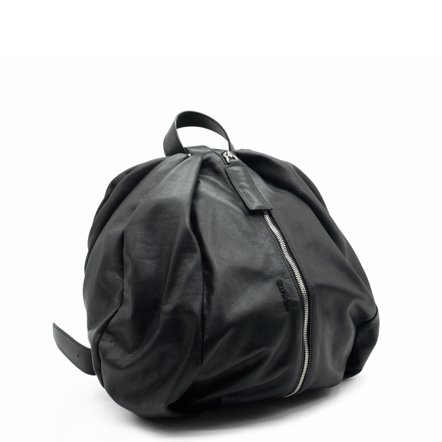Zaino con pieghe nero ,realizzato in morbida nappa di vitello lavorata. Chiusura verticale sul davanti con maxi zip metallica;