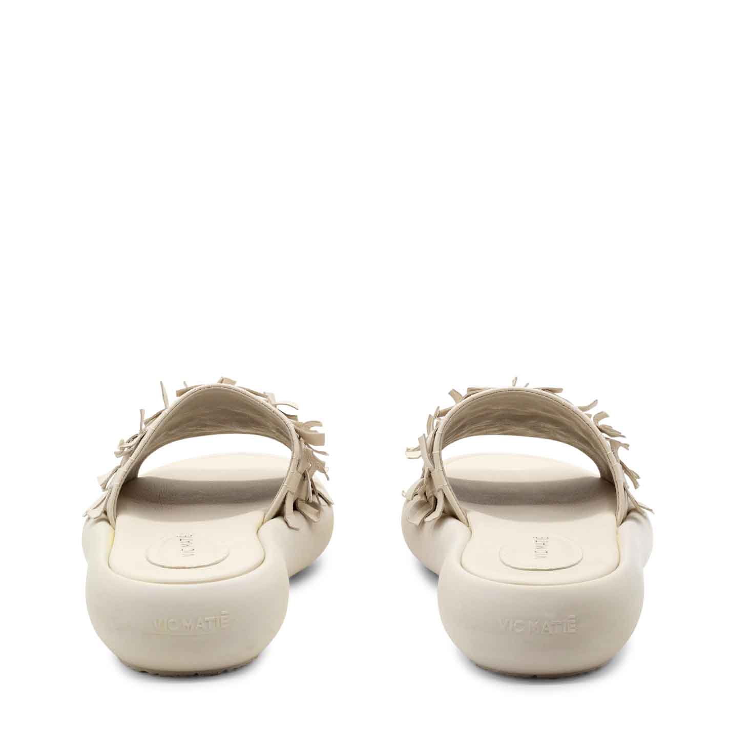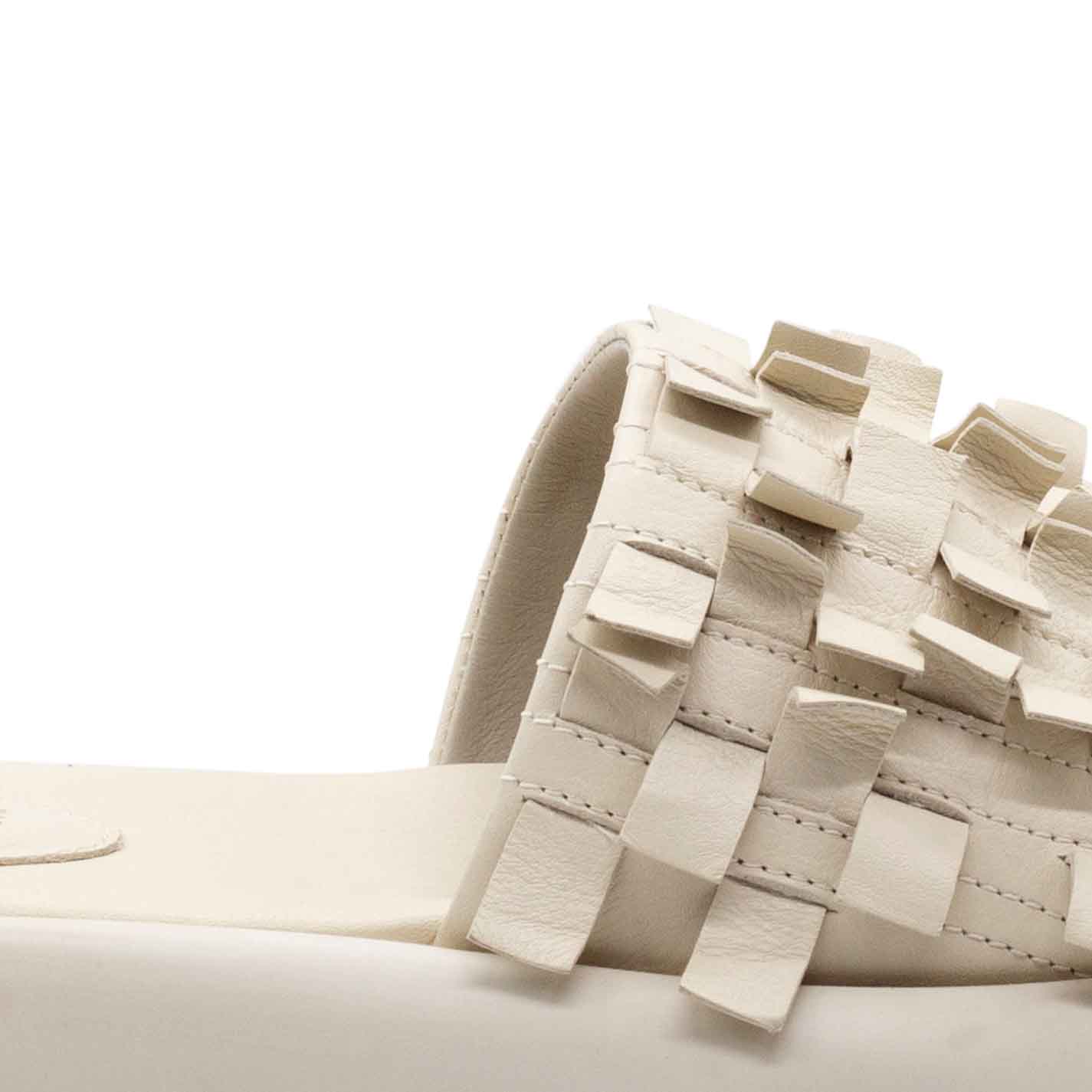 Donut ciabatta frangia avorio realizzata in morbida nappa di vitello nera, effetto intreccio sfrangiato. Suola in gomma leggera dalla forma bombata, con fusbet confort ricoperto in pelle. Made in Italy.