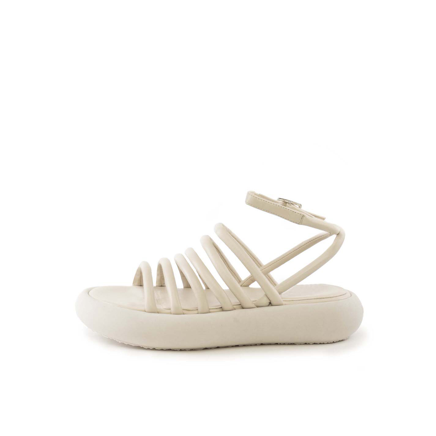 Donut sandalo panna interamente realizzato con piccoli tubolari imbottiti in nappa di vitello, cinturino posteriore regolabile. Suola in gomma leggera dalla forma bombata, con fusbet confort ricoperto in pelle. Made in Italy.
