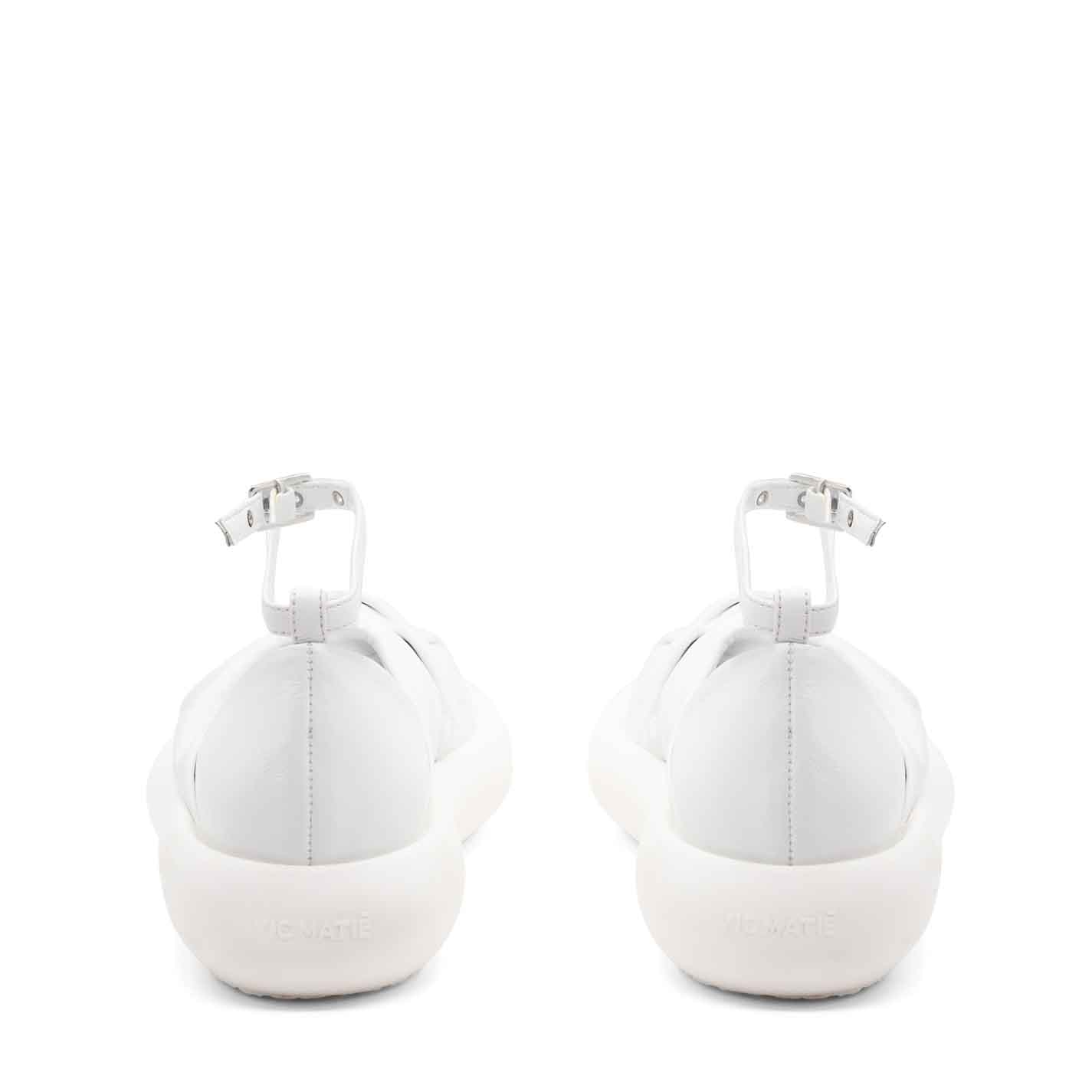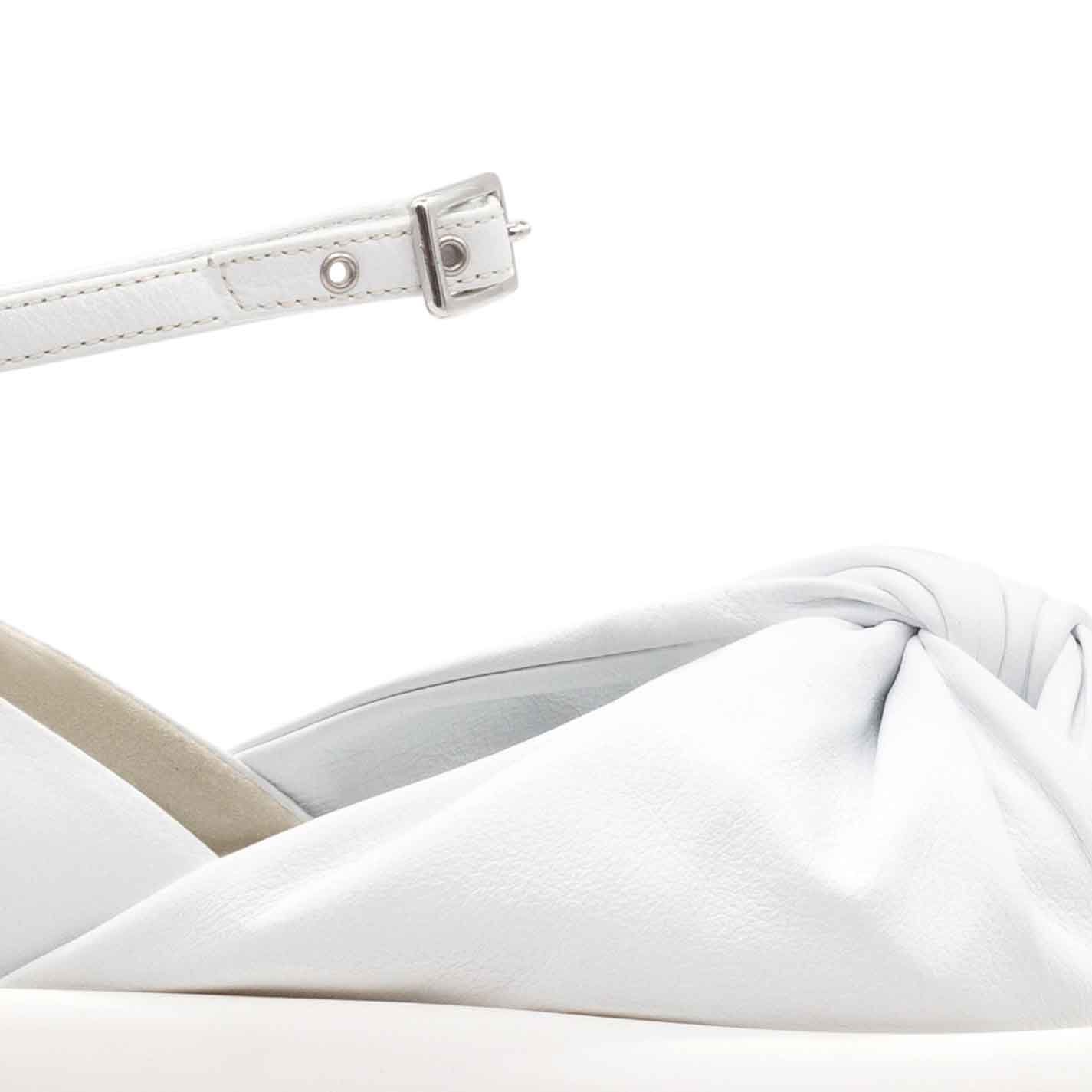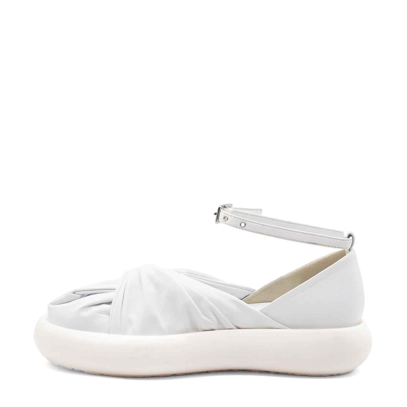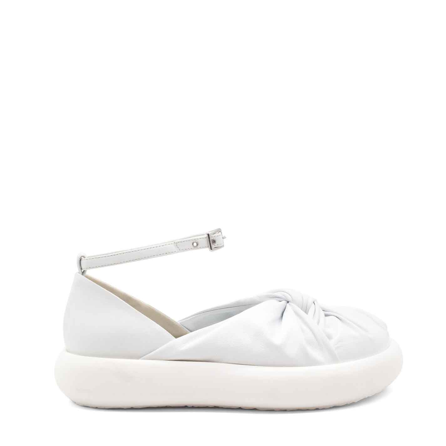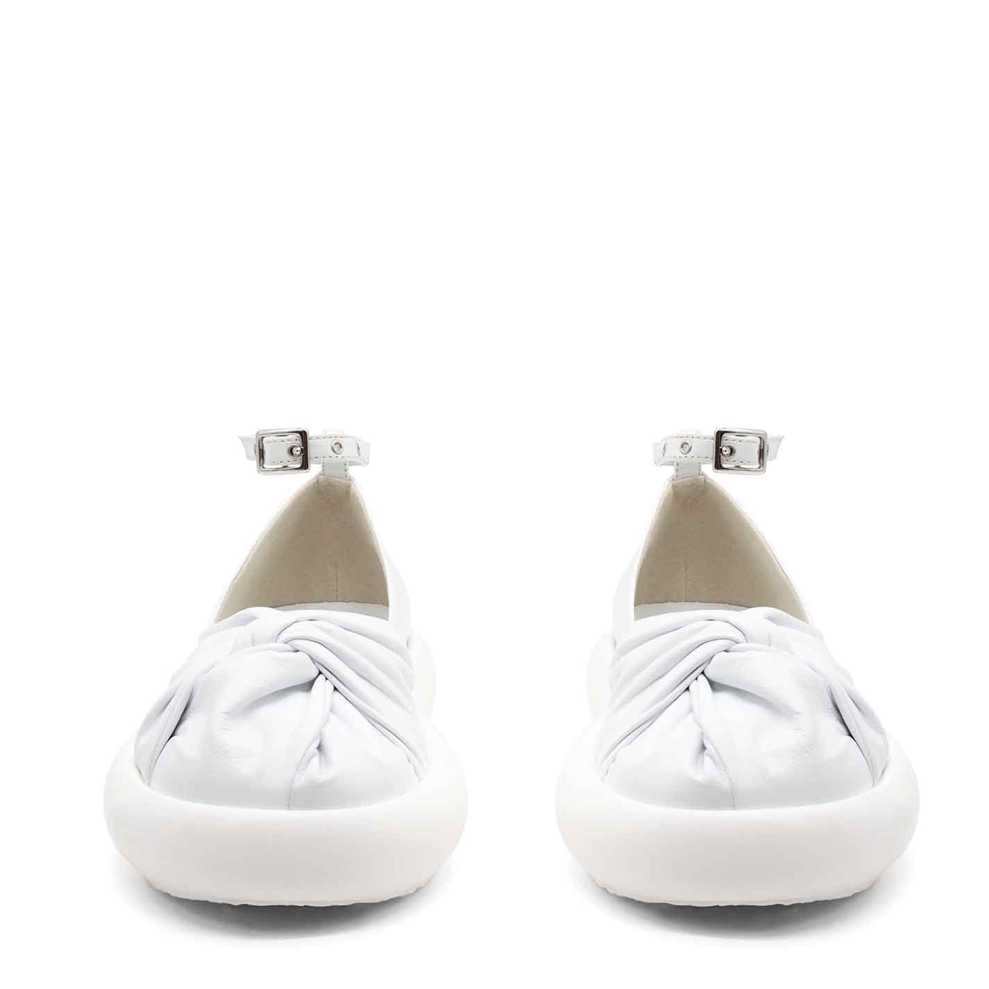 Donut scarpa fusciacca bianca ,realizzata in morbida nappa di vitello annodata sulla punta, con cinturino regolabile ed estraibile alla caviglia. Suola in gomma leggera dalla forma bombata, con plantare ricoperto in pelle. Made in Italy.