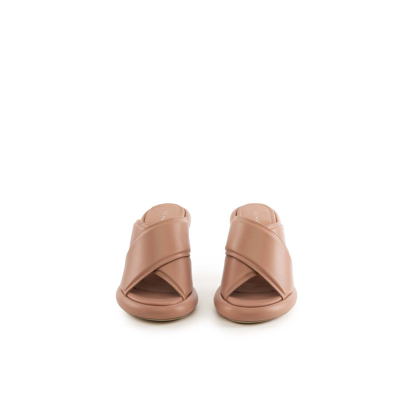 Dosh Ciabatta incrociata rosa antico ,realizzata con fasce a rilievo e sovrapposte in morbida nappa. Suola in cuoio, plateau bombato ricoperto in pelle, con tacco verniciato matt che ricorda la "slash". Sottopiede confort ricoperto pelle. Made in Italy.