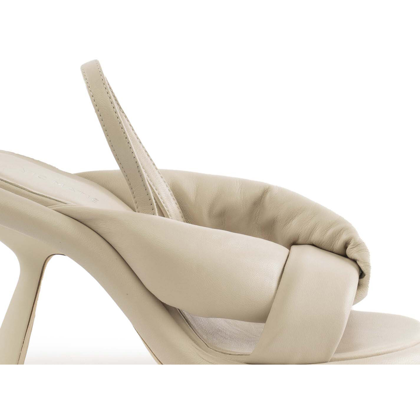 Dosh sandalo japan panna realizzato da maxi tubolari imbottiti incrociati, in morbida nappa, con elastico posteriore ricoperto in pelle. Suola in cuoio, plateau bombato ricoperto in pelle, con tacco verniciato matt che ricorda la "slash". Sottopiede confort ricoperto pelle. Made in Italy.
