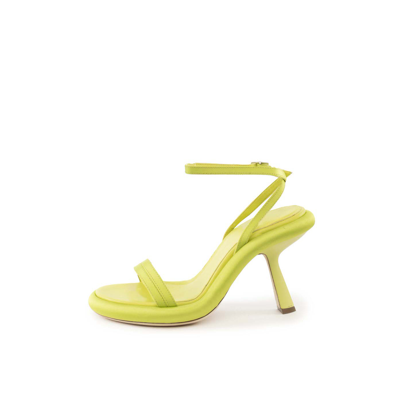 Dosh sandalo raso lime realizzato interamente da listini sul davanti e che incrociano alla caviglia, cinturino regolabile. Suola in cuoio, plateau bombato ricoperto in pelle, con tacco verniciato matt che ricorda la "slash". Sottopiede confort ricoperto pelle. Made in Italy.