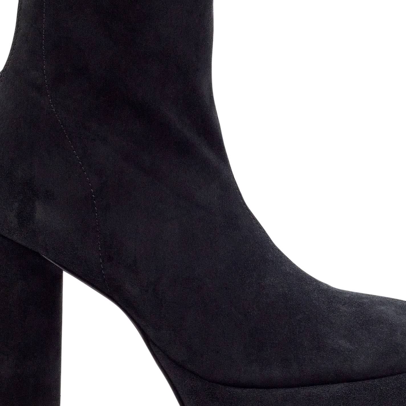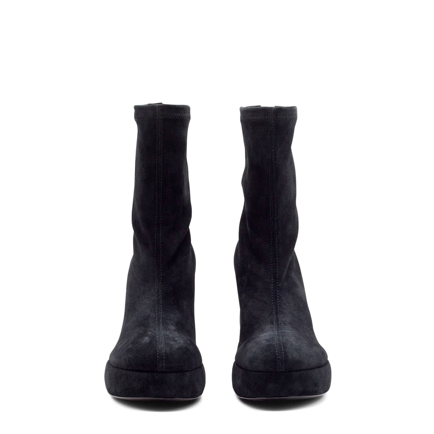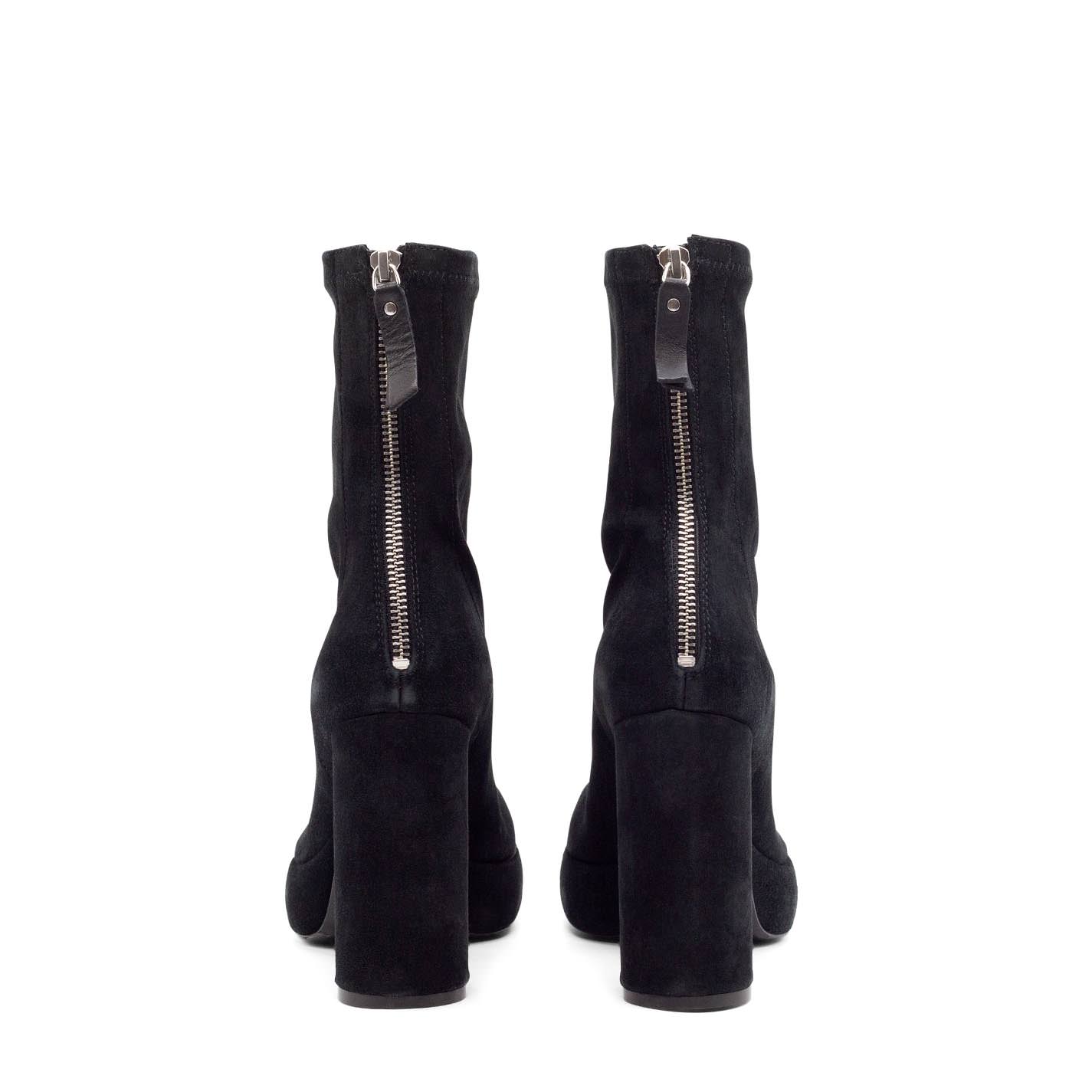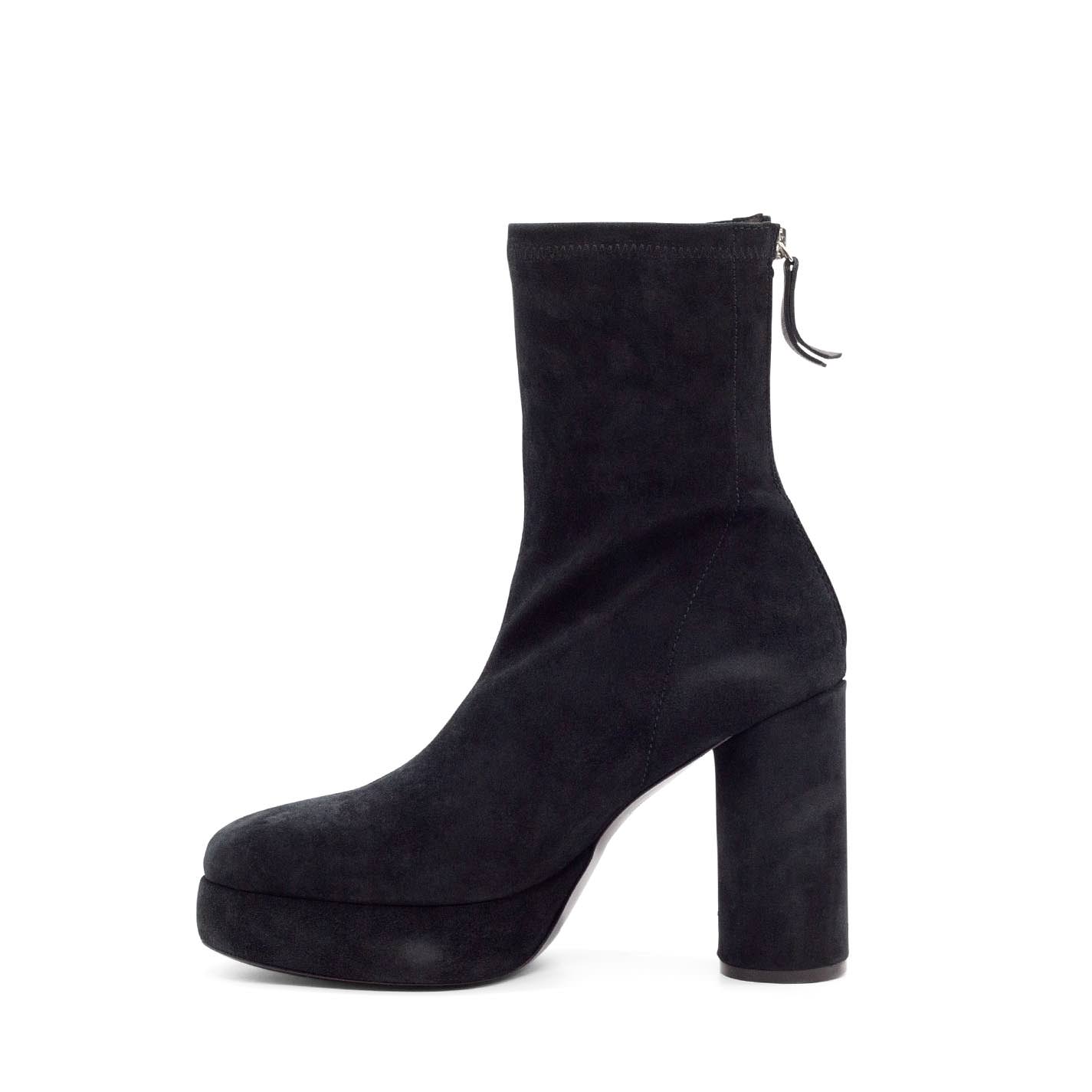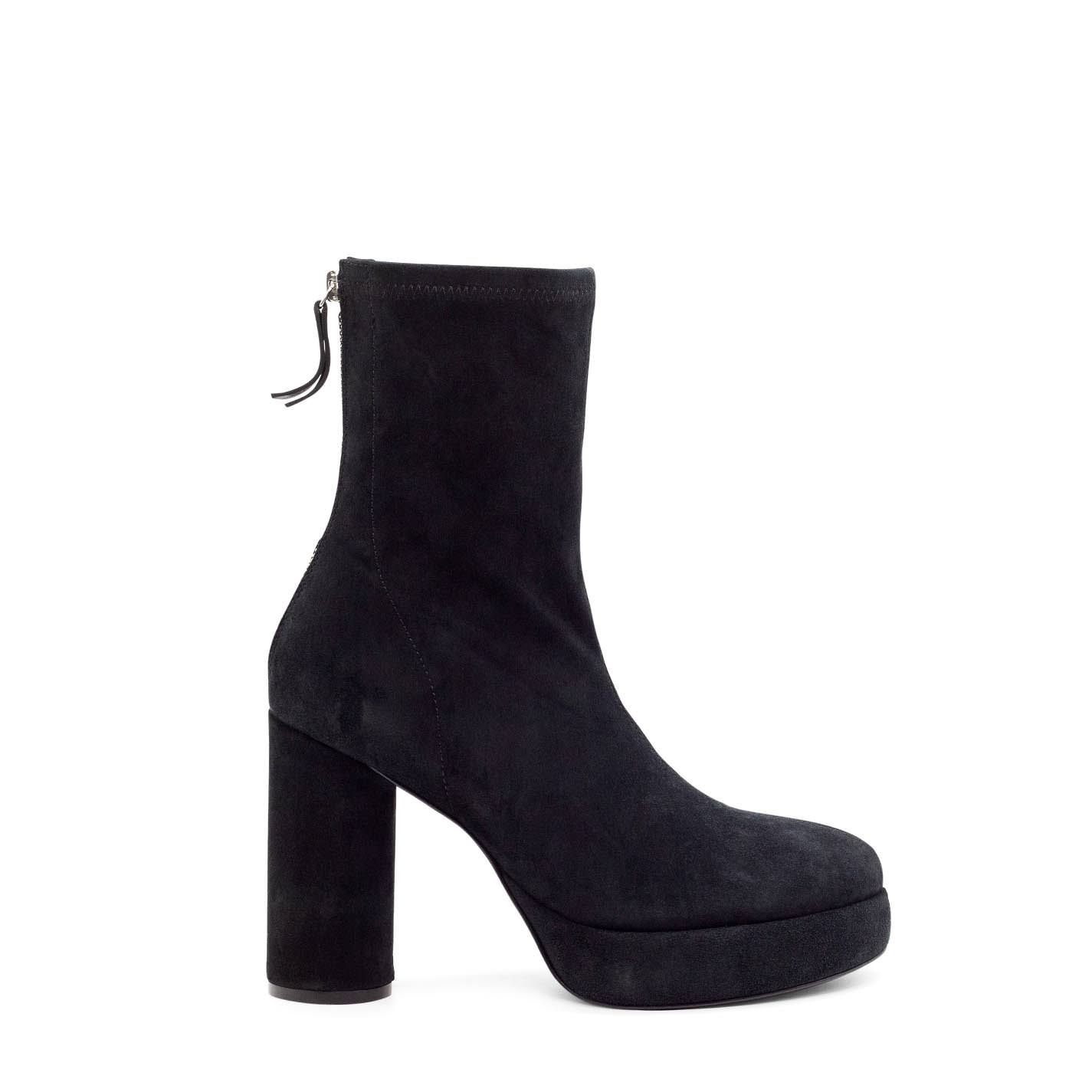 Ducky tronchetto stretch in crosta nera, slanciato ed aderente grazie al morbido materiale elasticizzato e sfoderato, facilmente calzabile tramite zip e tiretto in pelle. Forma arrotondata con Plateau e tacco cilindrico fasciati pelle in tinta, suola cuoio, piantina in tpu antiscivolo e sottopiede flex per un maggior comfort. Made in Italy.