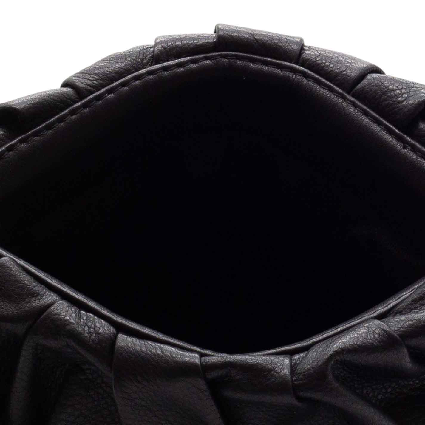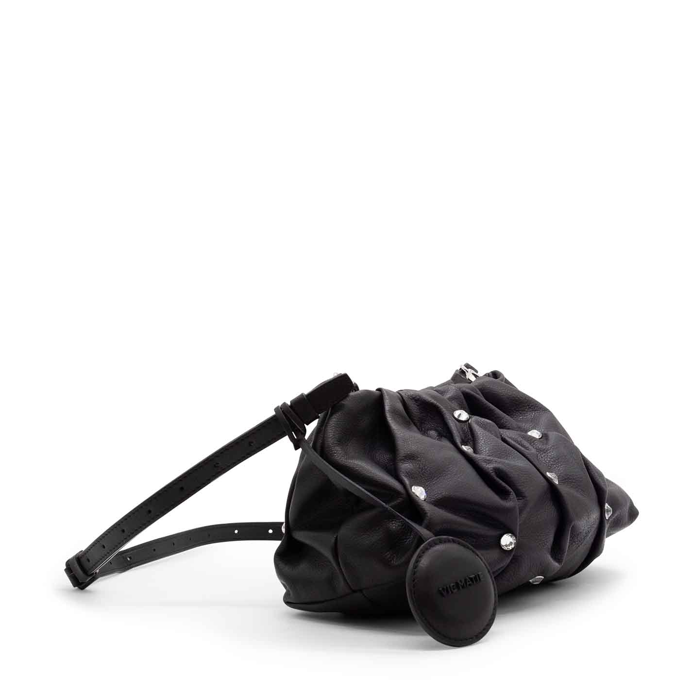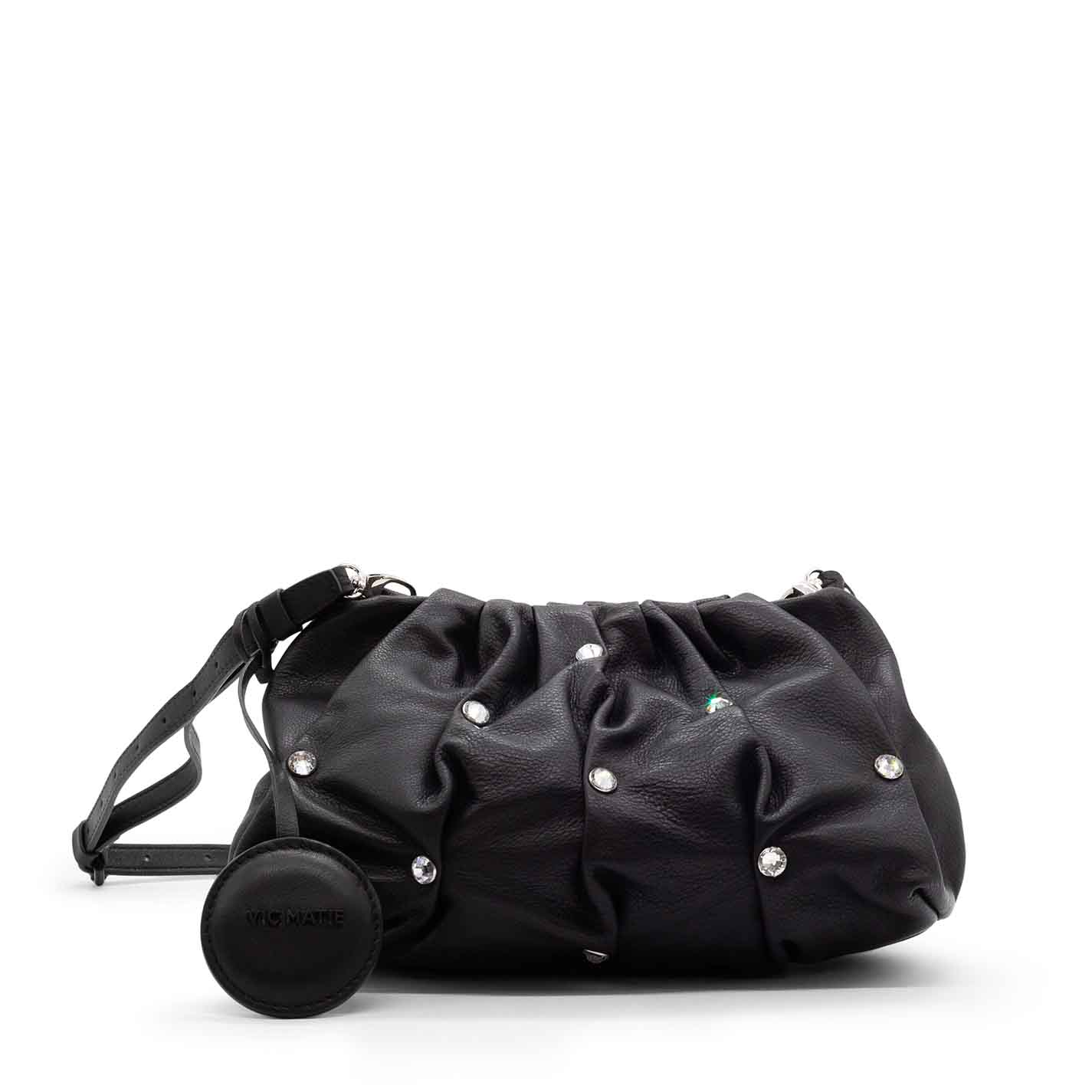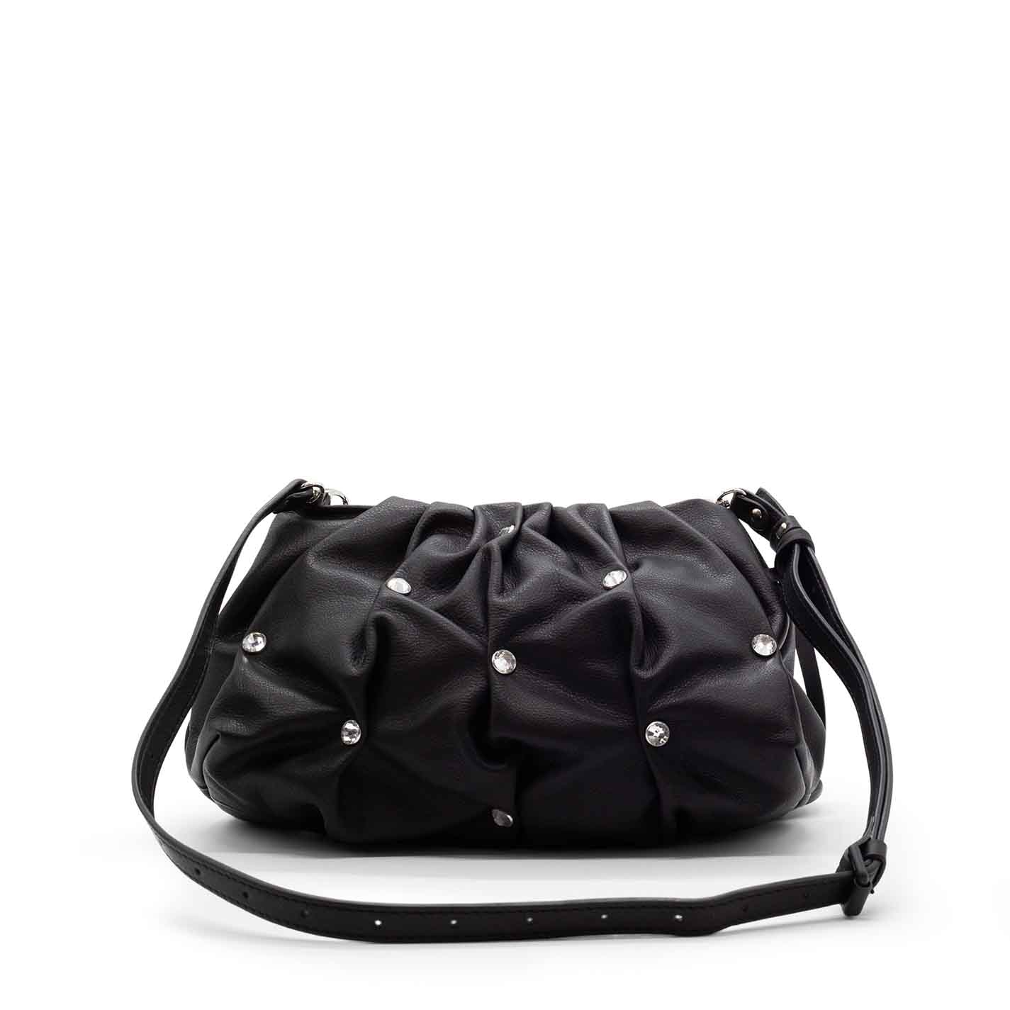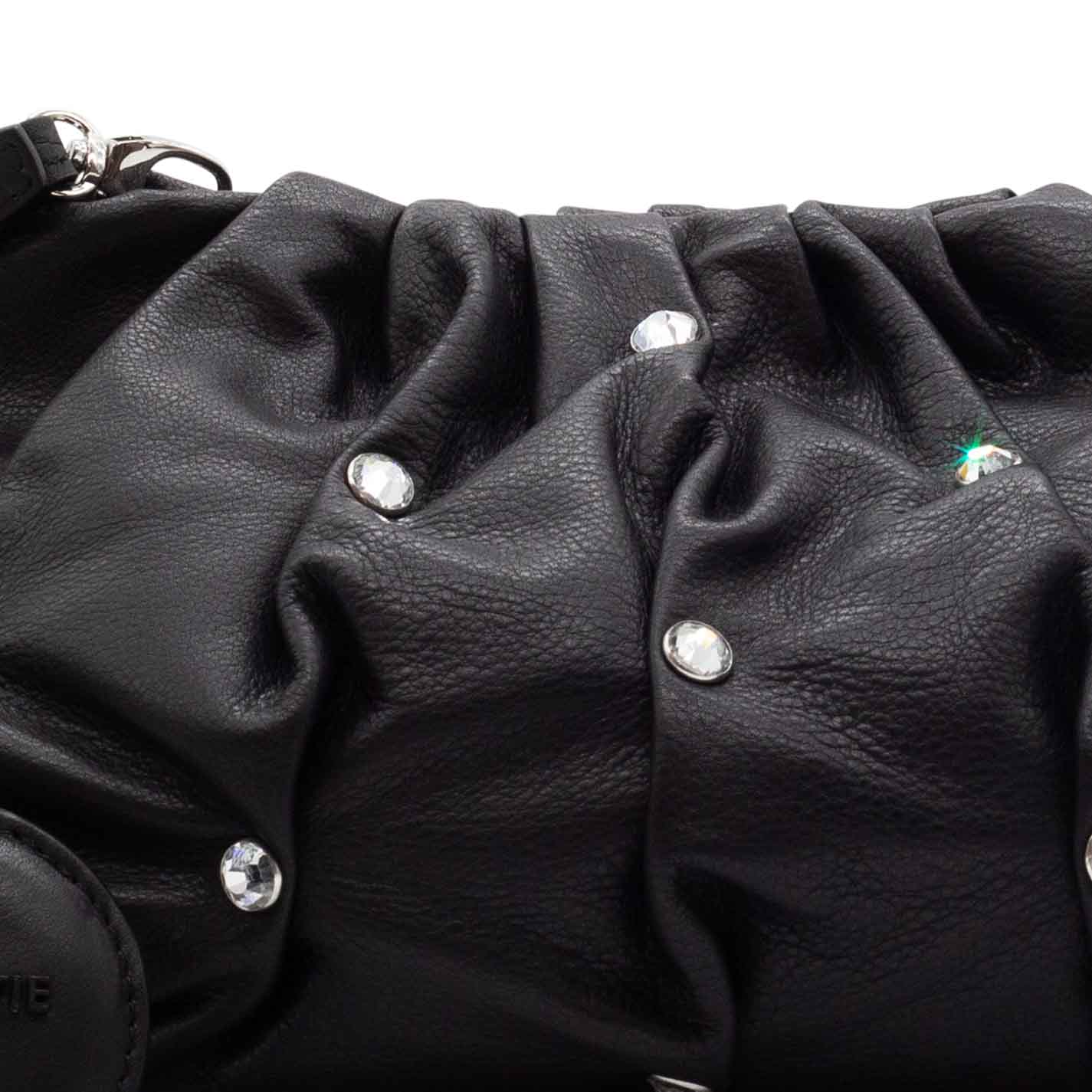 Tracollina strass nera realizzata in morbido vitello nappato con arricciature e pieghe bloccate da rivetti brillanti. Chiusura a molla interna e tracolla in pelle staccabile, specchietto ciondolo logato in dotazione