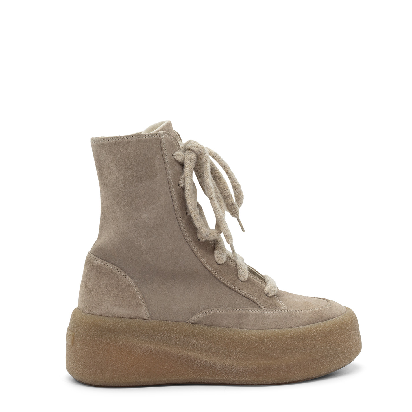 F04 Creepy-Tronchetto allacciato tortora in crosta di vitello, slanciato ed aderente, con lacci voluminosi in lana;