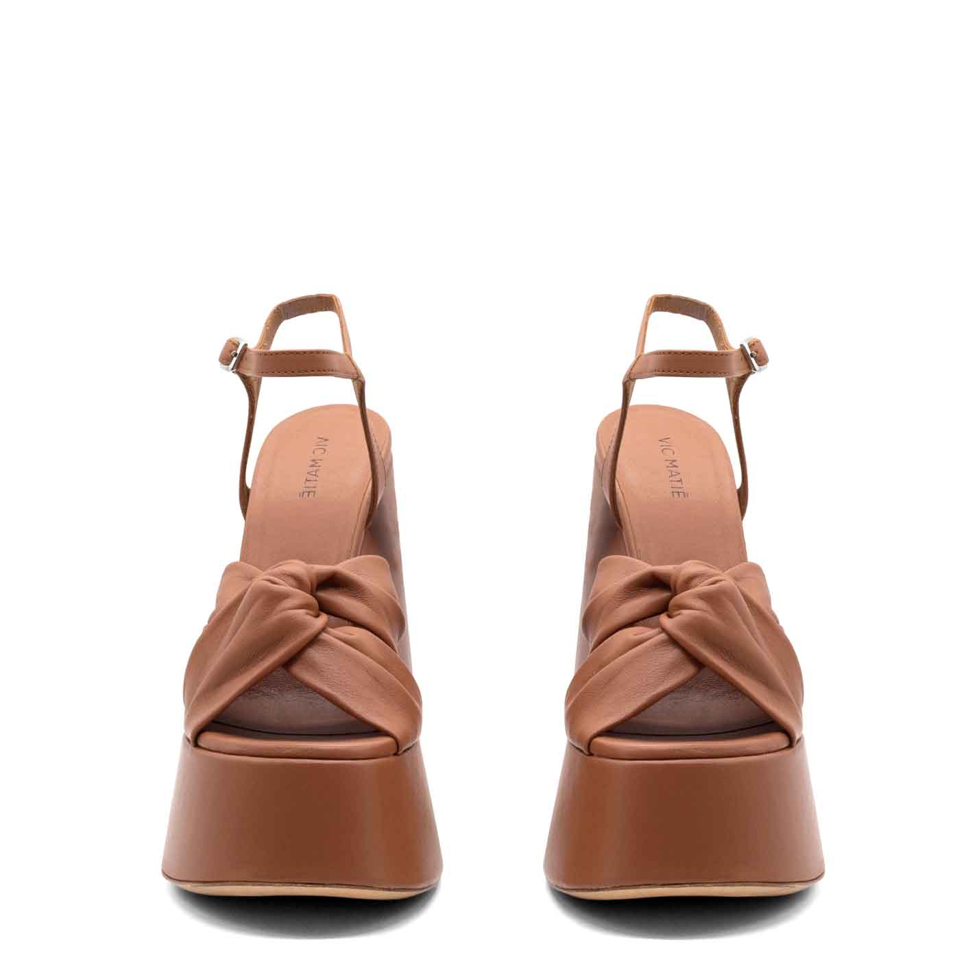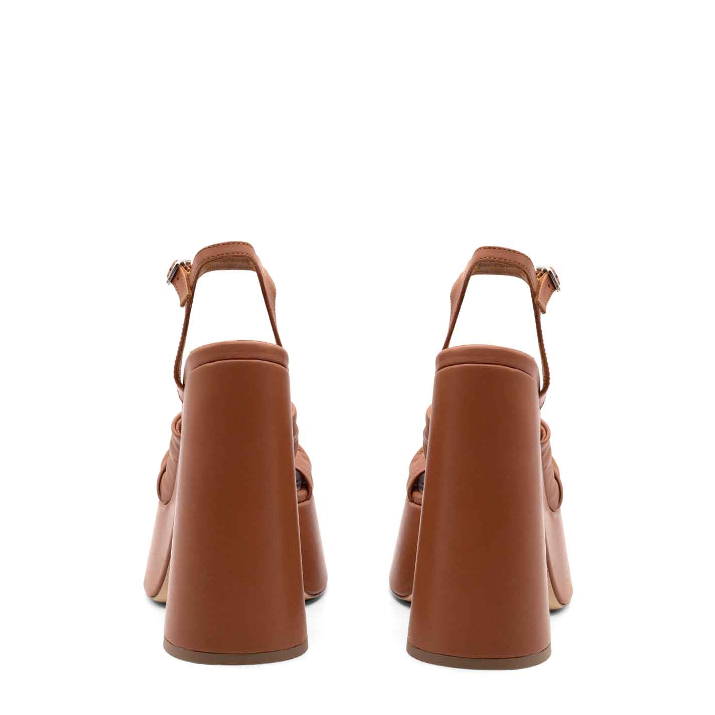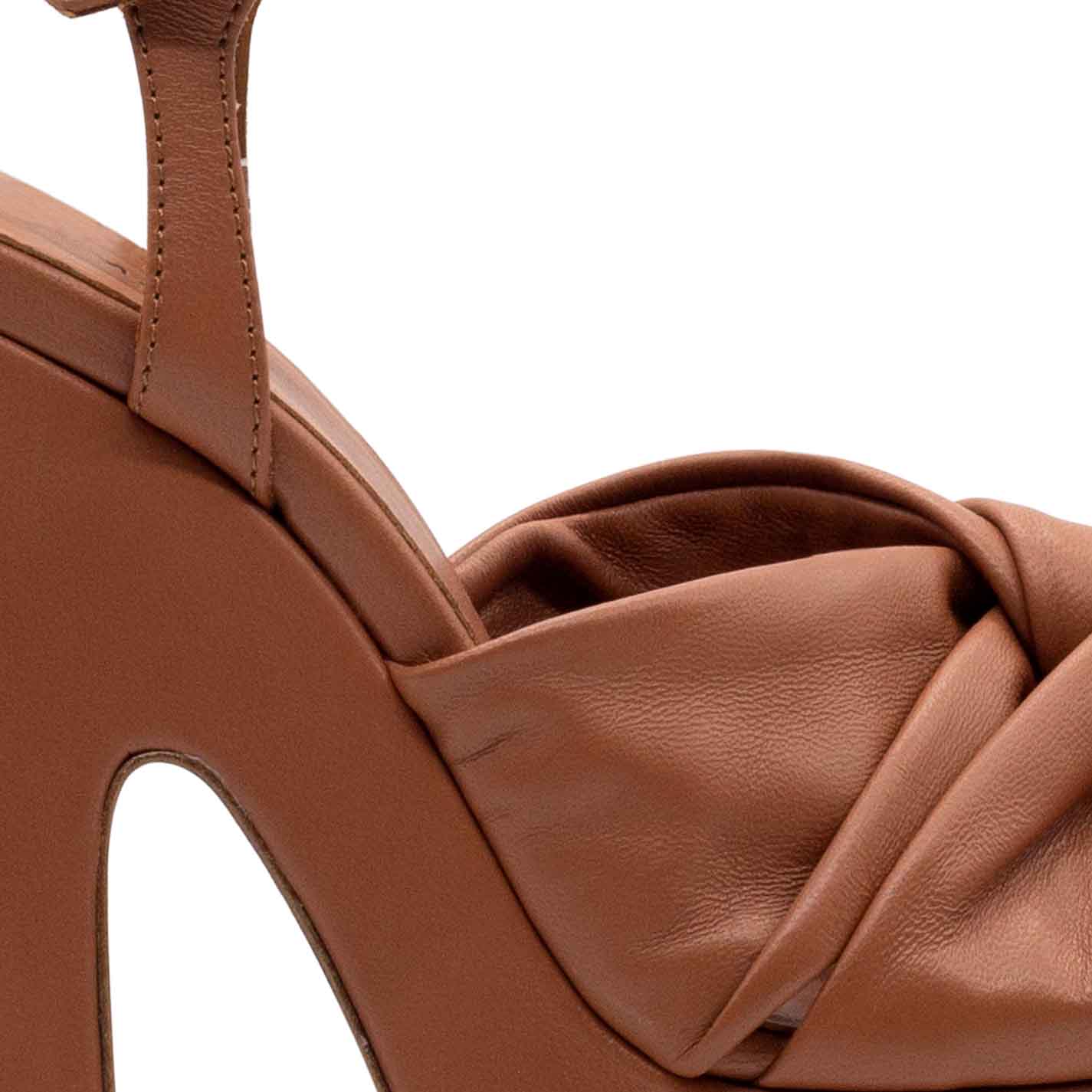 Flare sandalo fusciacca in morbida nappa terra di siena ,realizzato da fusciacche annodate sul davanti e cinturino regolabile alla caviglia. Suola in cuoio ,plateau monoblocco ricoperto pelle dalla linea "scampanata". Made in Italy.