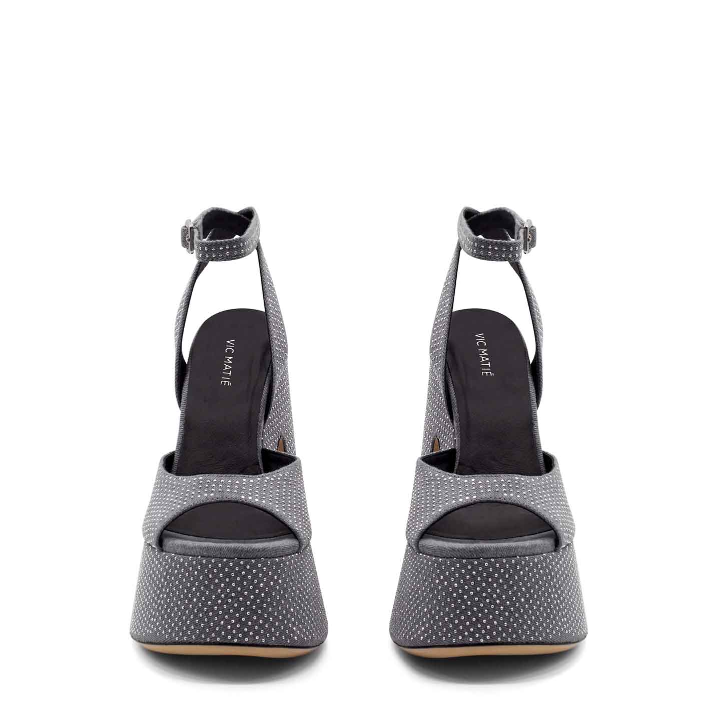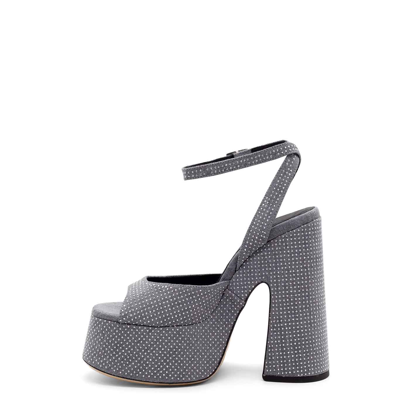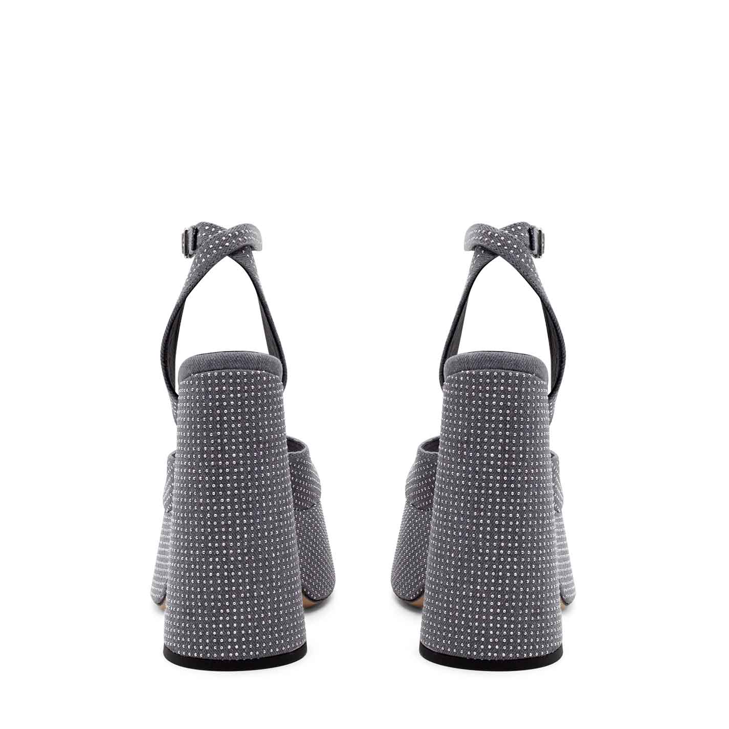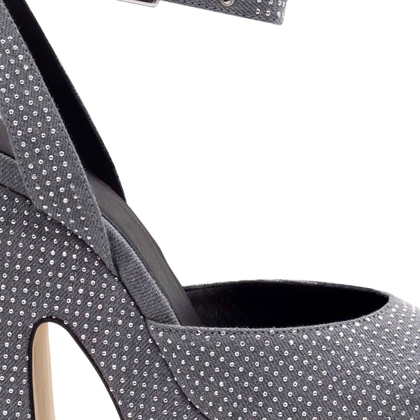 Flare sandalo microborchie in denim lavato grigio ,interamente tempestato da microborchie argento;