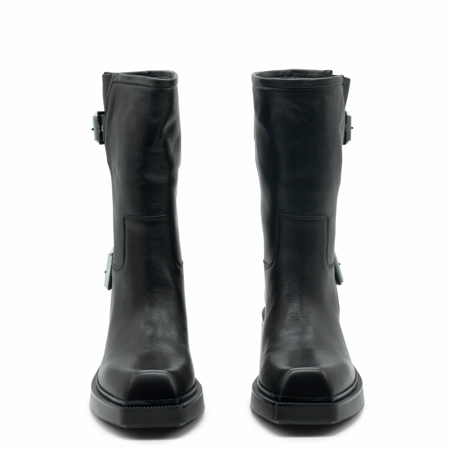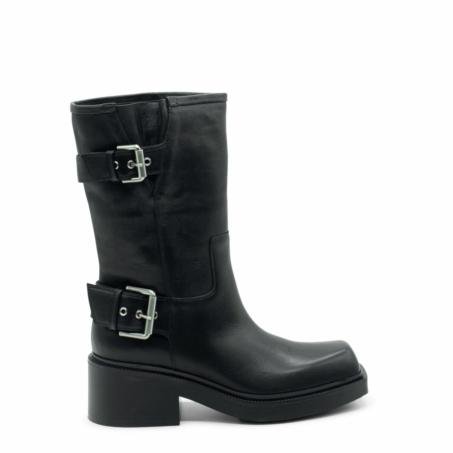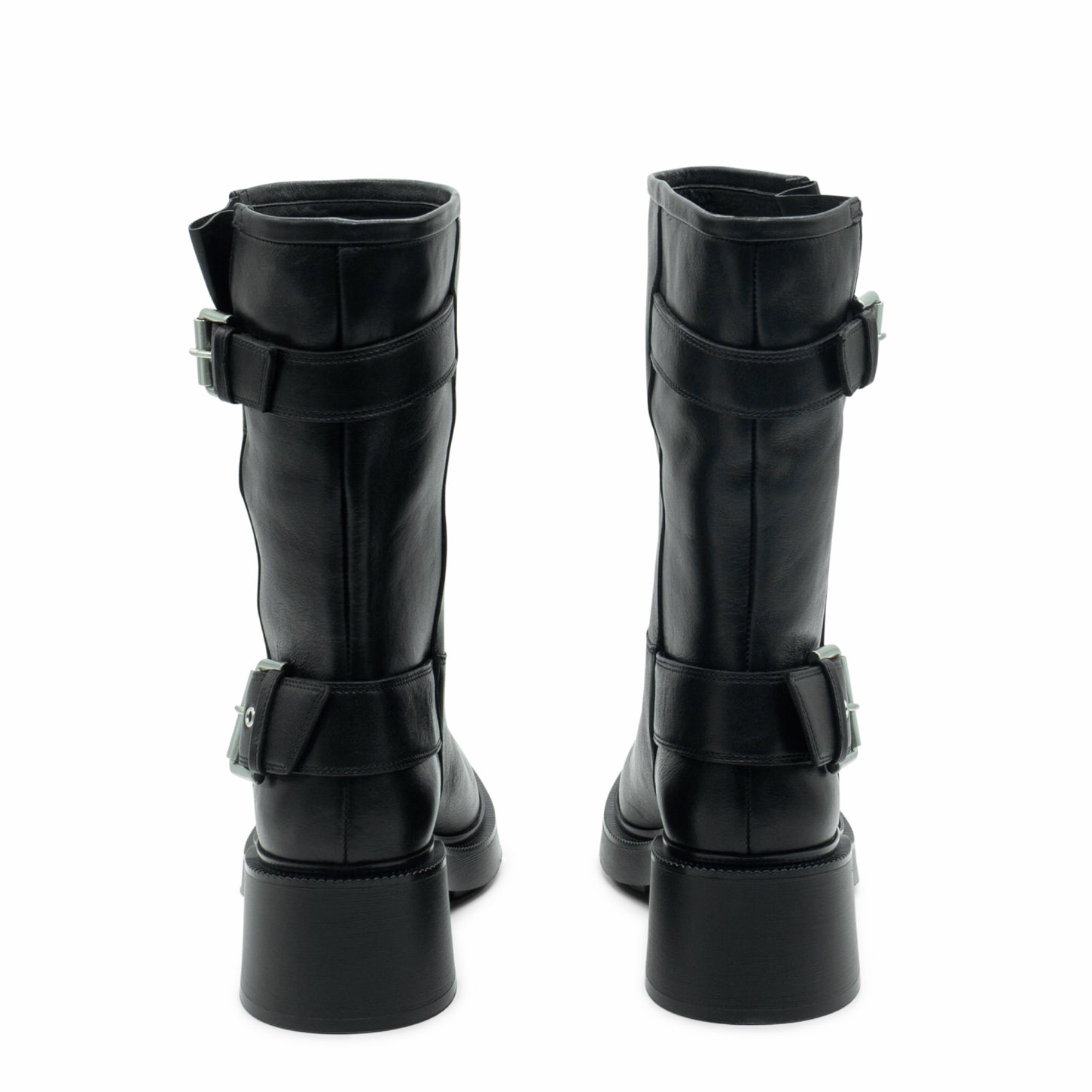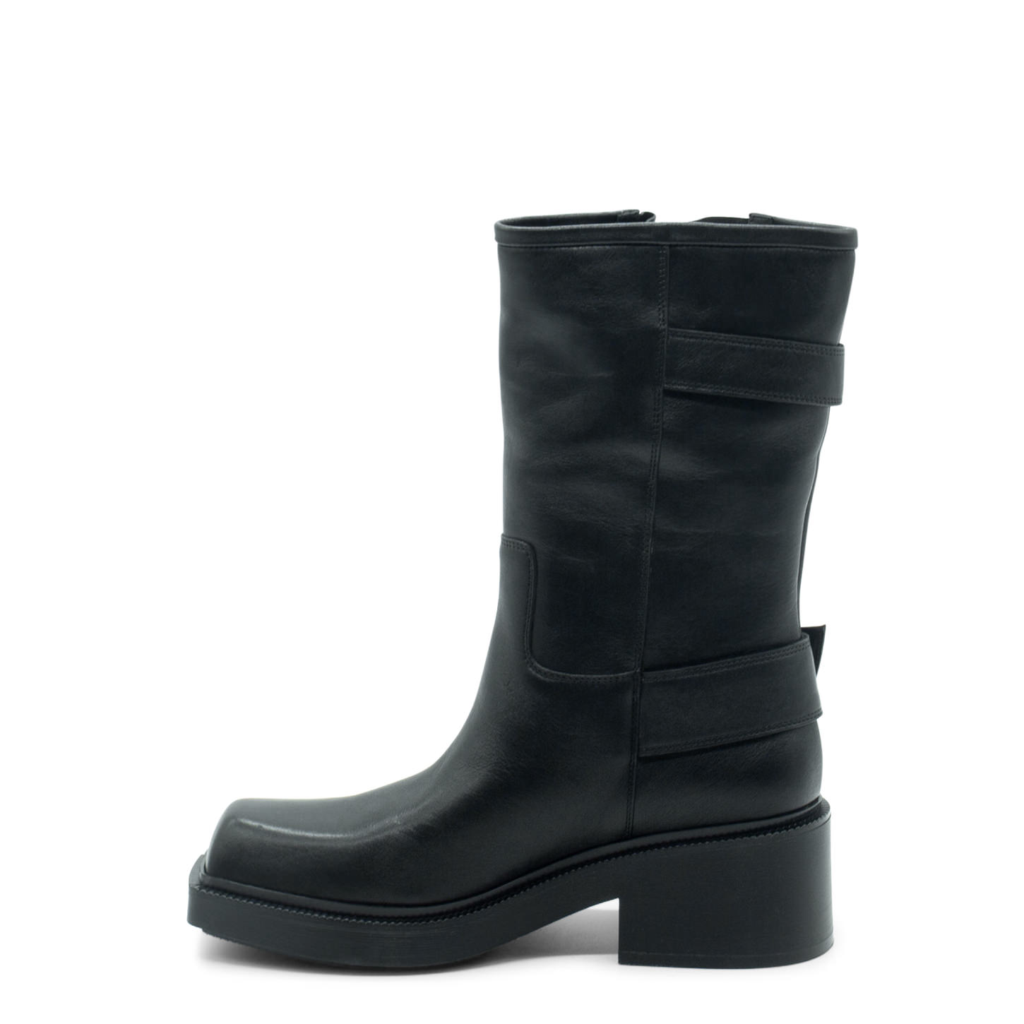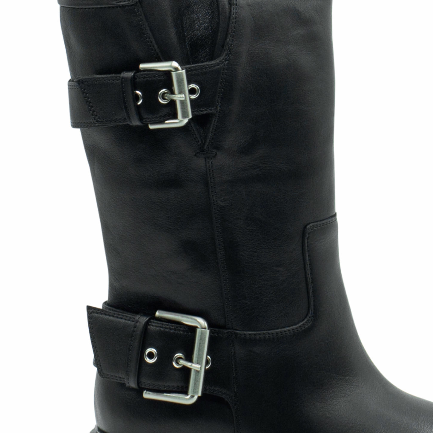 Fray biker nero in pelle di vitello semilucida, con cinturini regolabili da fibbie metalliche. Morbido plantare ricoperto pelle. Made in Italy.
