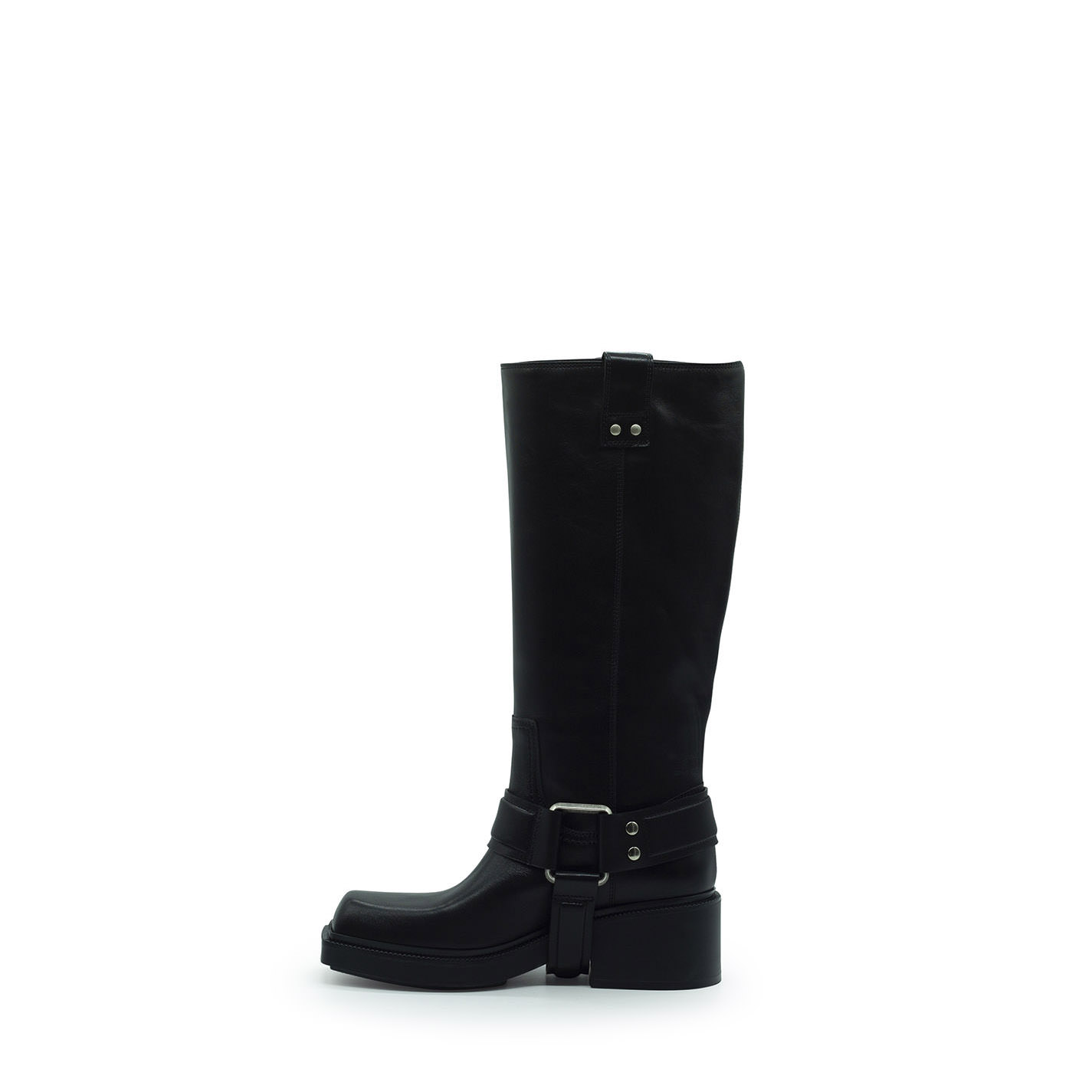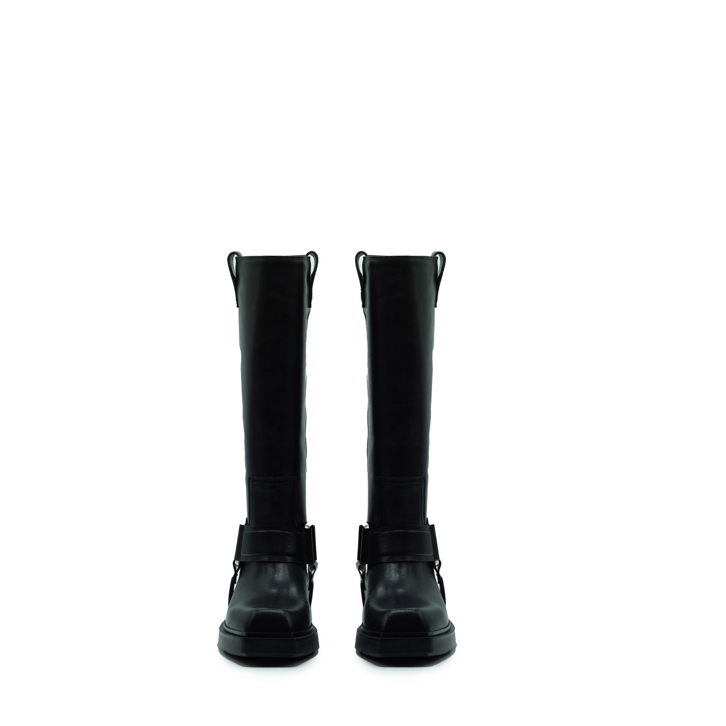 Fray stivale gaucho nero in pelle di vitello lucido, con cinturone estraibile con anelli squadrati e logati con motivi bombè.Suola importante in gomma con battistrada antiscivolo. Morbido plantare ricoperto pelle. Made in Italy.